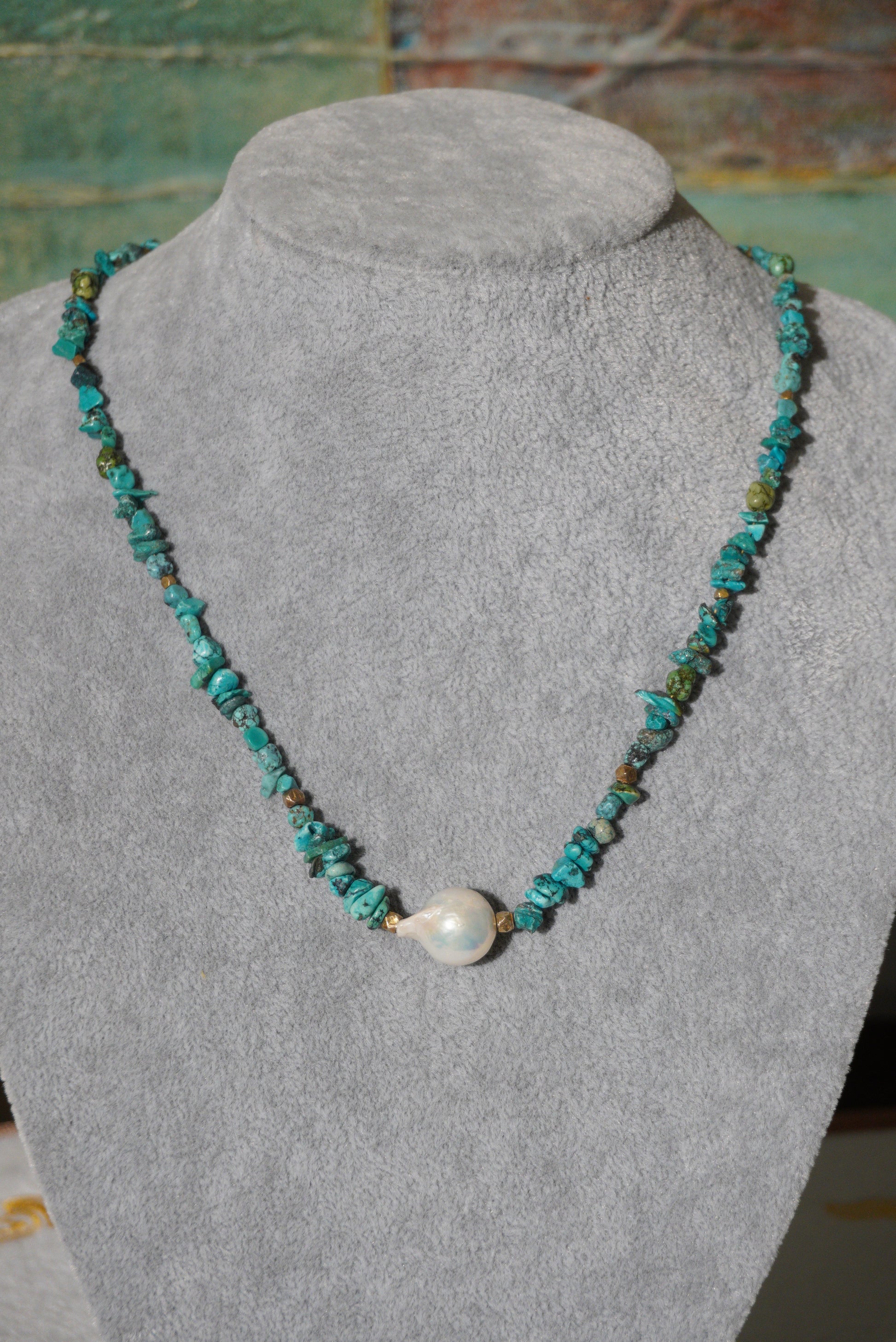 Naszyjnik turkus, perła, srebro pozłacane 925