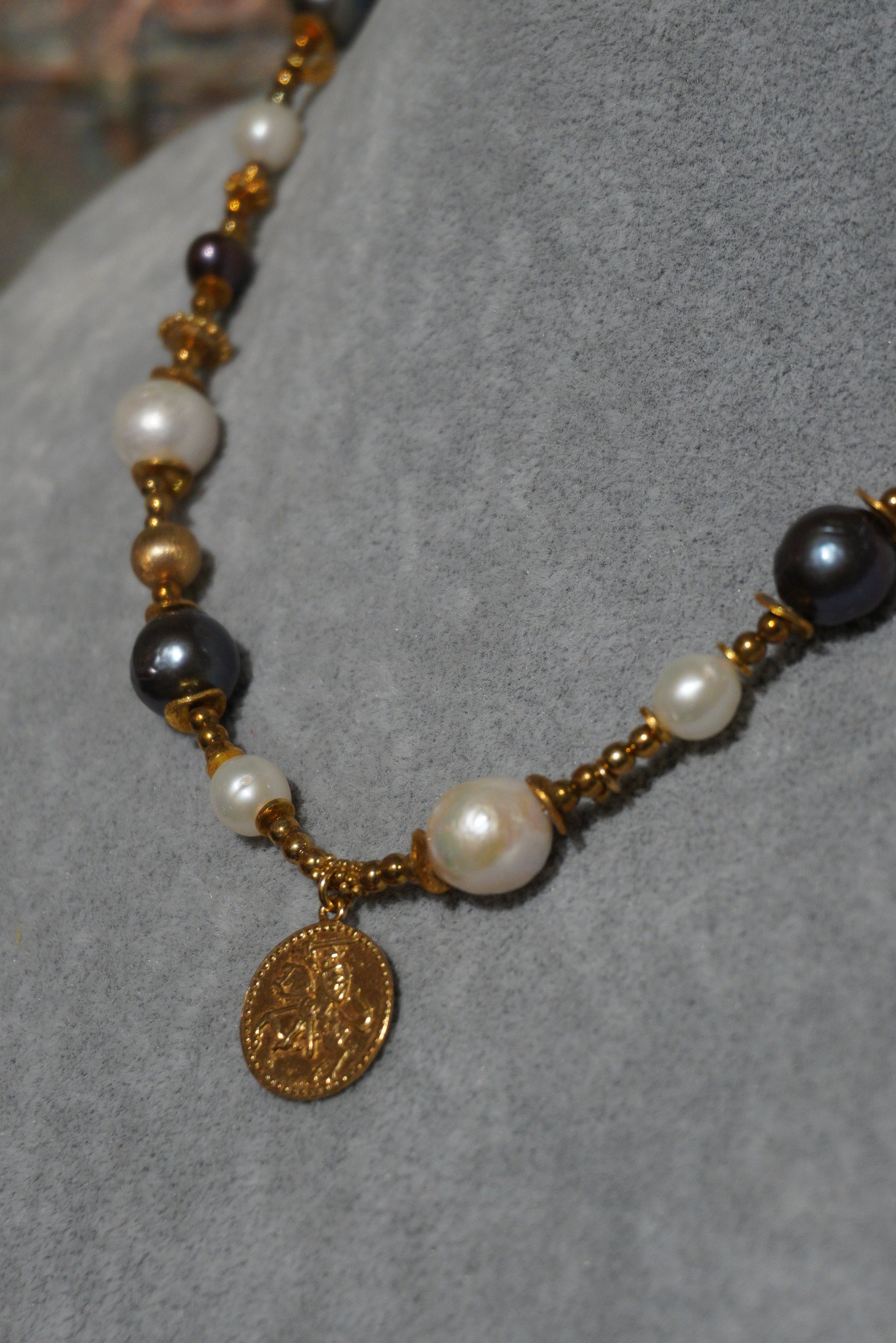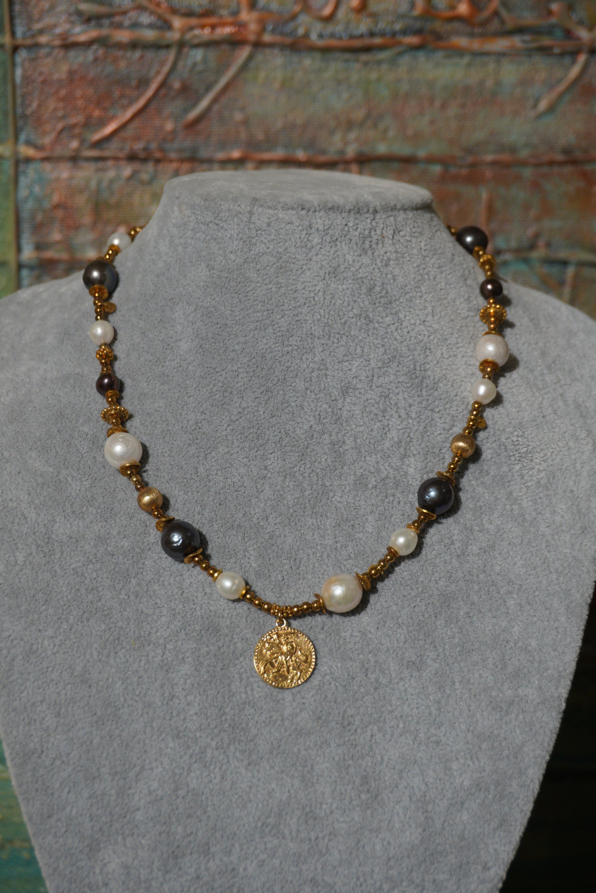 Naszyjnik perła biała, bakłażanowa, z medalionikiem pozłacanym, przekładki ze srebra pozłacanego. Możliwość zakupienia bransoletki do kompletu.