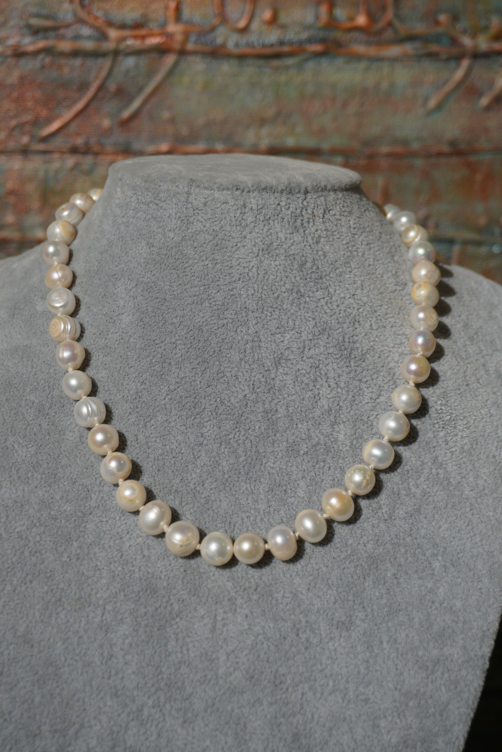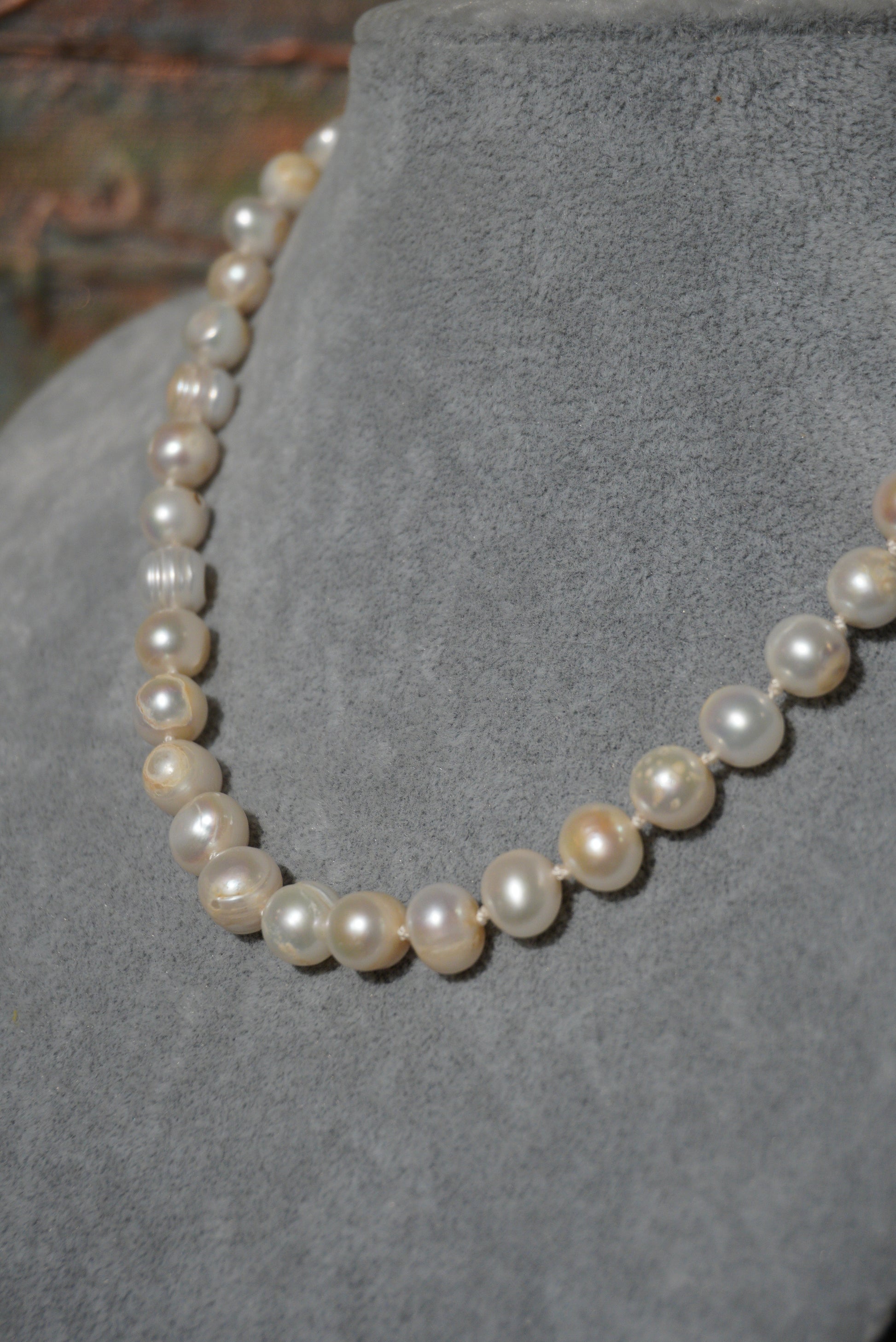 Krótki naszyjnik z białych pereł supełkowanych, hodowlanych, zapięcie srebro pozłacane.