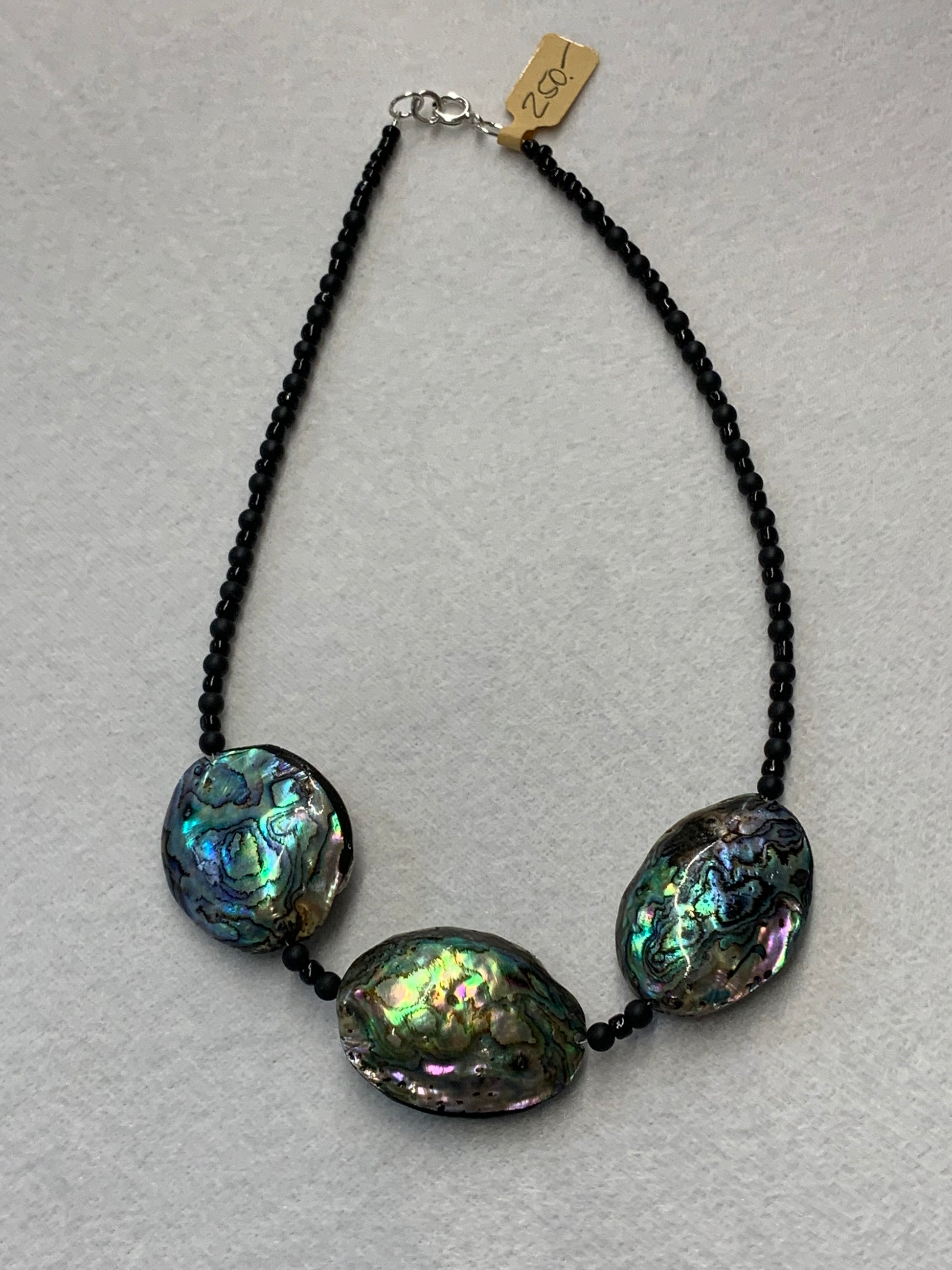 Naszyjnik z onyksu i zawieszek z muszli w odcieniach zieleni.