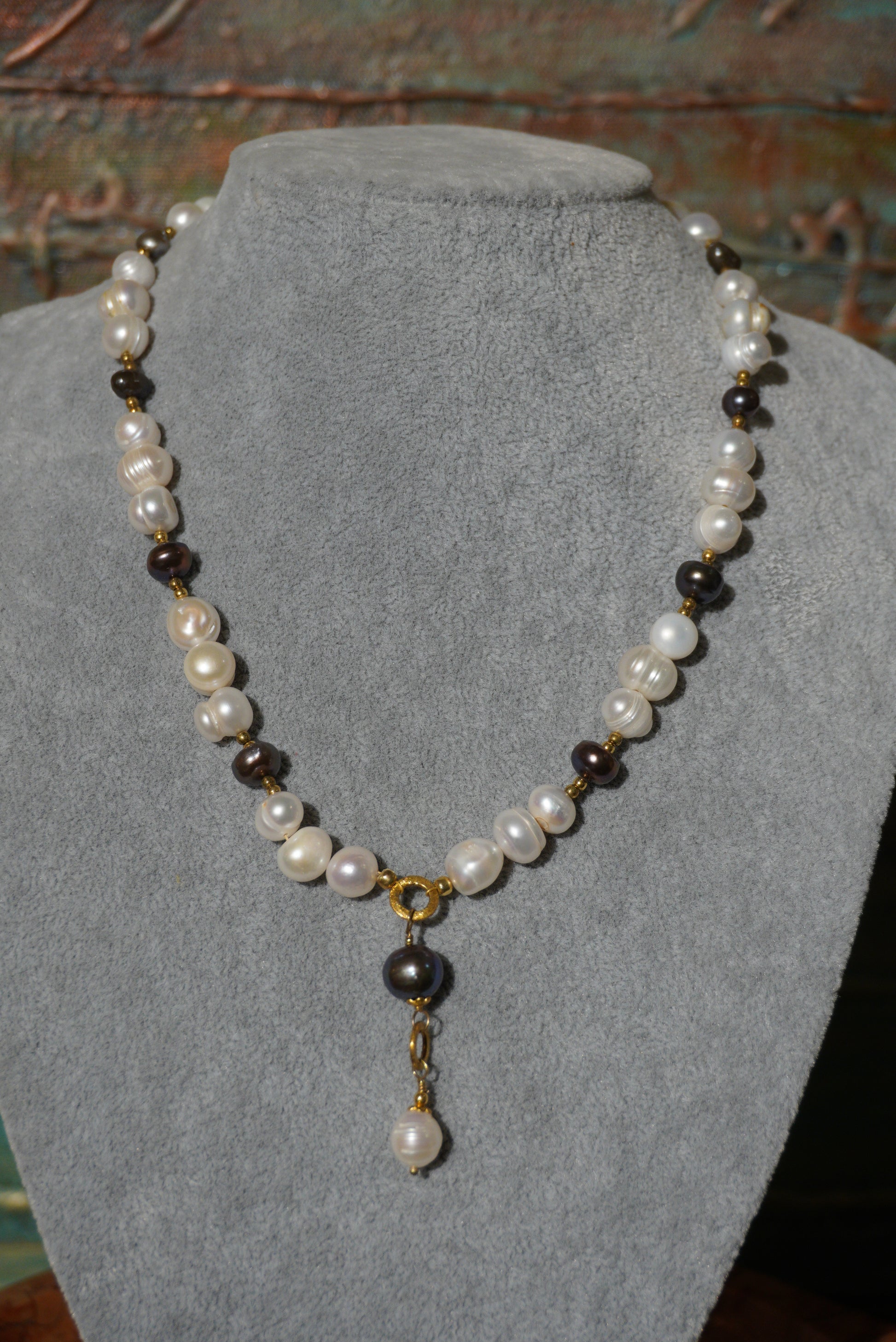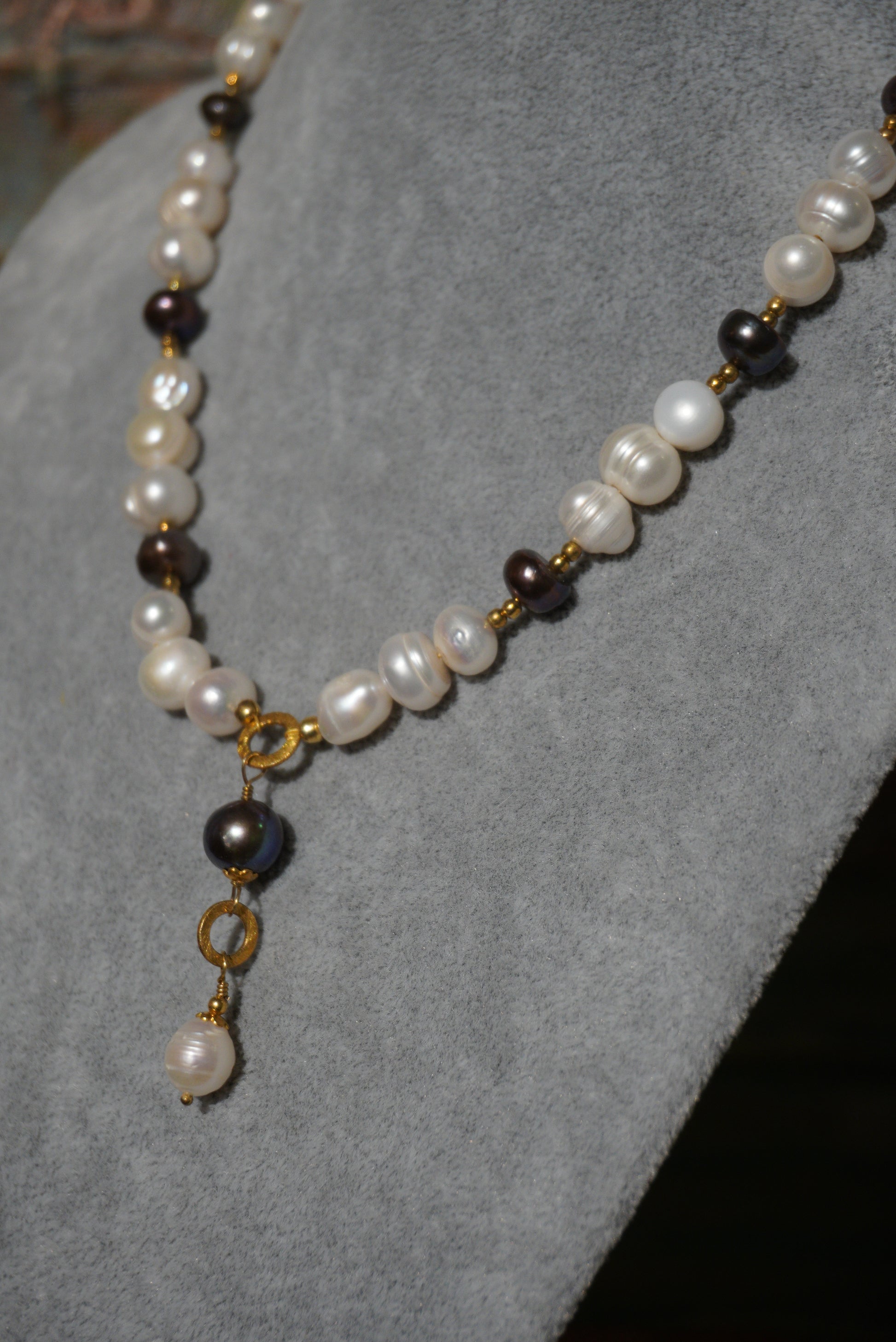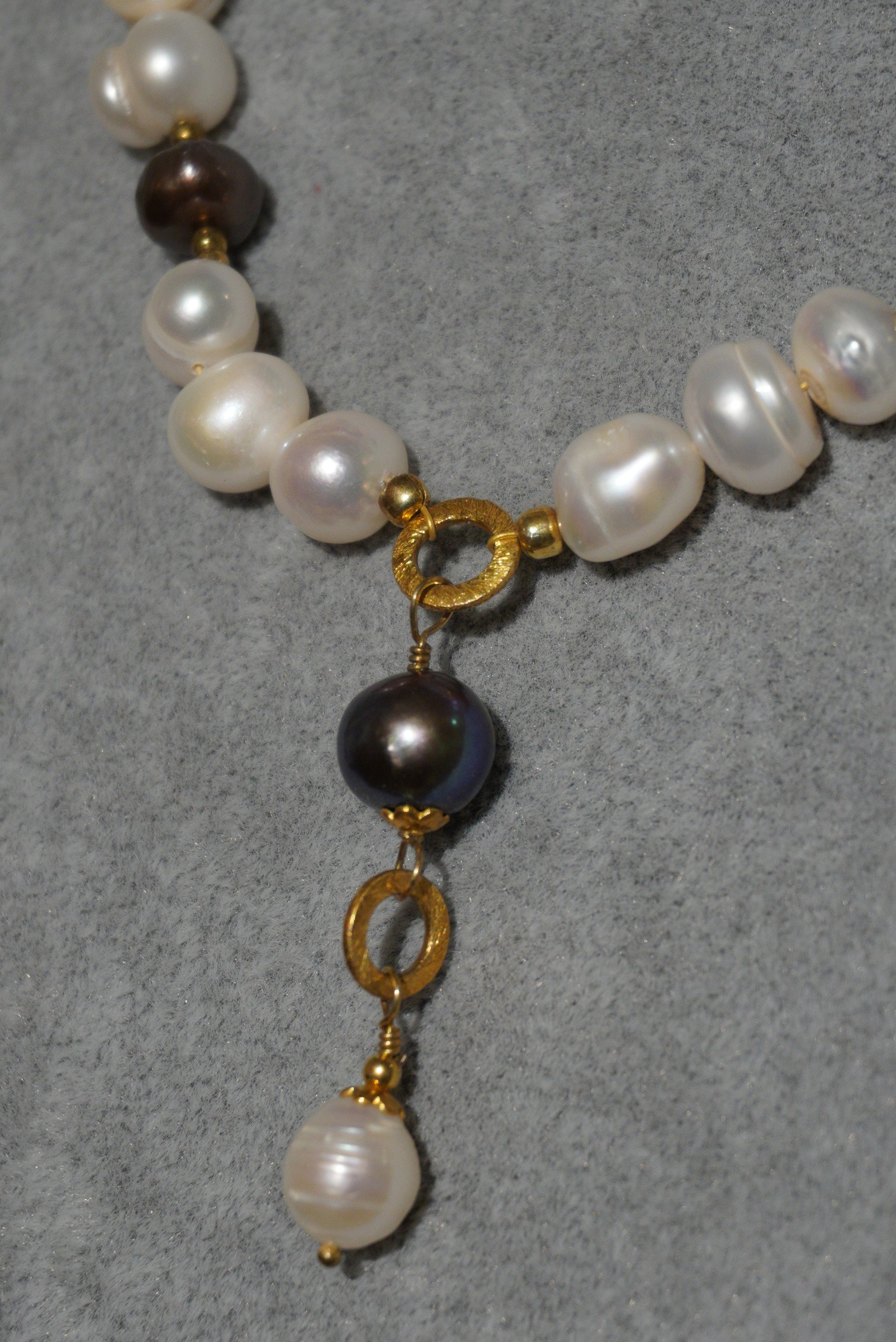 Krótki naszyjnik z pereł hodowlanych w kolorze białym, bakłażanowym, zapięcie srebro pozłacane, wisior z pereł i kółek pozłacanych.