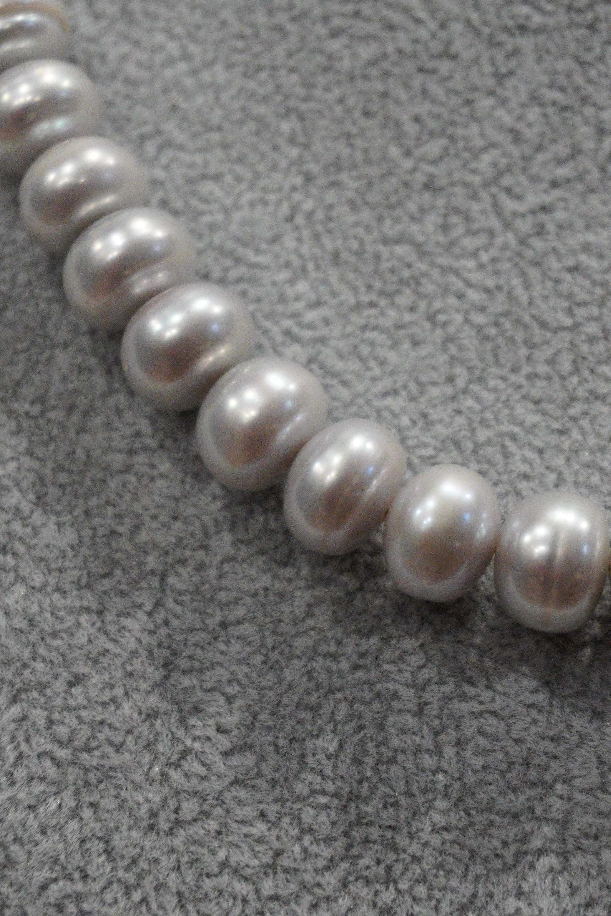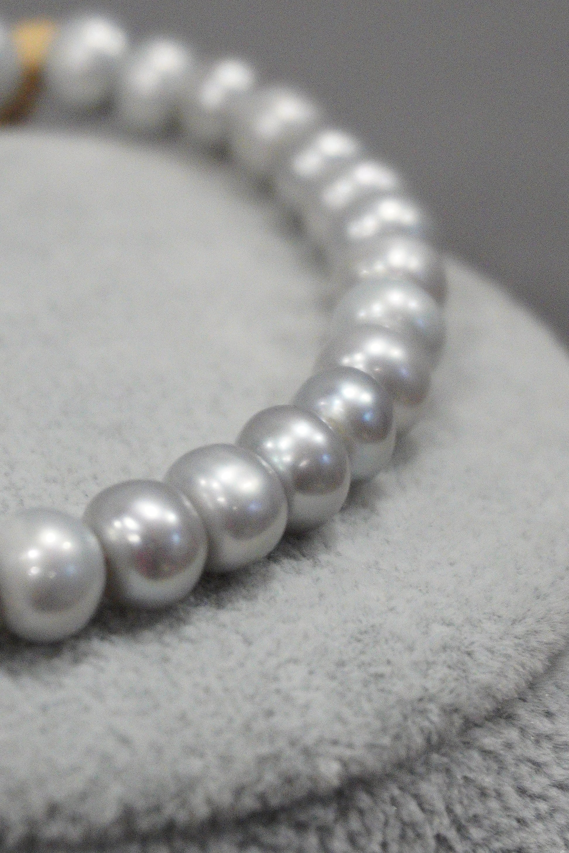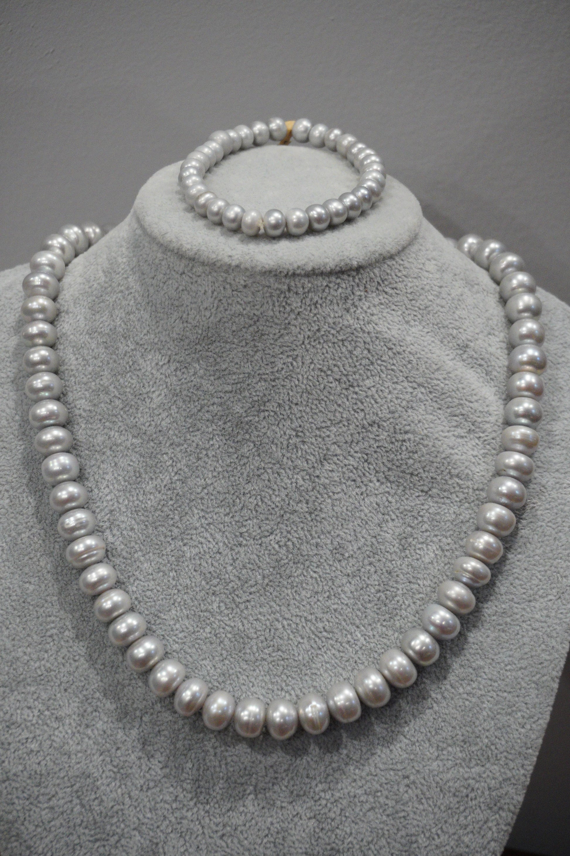 Naszyjnik z dużej perły hodowlanej w szarym kolorze, w komplecie bransoletka.