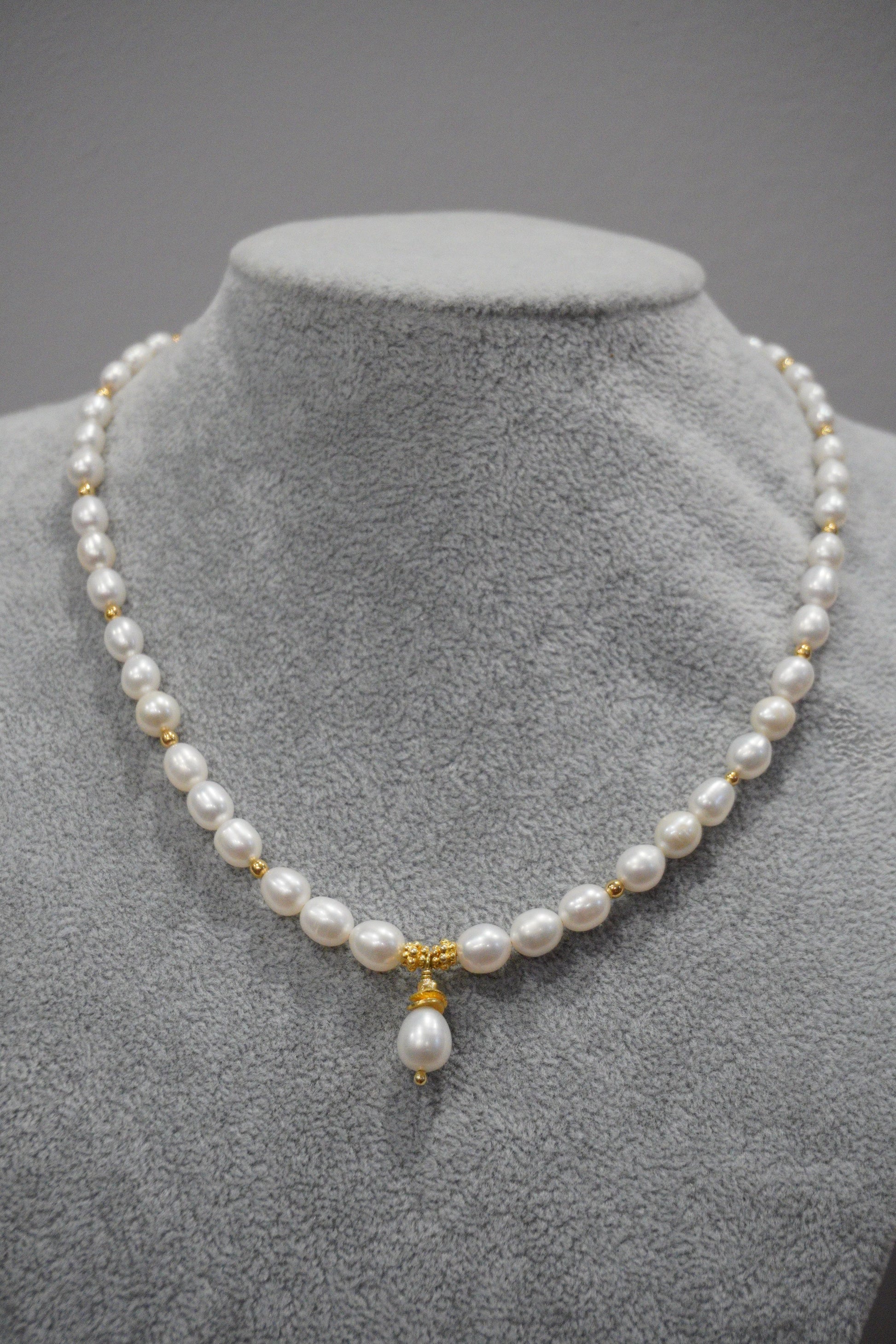 Delikatny naszyjnik z pereł hodowlanych z zawieszką, srebro pozłacane.