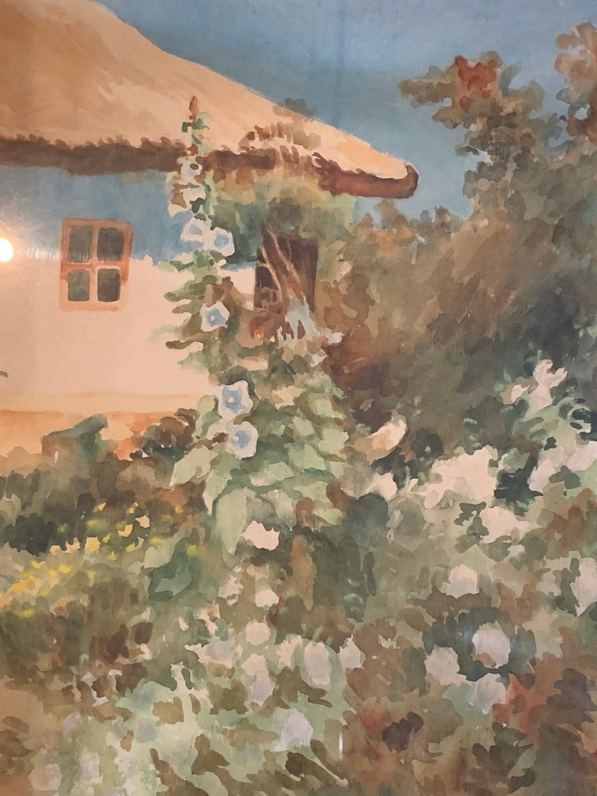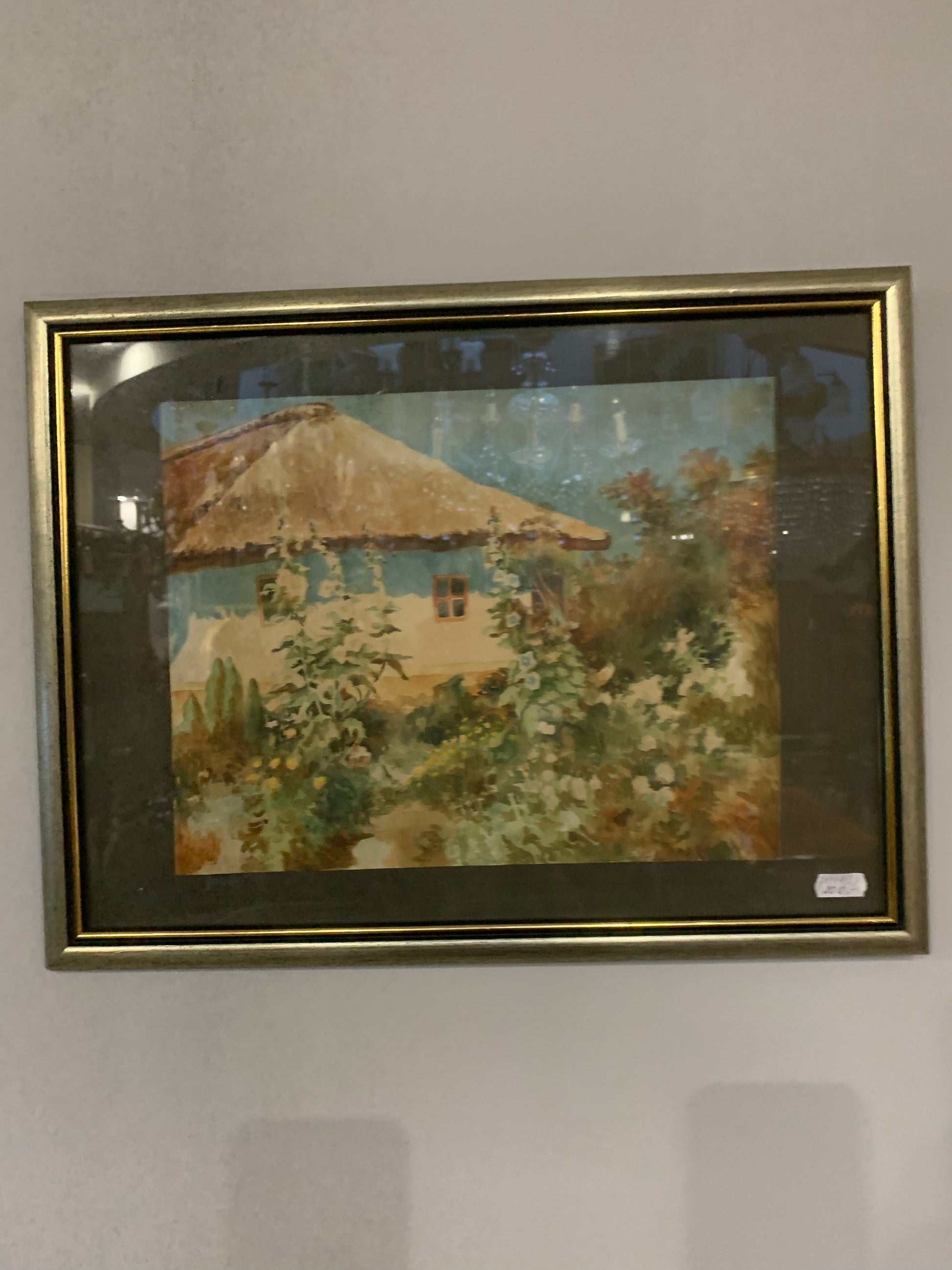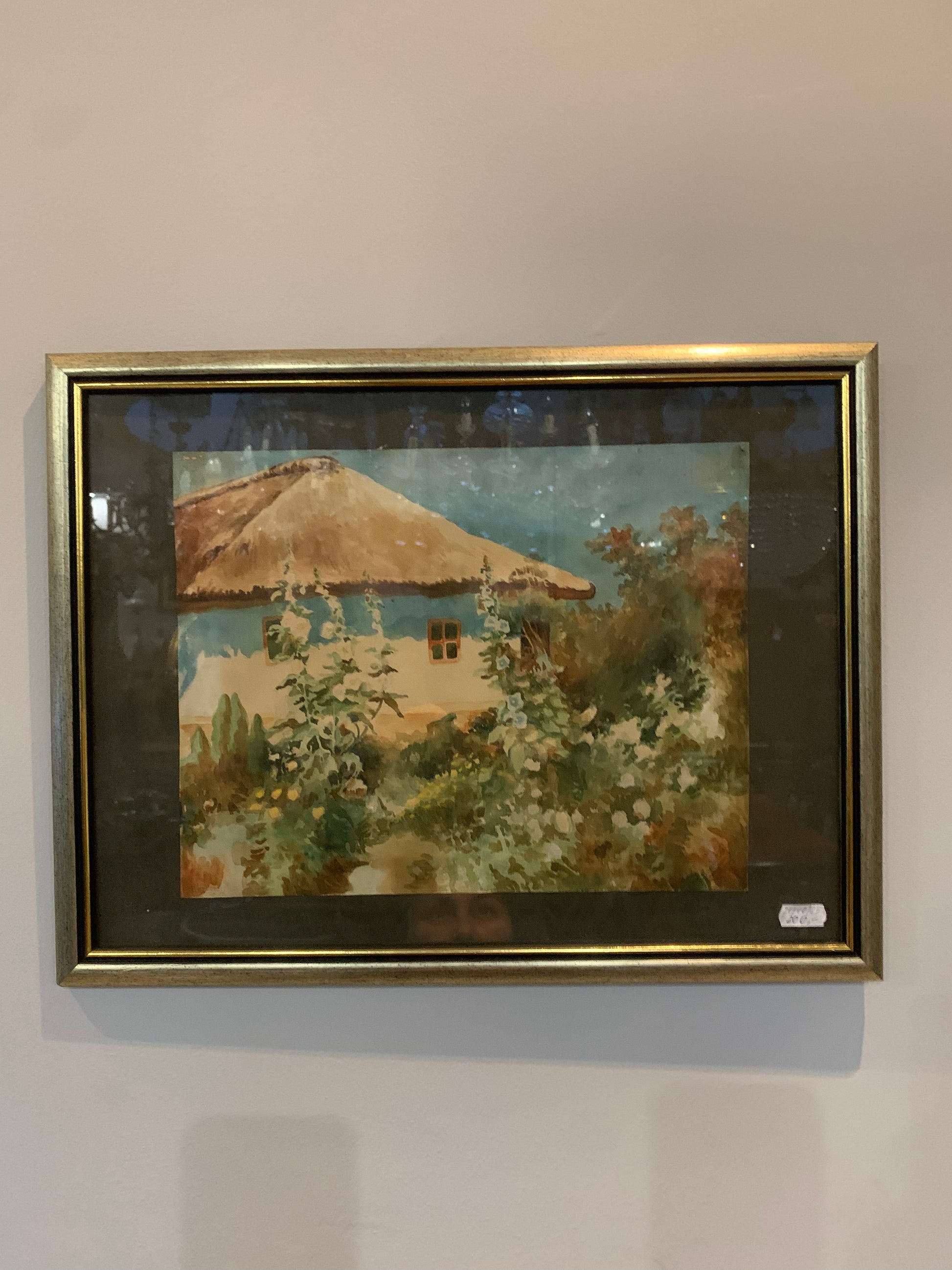 Obraz akwarela wiejska chata, oprawiona w drewnianą ramę.