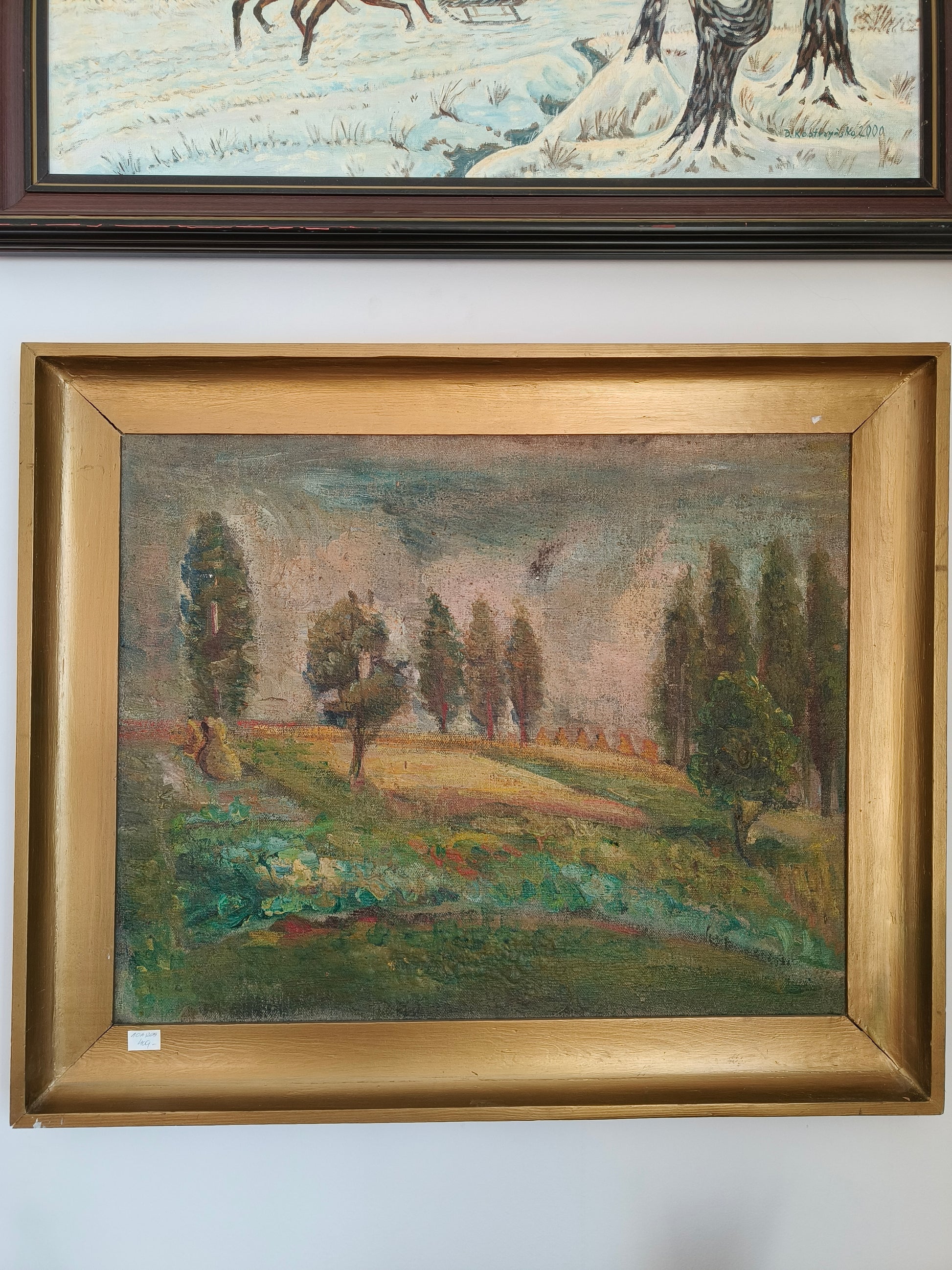 Obraz duży, pejzaż, przedwojenny, olej na płótnie, oprawiony w starą, drewnianą ramę w kolorze złota.