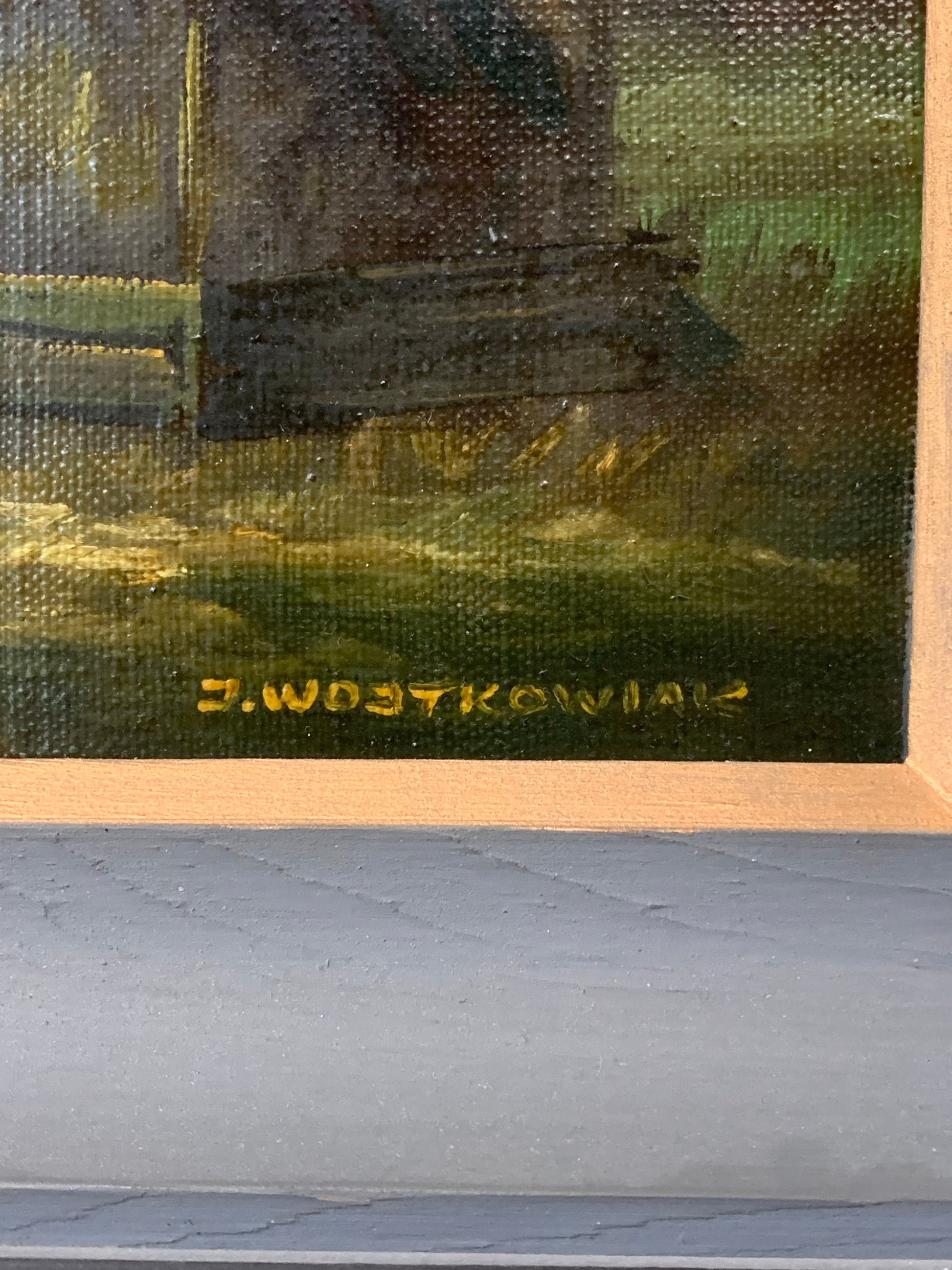 Obraz, pejzaż "Stóg siana" J. Wojtkowiak w drewnianej ramie. Technika: olej na płótnie.