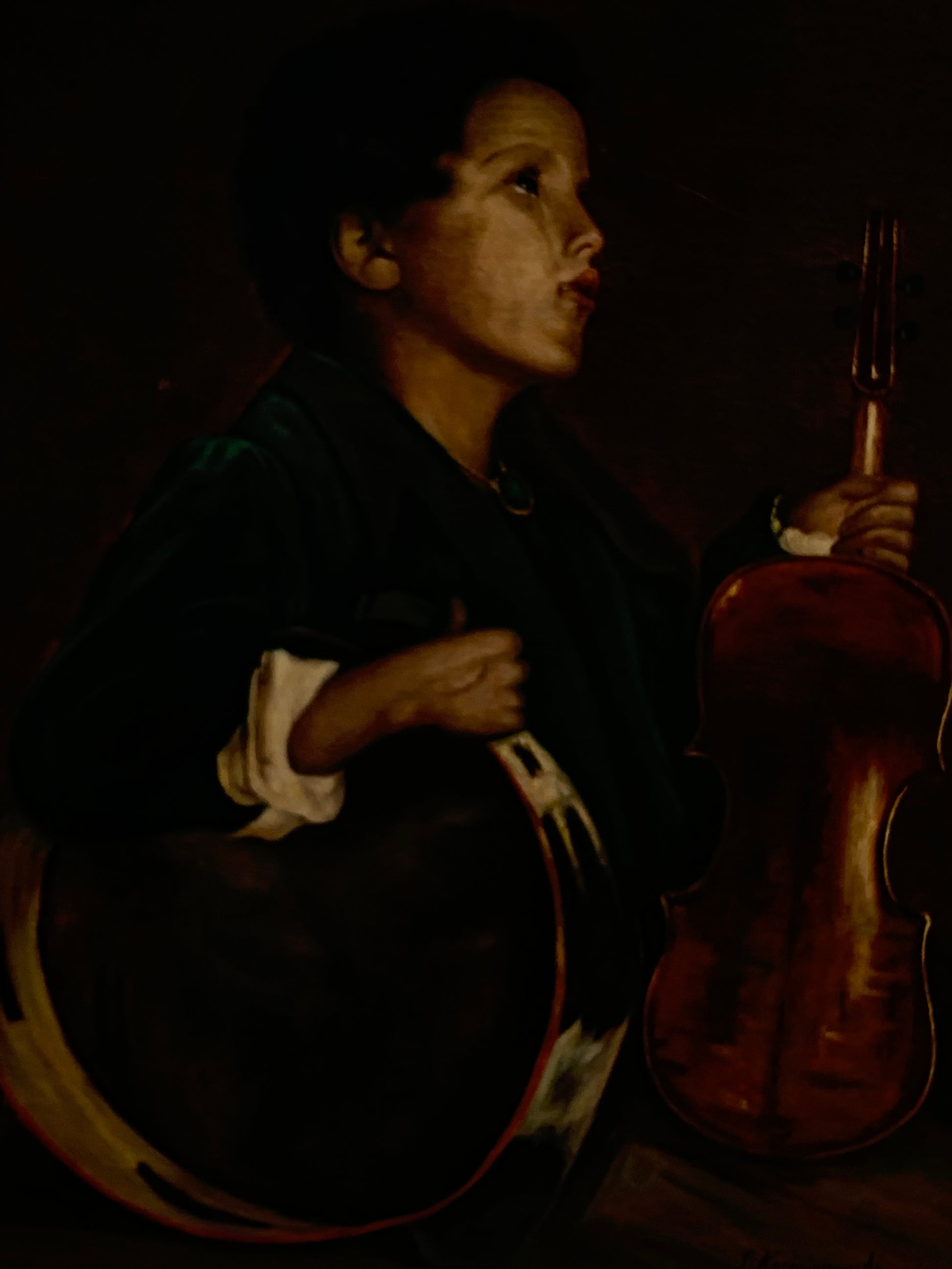 "Chłopiec ze skrzypcami i tamburynom" - obraz polskiego malarza K. Kazimierskiego wzorowany na dzieło włoskiego malarza Antonio Mancini (1852-1930).