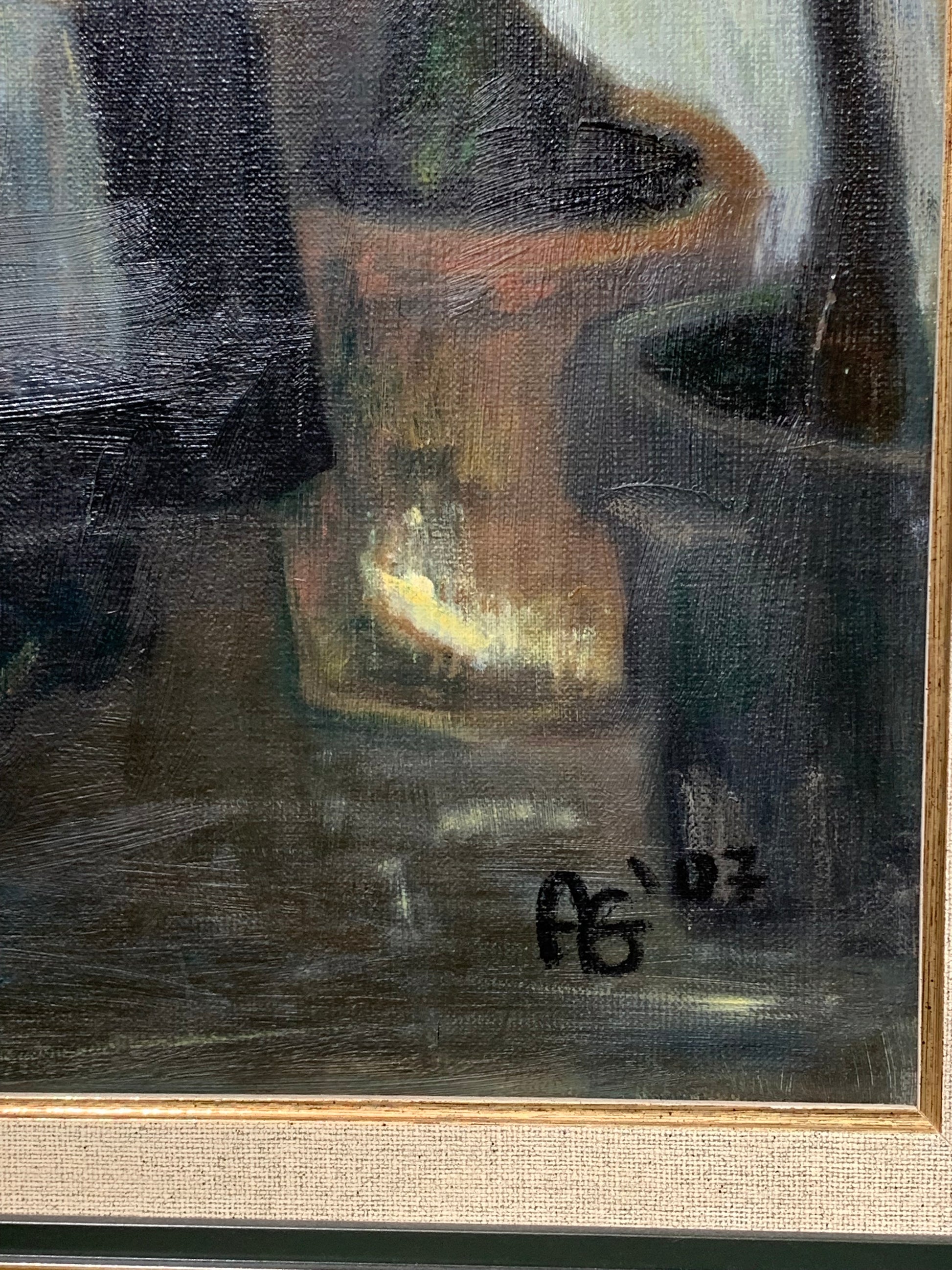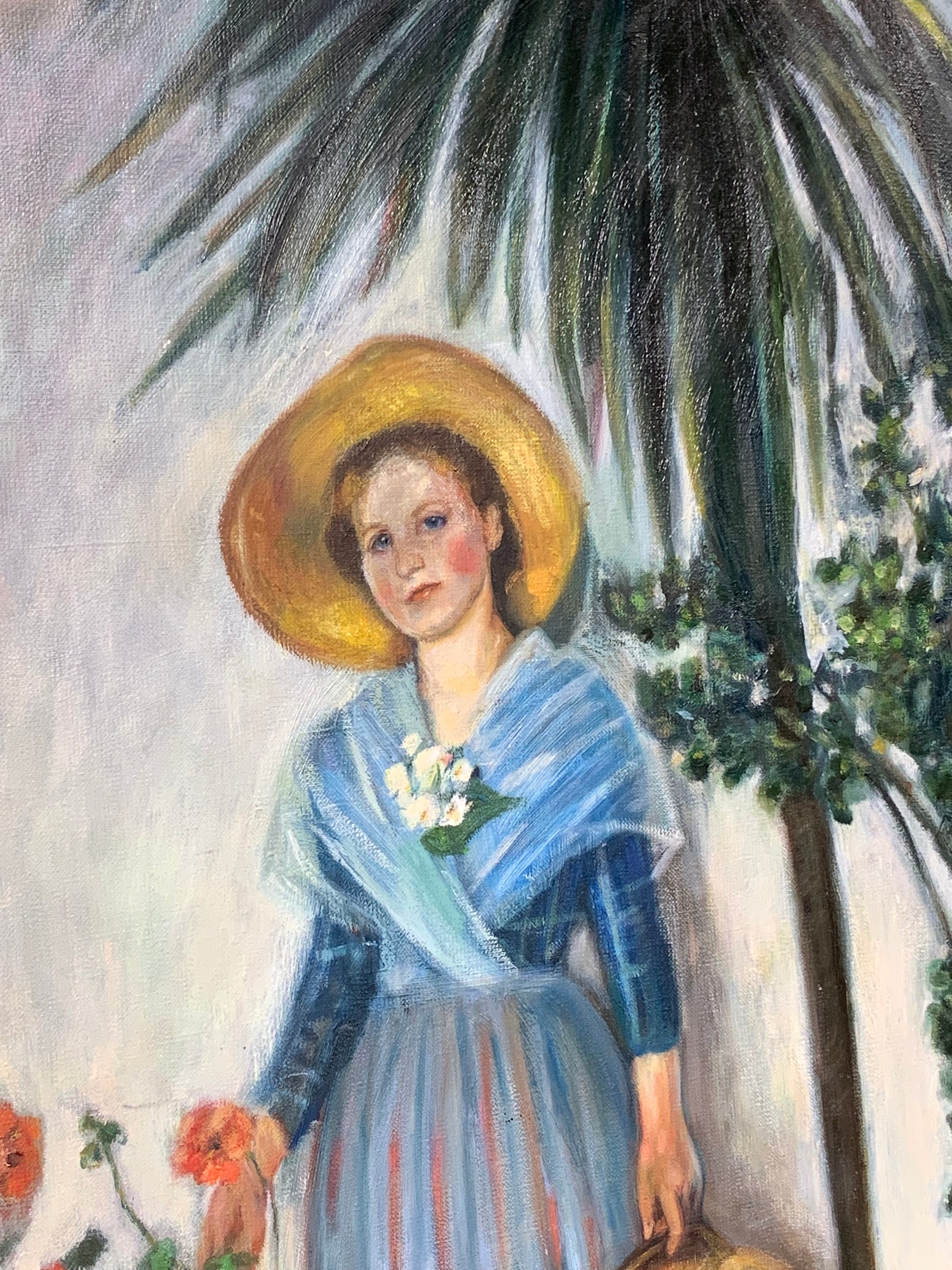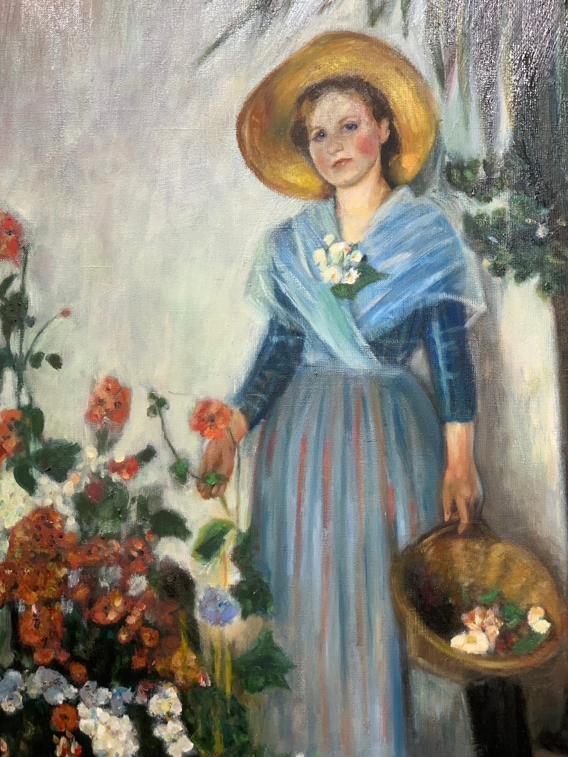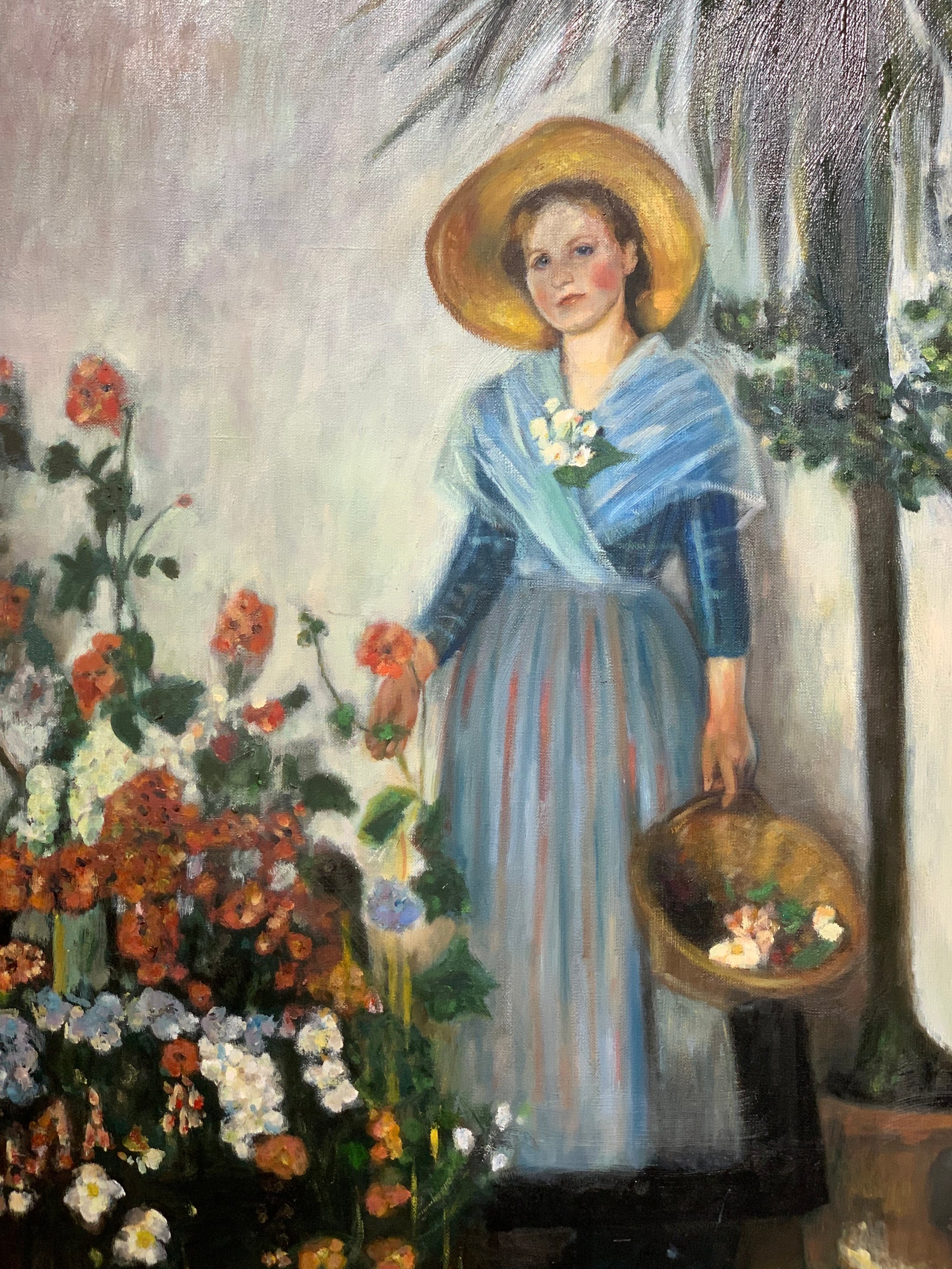 Obraz "W oranżerii" Olga Boznańska, kopia sygnowana. Oryginał dzieła został namalowany w 1890 roku przez 25-letnią wówczas artystkę podczas pobytu w Krakowie. Dzieło o pięknej kolorystyce, technika: olej na płótnie, oprawiony w drewnianą ramę.