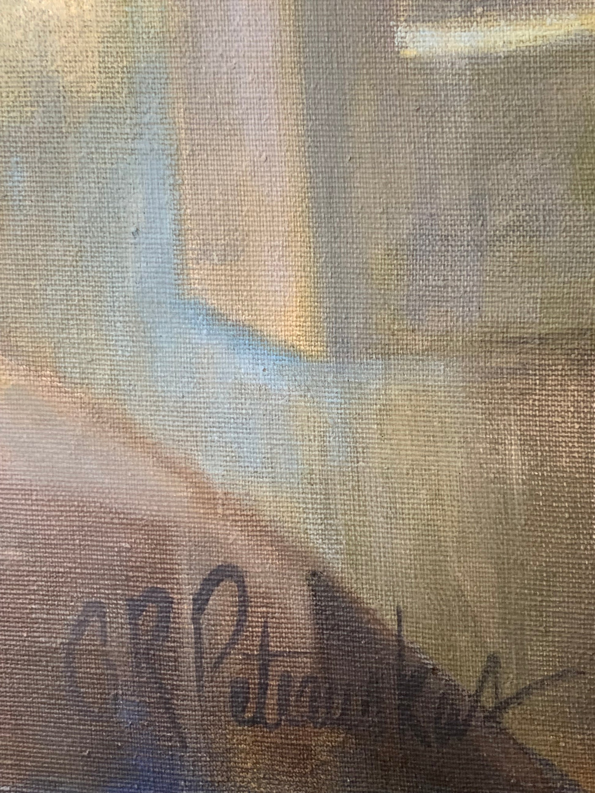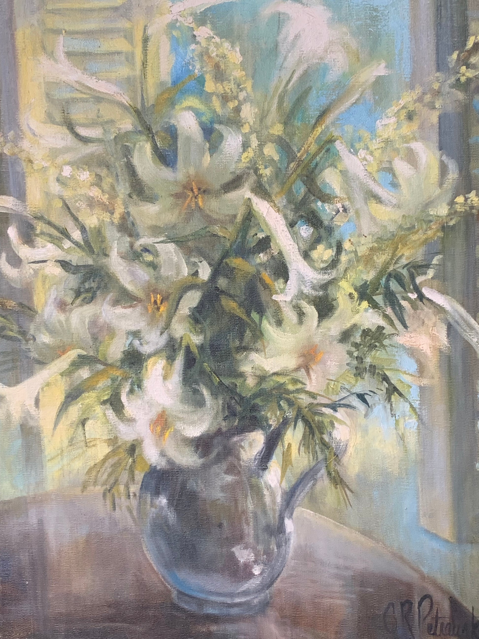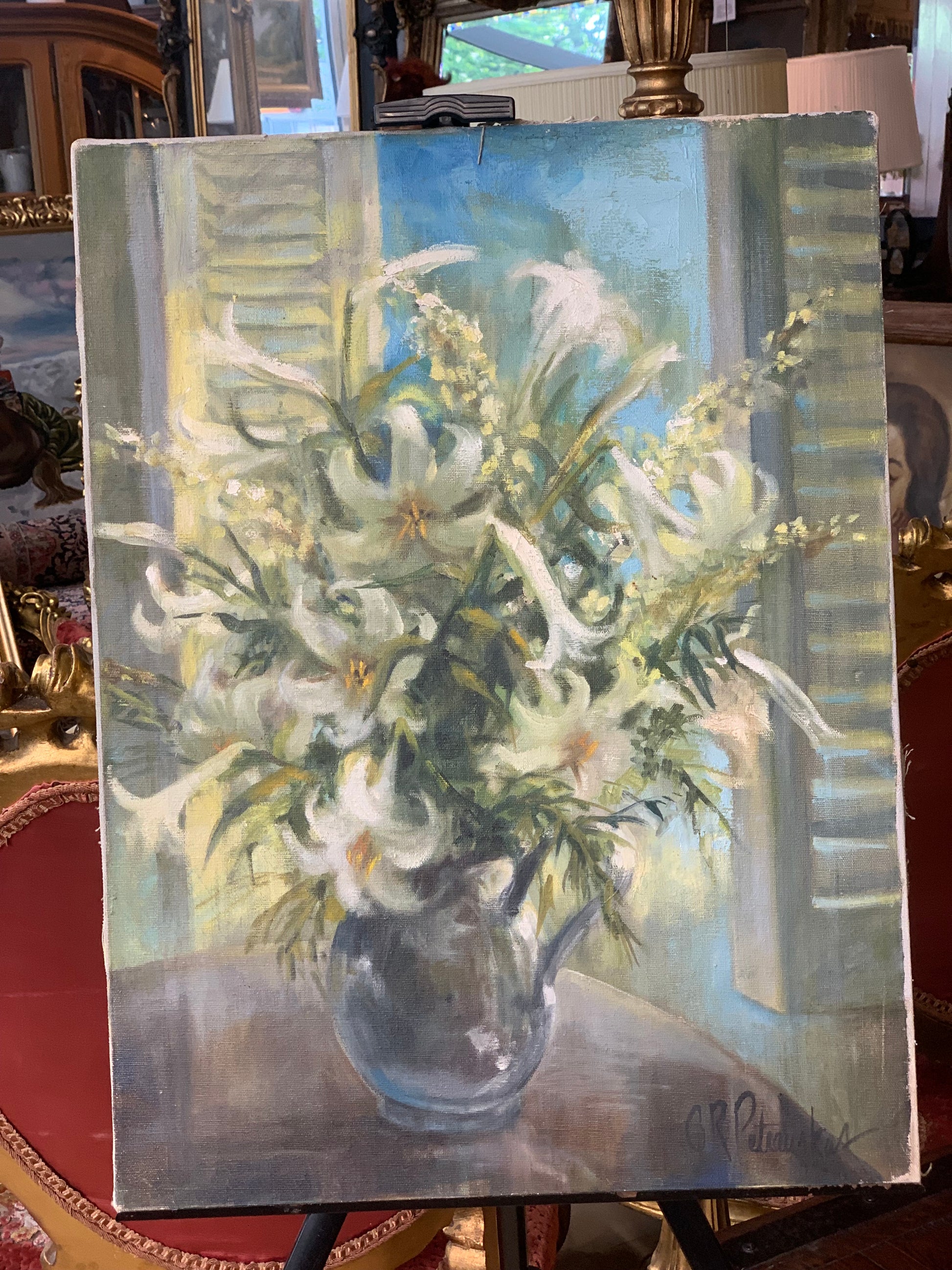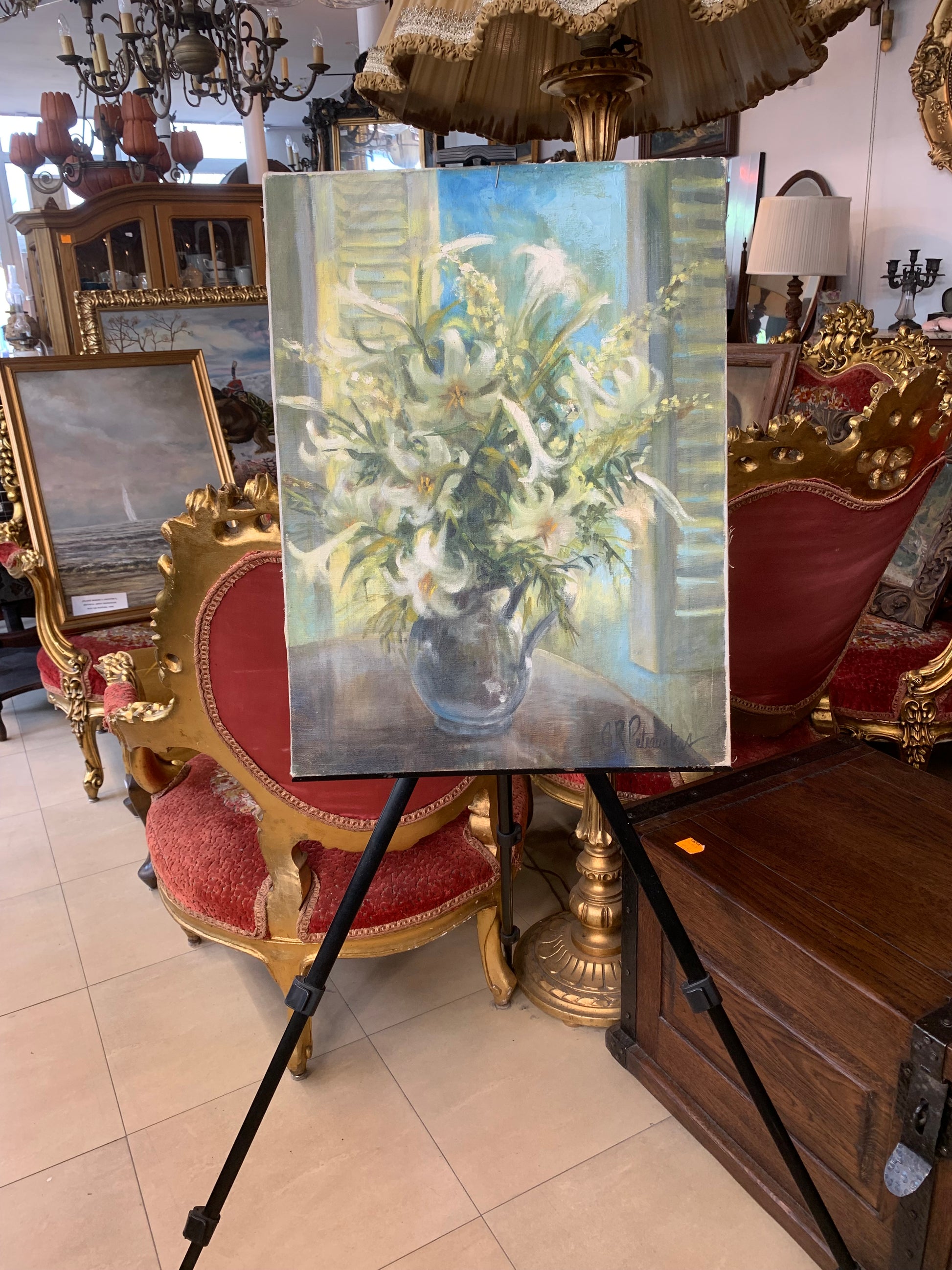 Obraz "Lilie w wazonie" sygnowany w prawym dolnym rogu, technika: olej na płótnie. Obraz bez ramy o wymiarach; 46 x 60 cm.