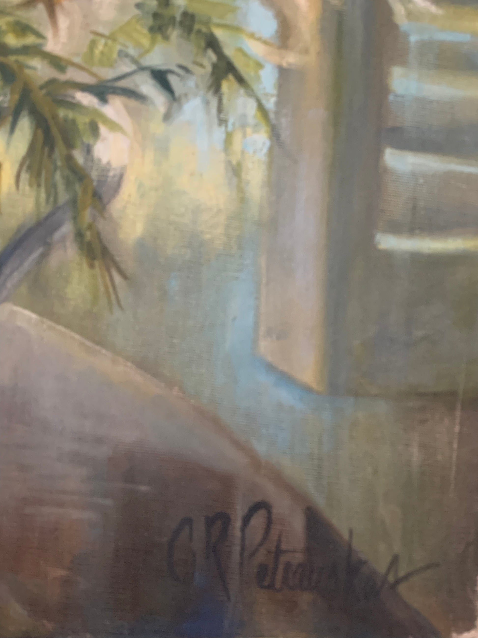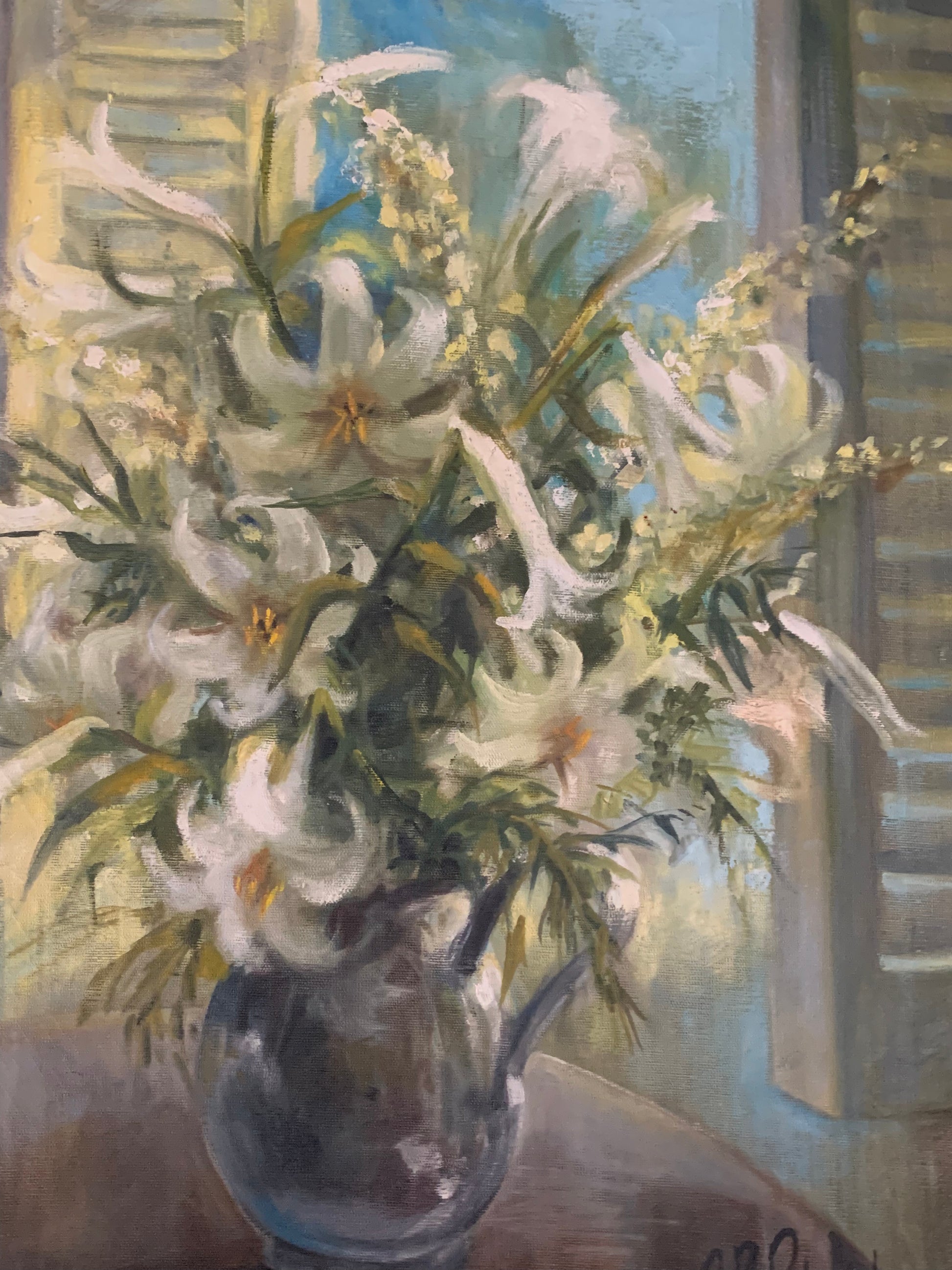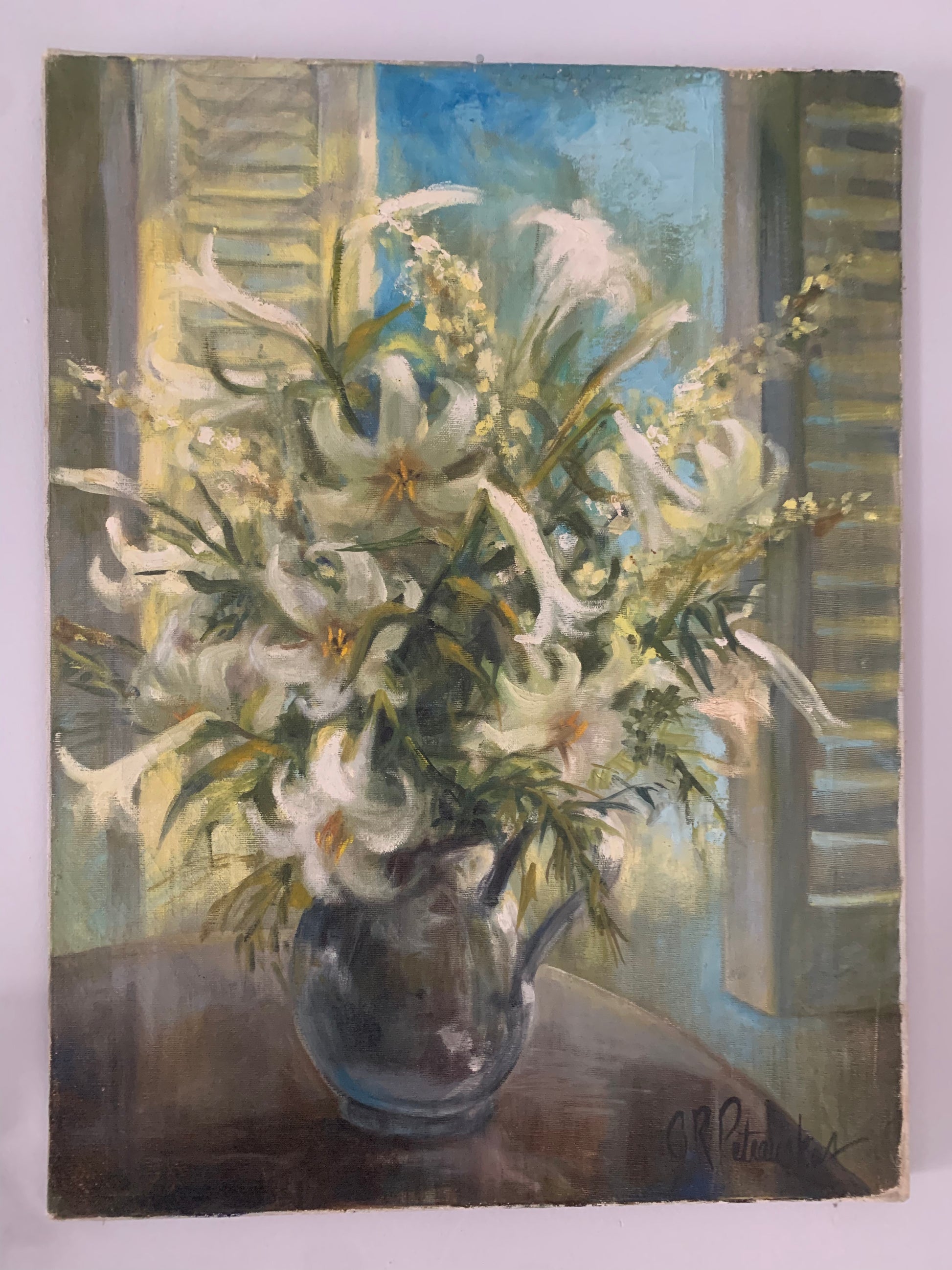 Obraz "Lilie w wazonie" sygnowany w prawym dolnym rogu, technika: olej na płótnie. Obraz bez ramy o wymiarach; 46 x 60 cm.