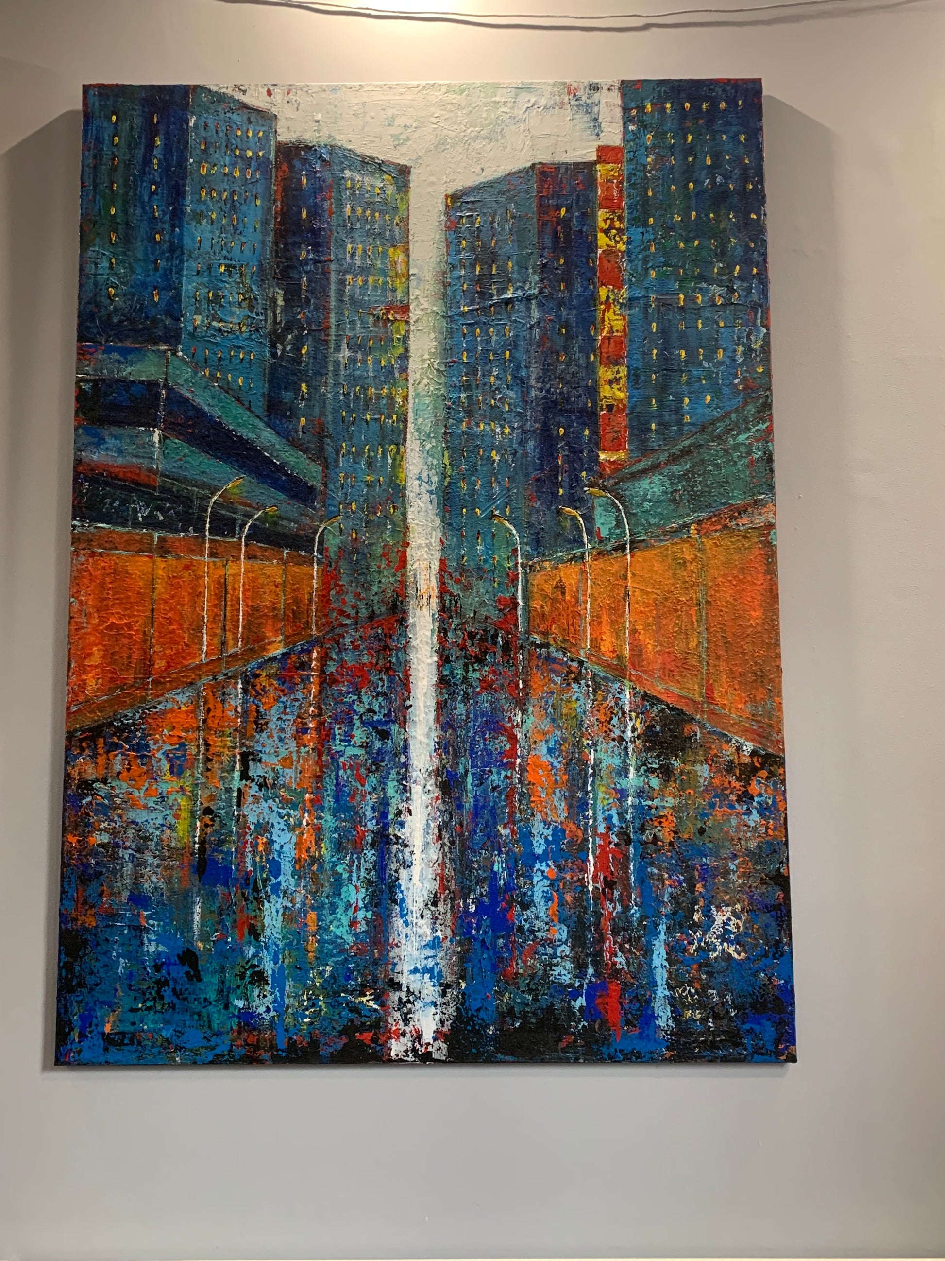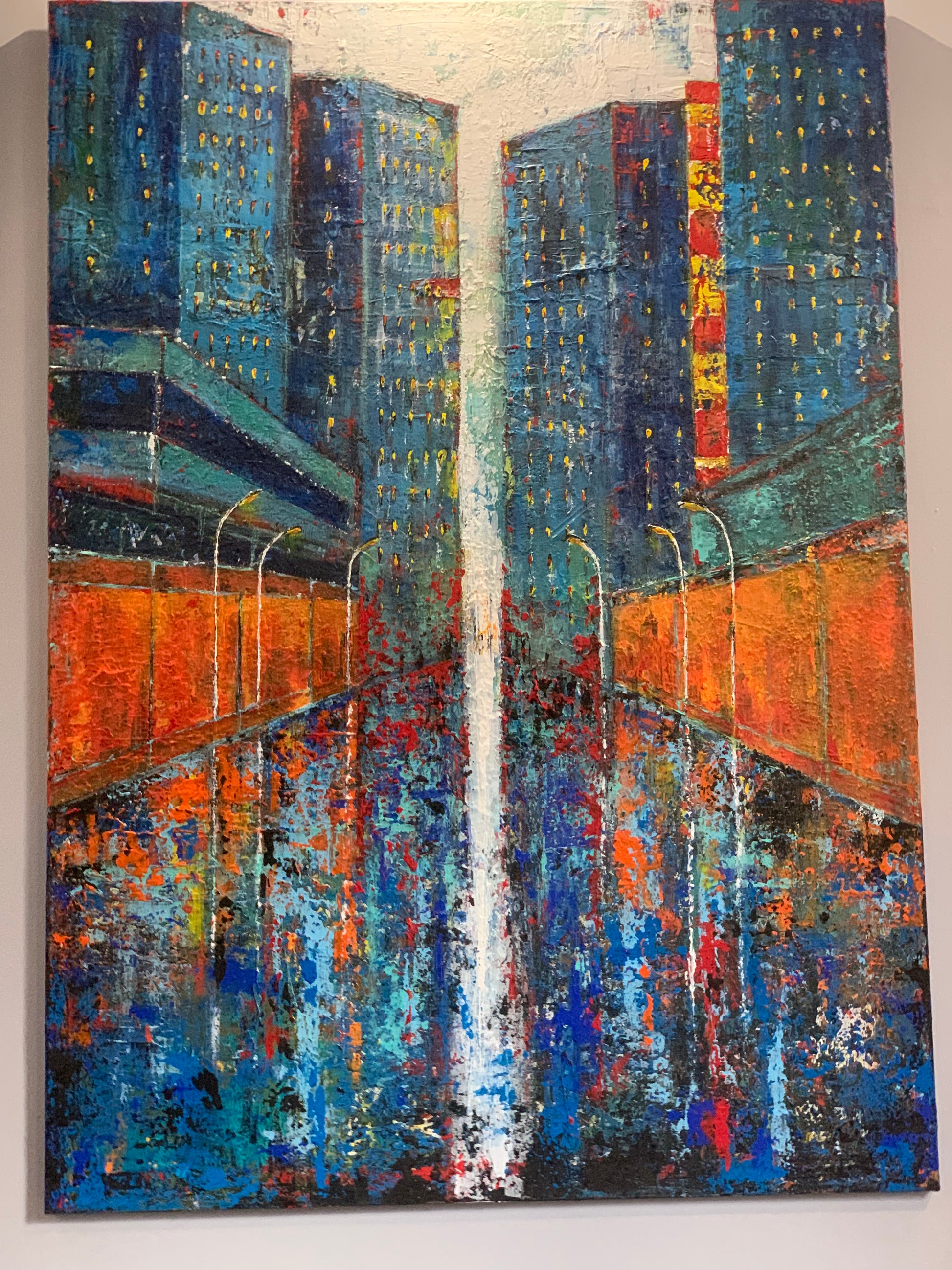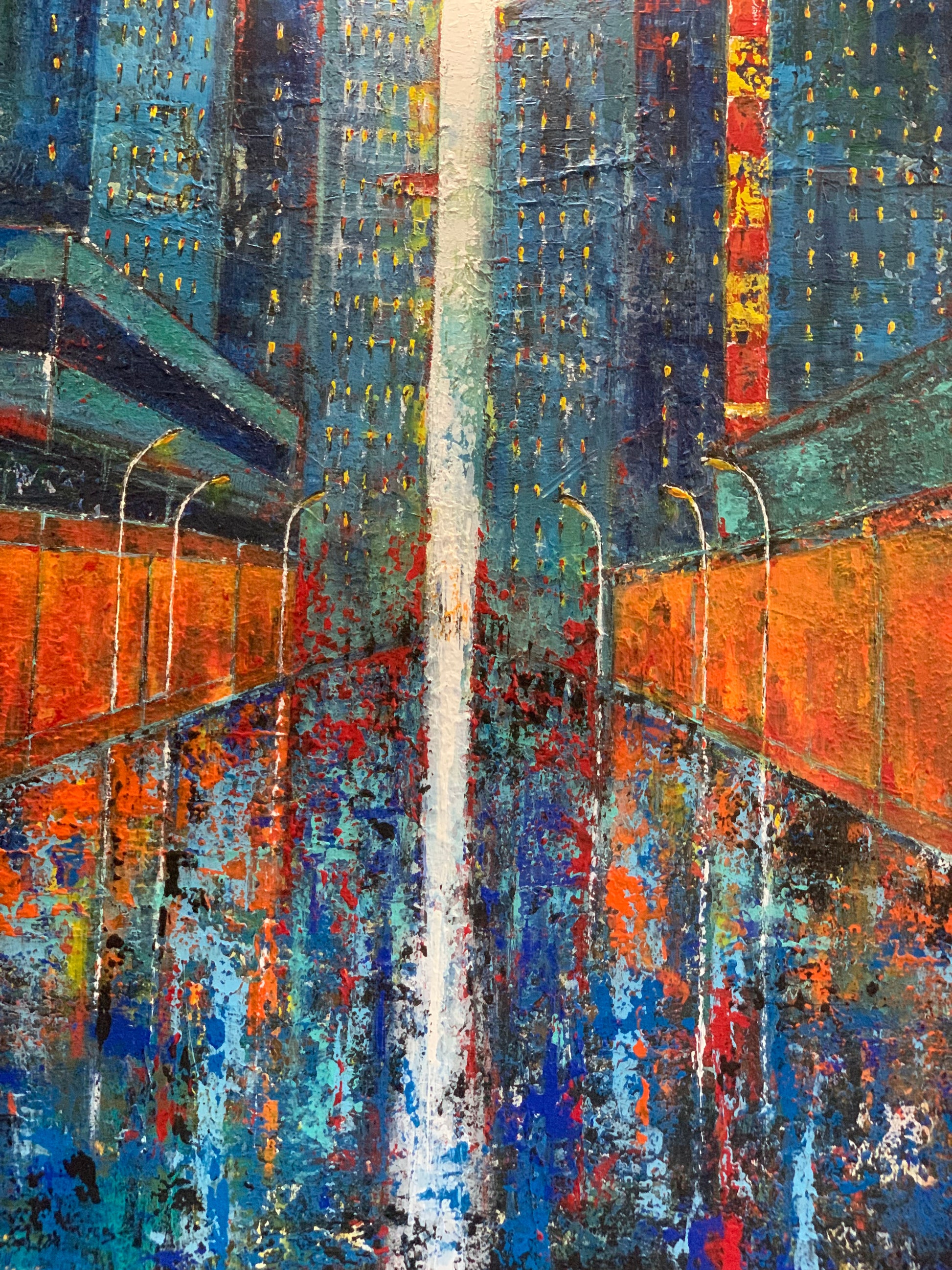 Duży, współczesny obraz architektura miasta, abstrakcja. Piękna, żywa kolorystyka.
