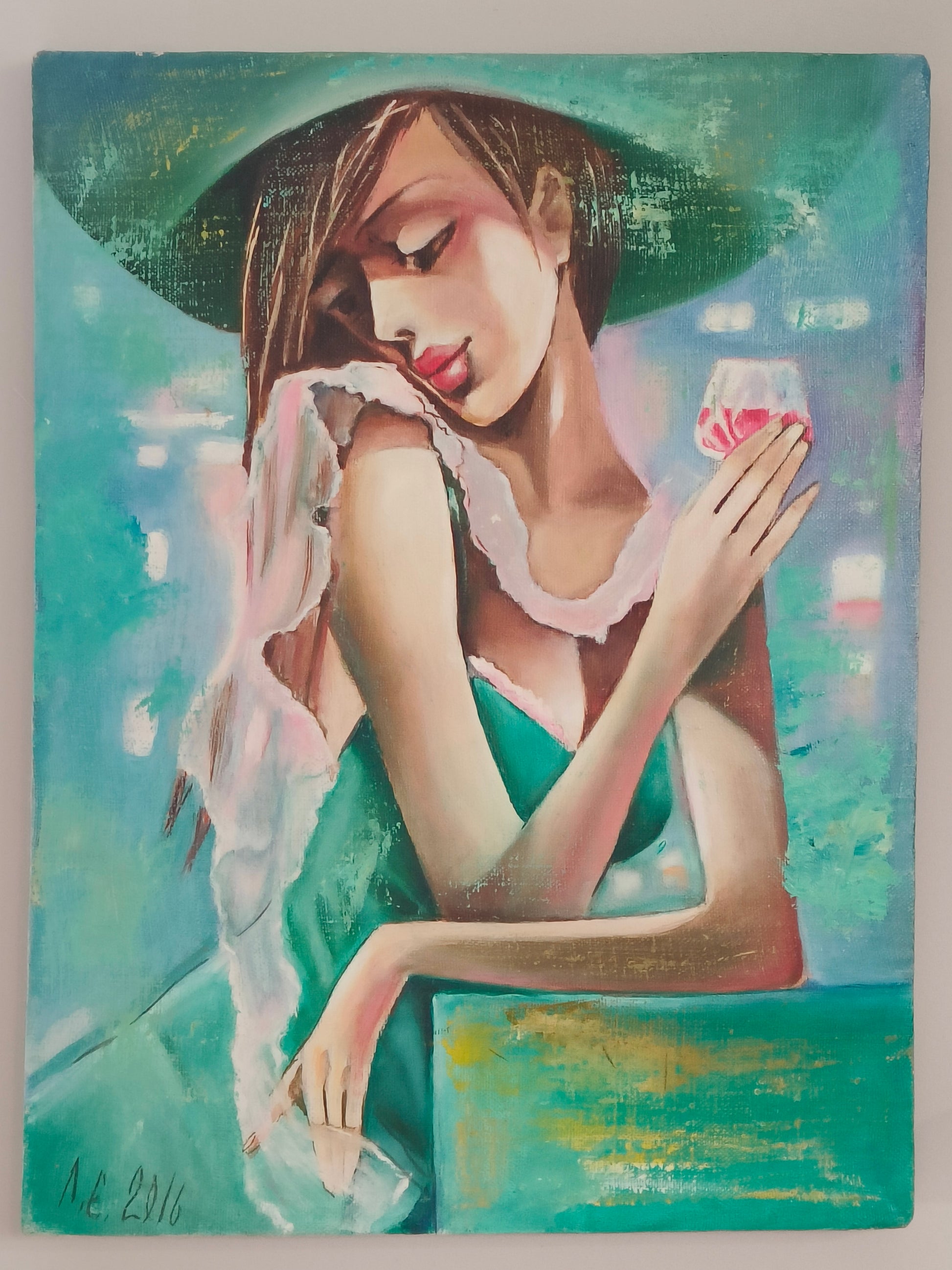Obraz, olej na płótnie "Dama z kieliszkiem" E. Lesoklińska