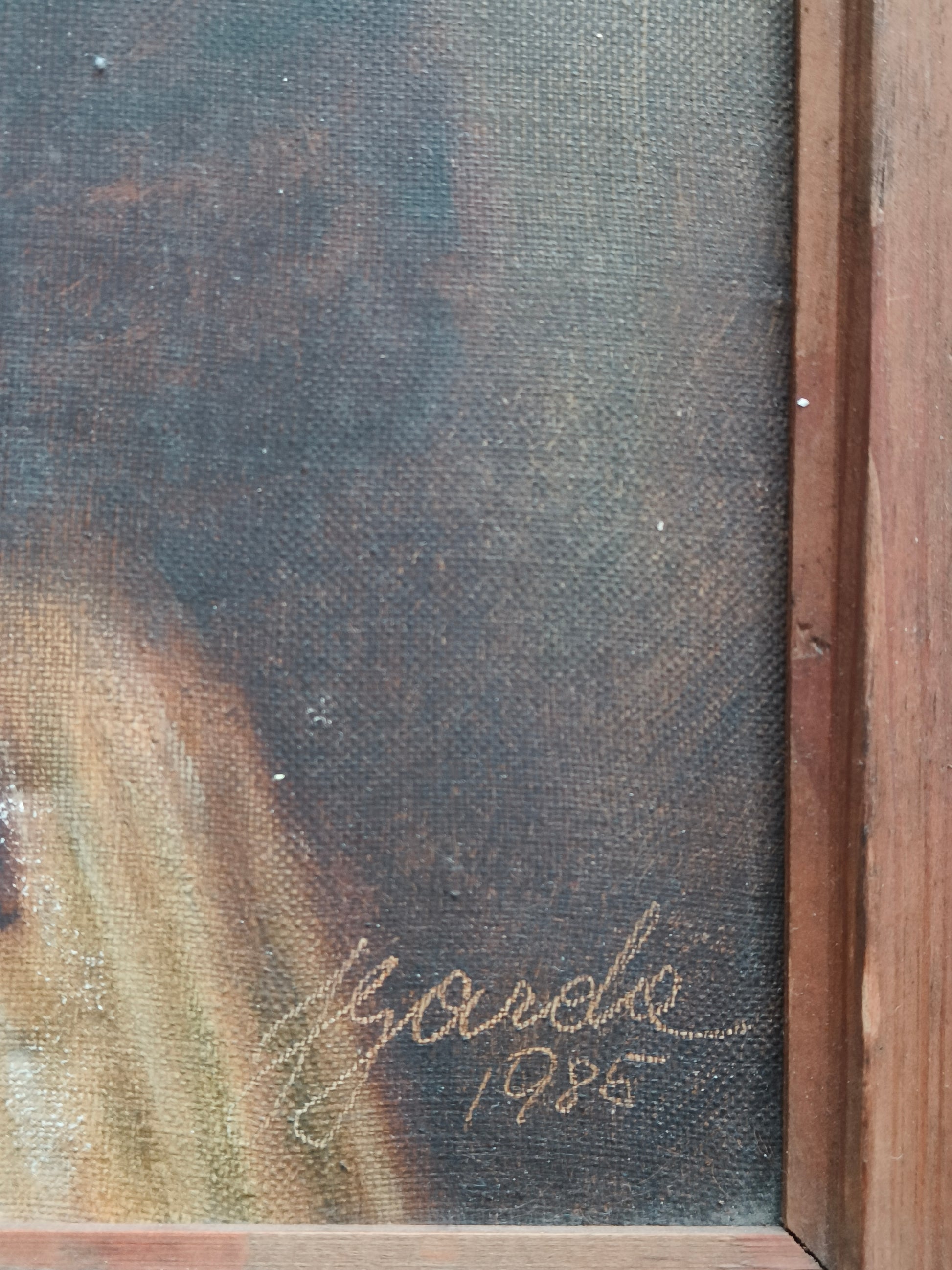 Obraz, olej na płótnie, J. Gazda, 1985 r, w drewnianej ramie.