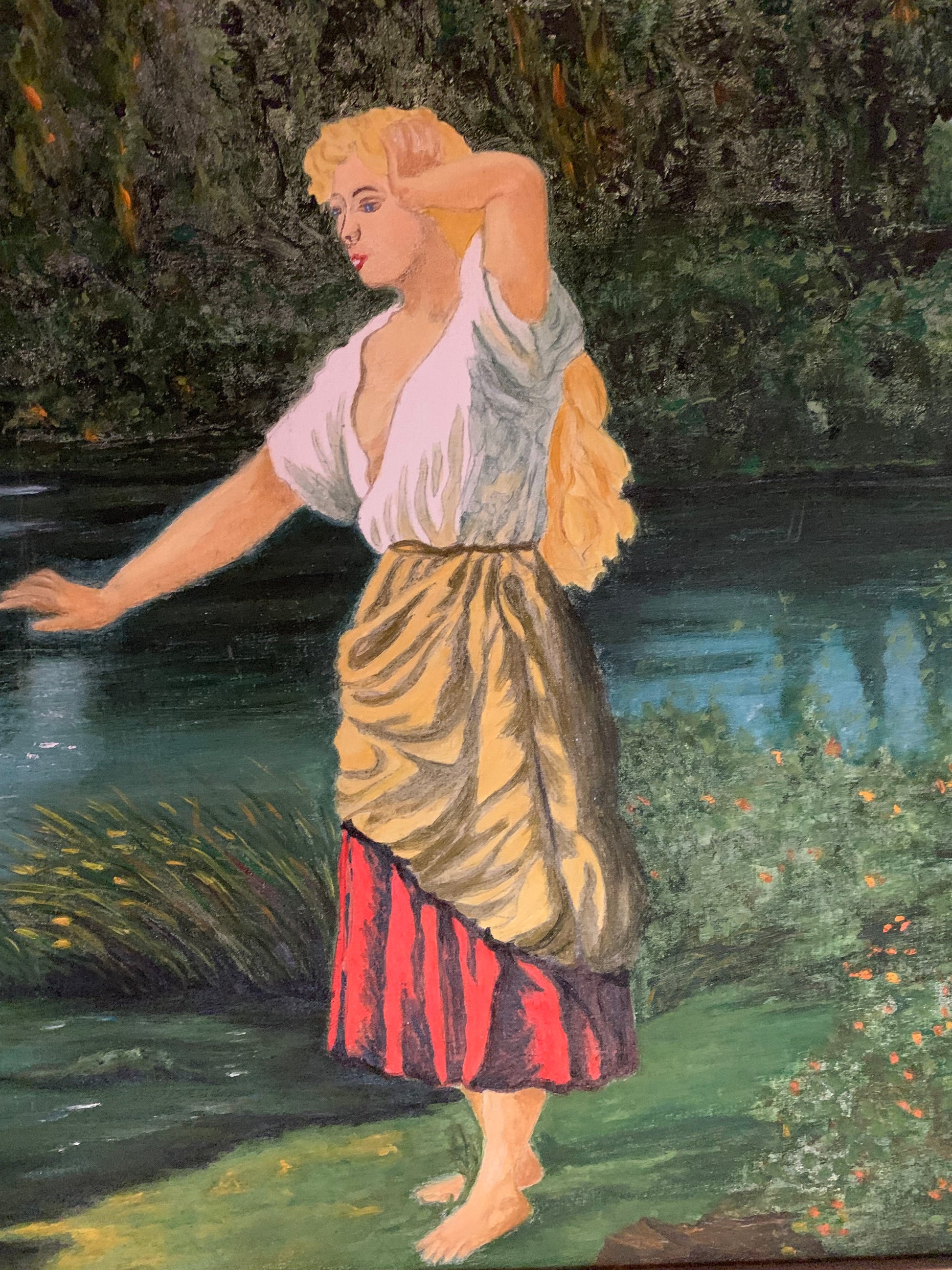 Obraz, olej na płótnie, przedstawiający wiejską dziewczynę nad jeziorem, w pięknej, drewnianej, złoconej ramie.