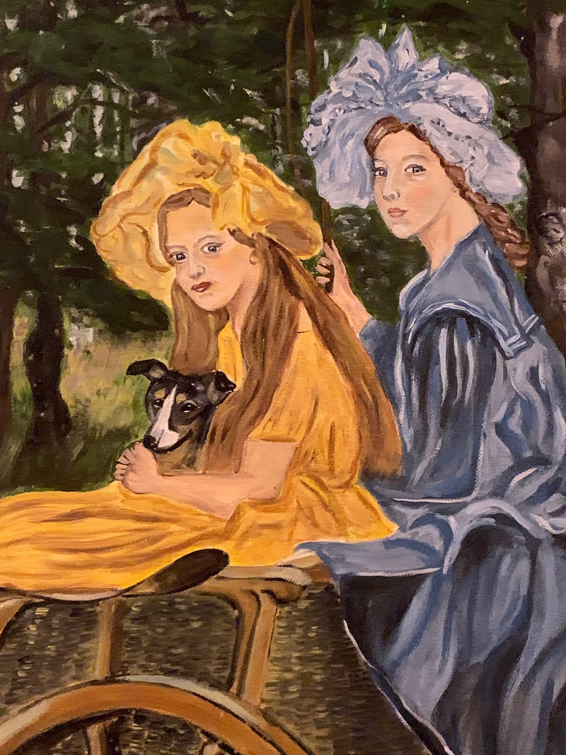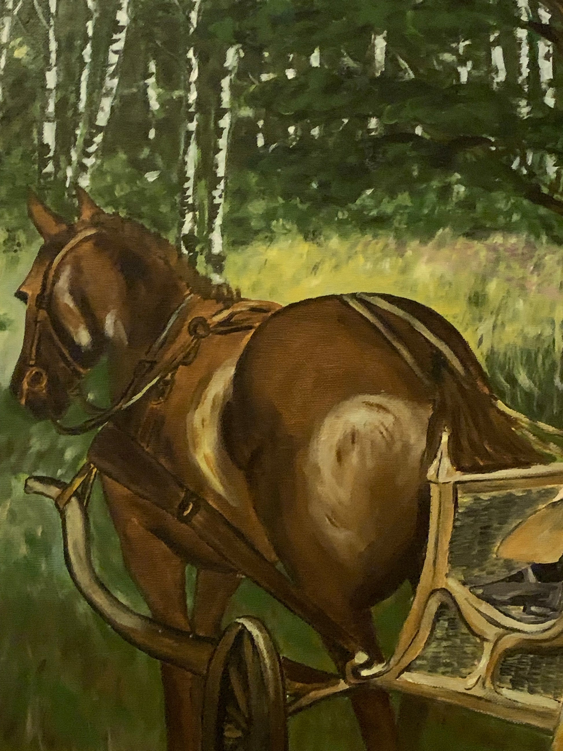 Obraz, olej na płótnie, przedstawiający dwie kobiety jadące bryczką. Dzieło w pięknej, drewnianej, bogato zdobionej ramie. Autorka - W. Kostrzyńska.