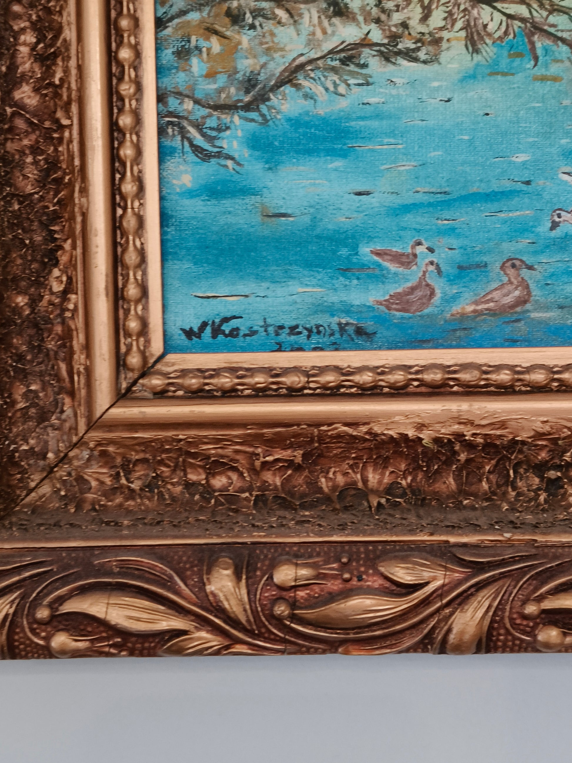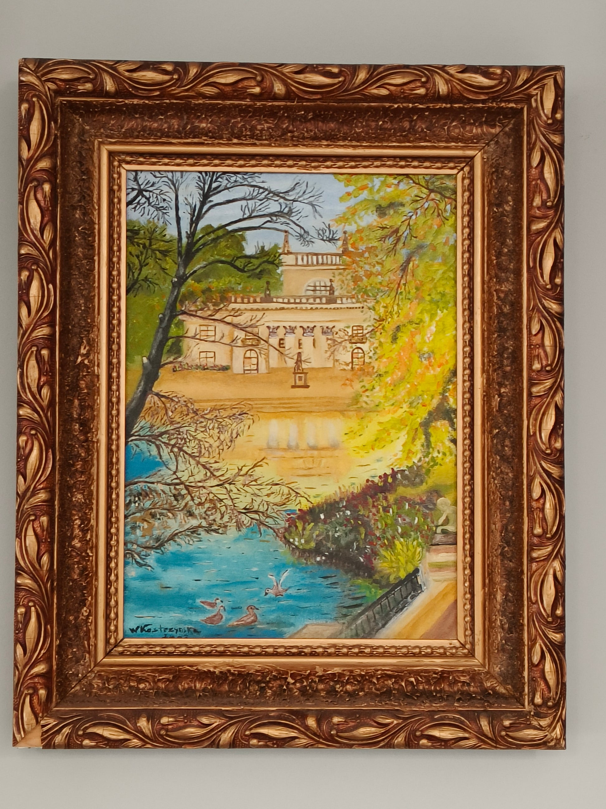 Obraz, pejzaż z dworkiem, olej na płótnie, Kostrzyńska.