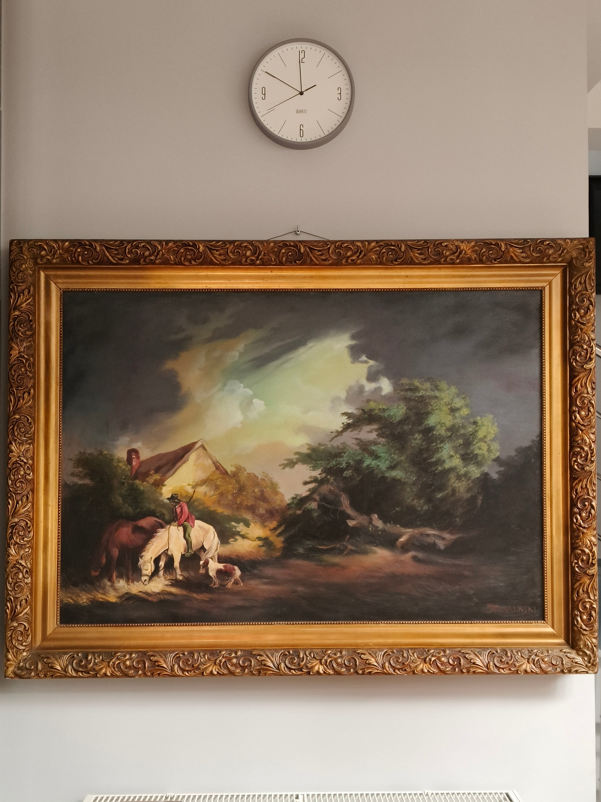 Duży obraz znanego malarza i rzeźbiarza J. Tomasińskiego, olej na płótnie, w pięknej, bogato zdobionej ramie, lata 80-te.