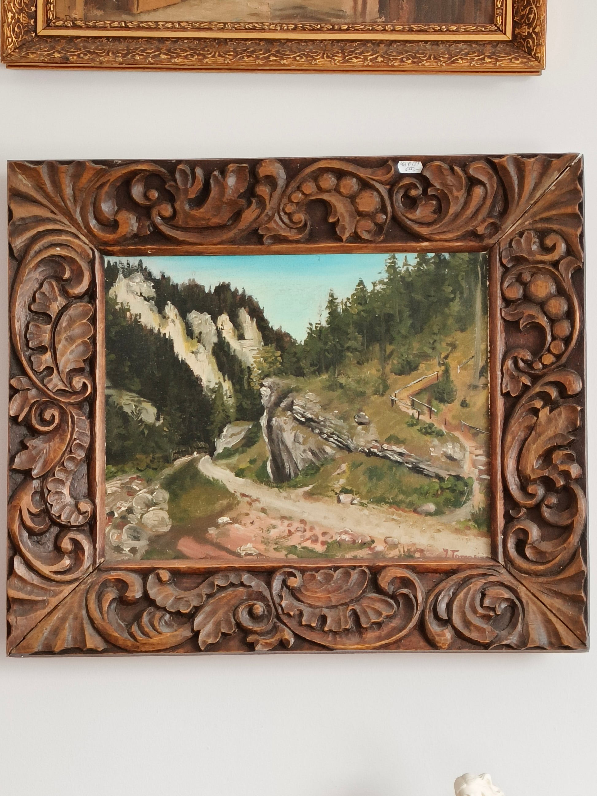 Obraz, olej na płótnie, przedstawiający pejzaż górski, znanego malarza i rzeźbiarza J. Tomasińskiego.