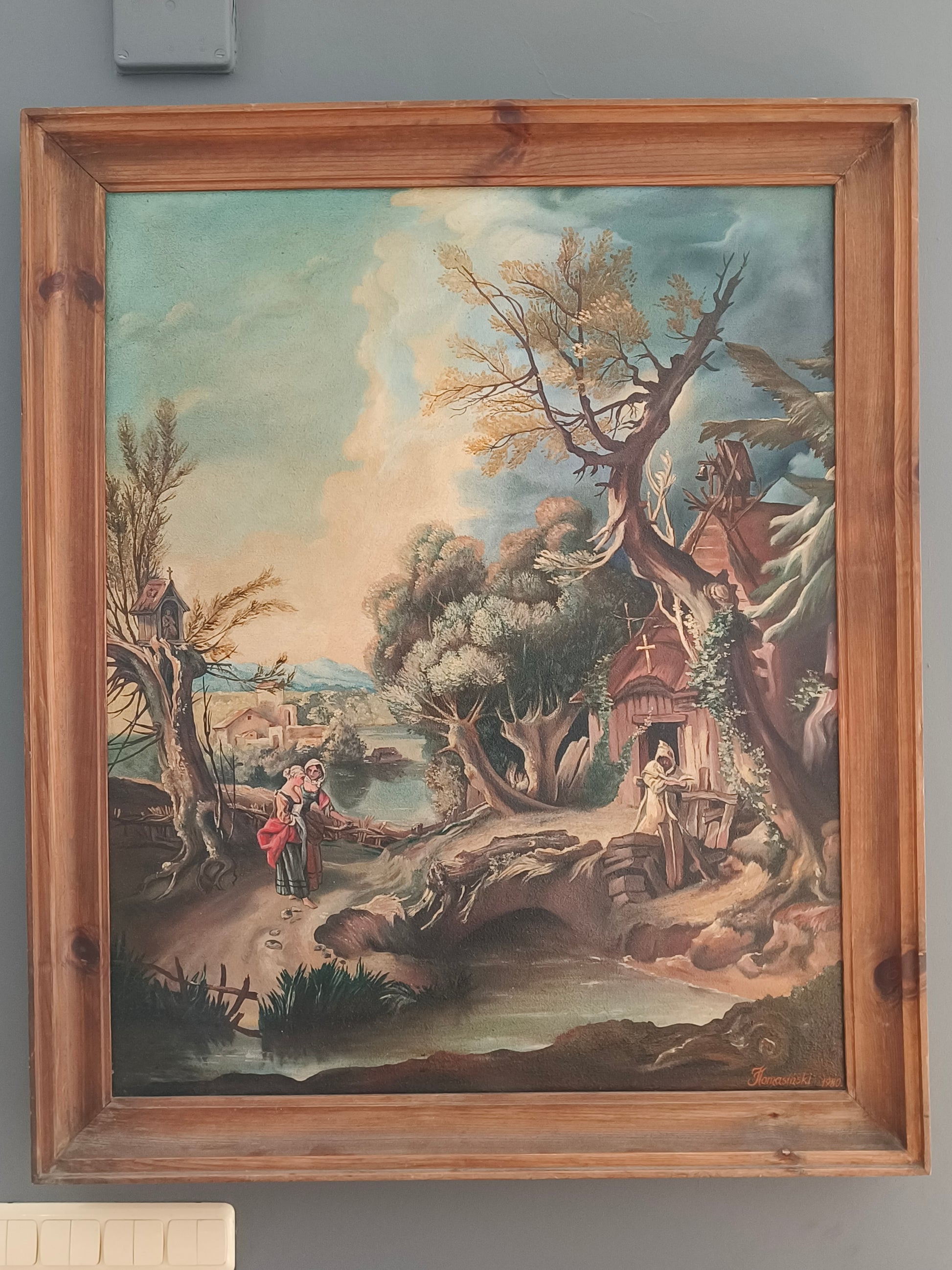 Obraz, olej na płótnie, Tomasiński, lata 80-te. Na pierwszym planie drewniany kościół i most nad rzeczką.