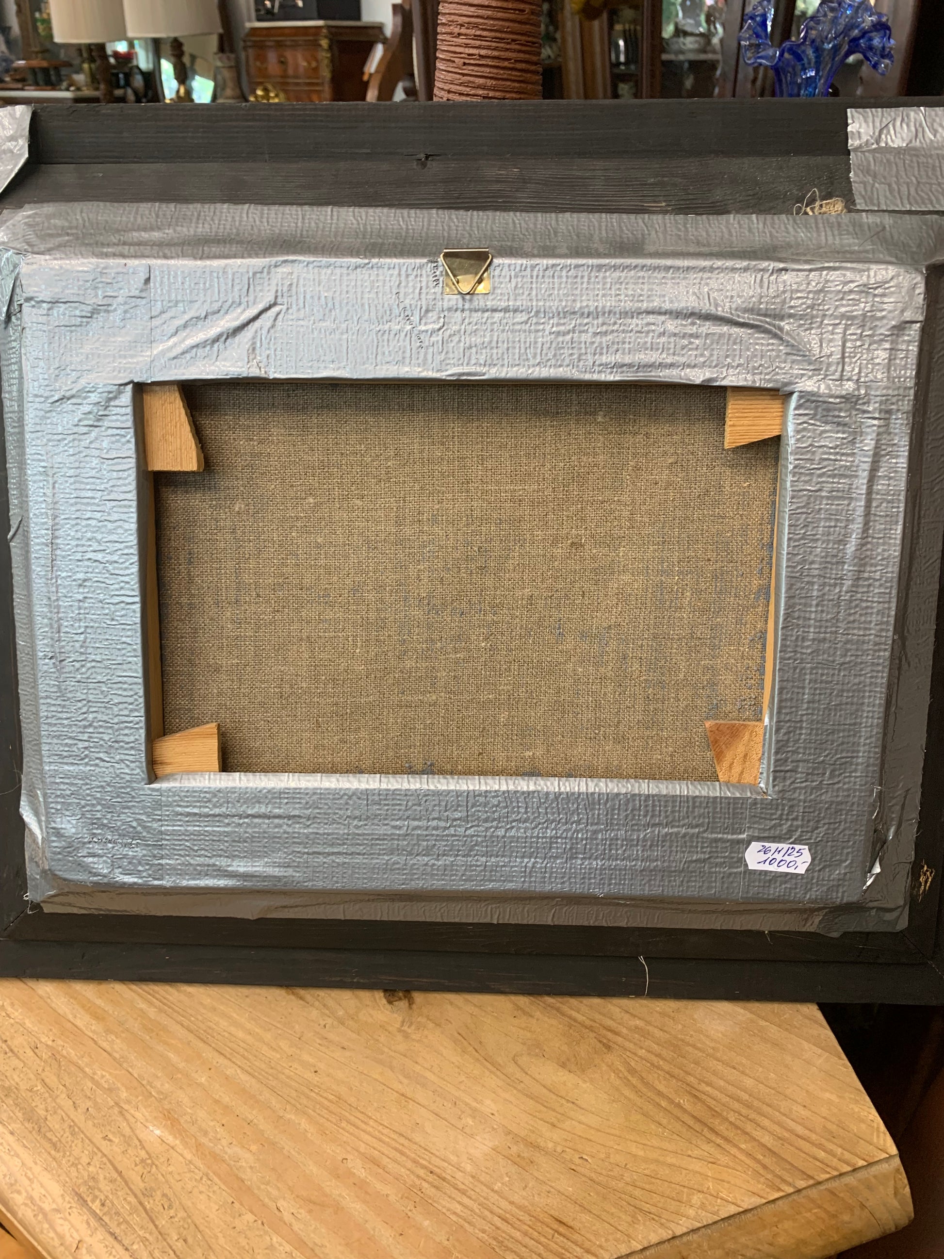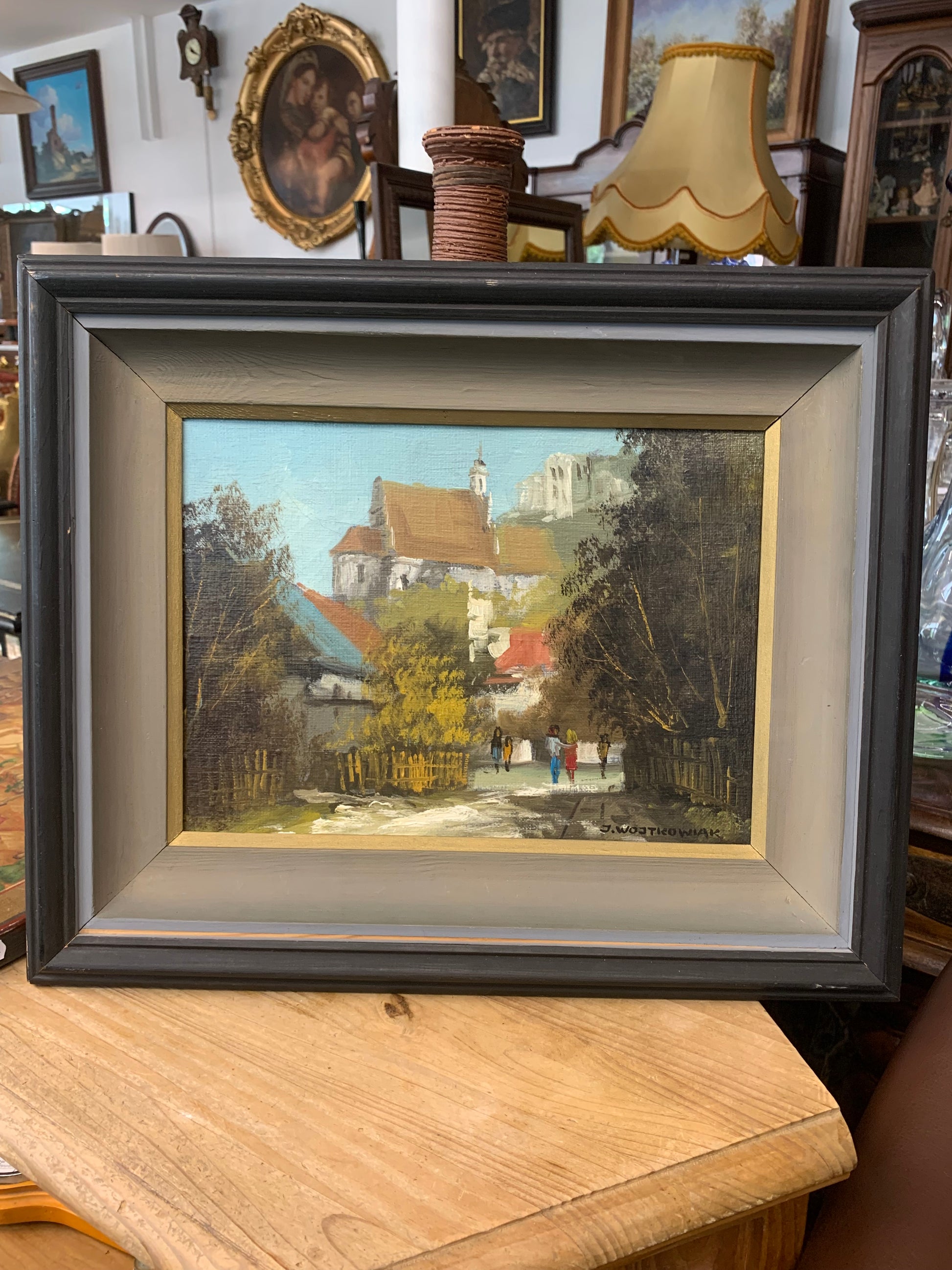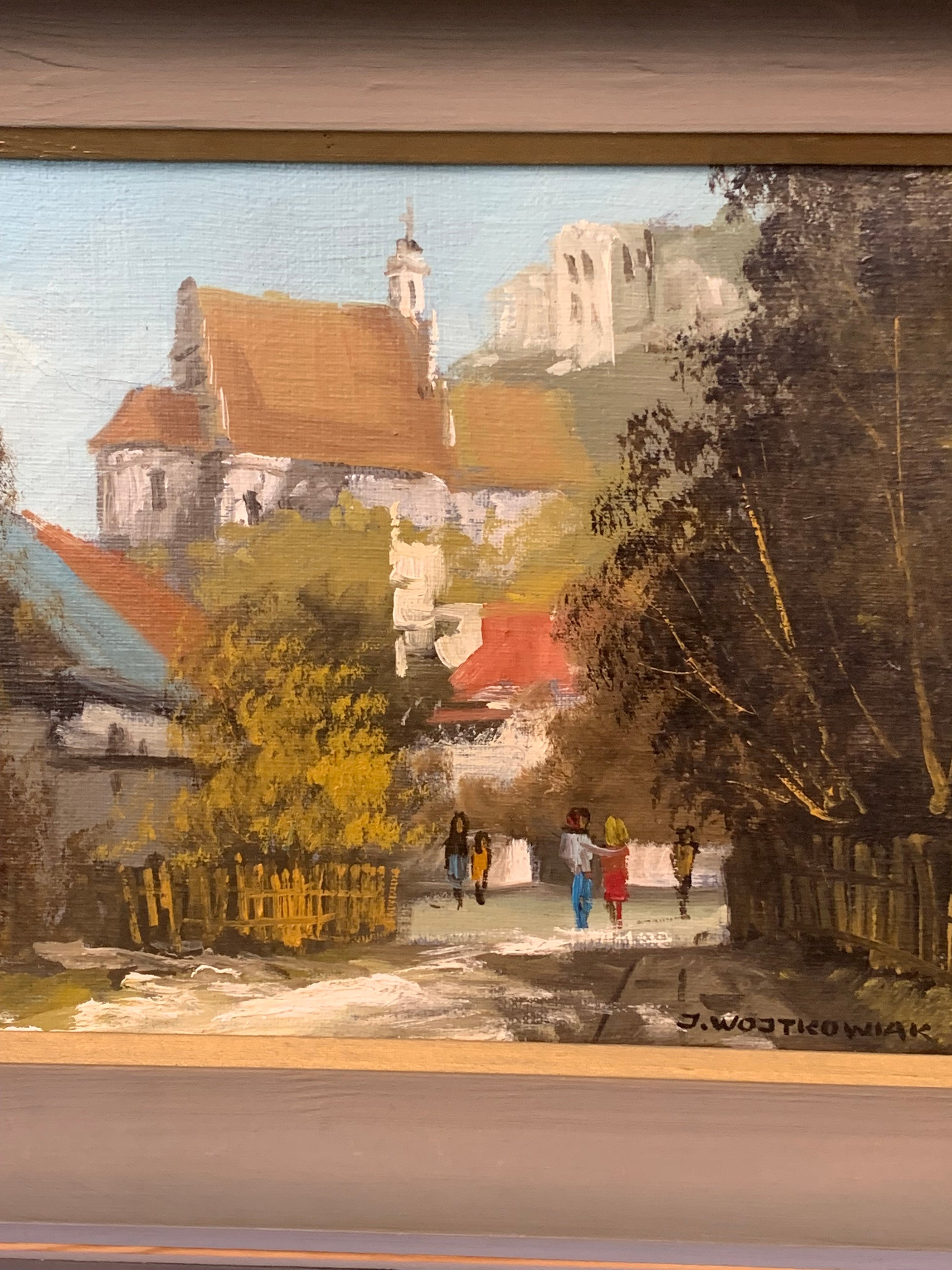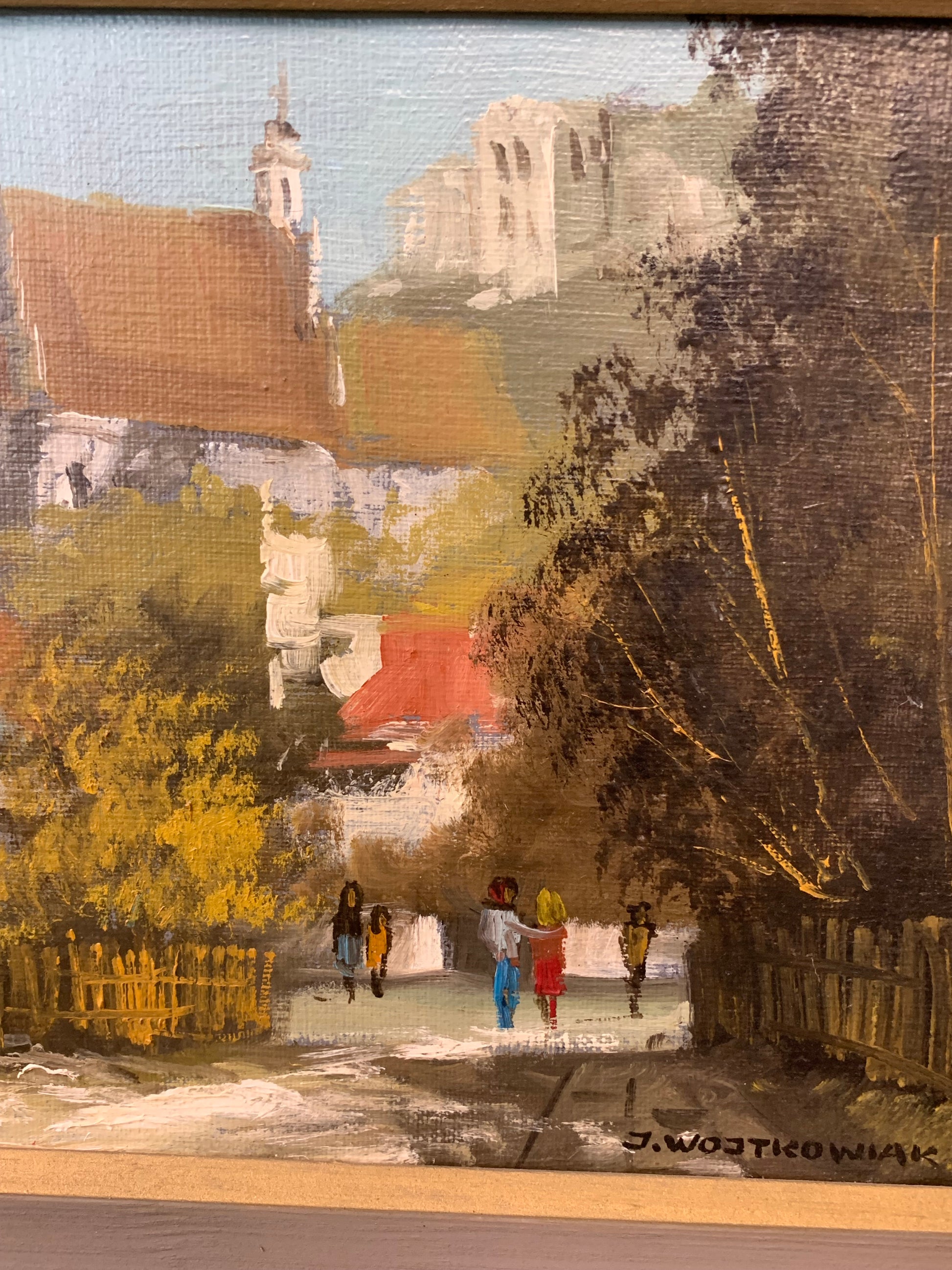 Obraz, pejzaż "Ulica miasta" J. Wojtkowiak w drewnianej ramie. Technika: olej na płótnie.