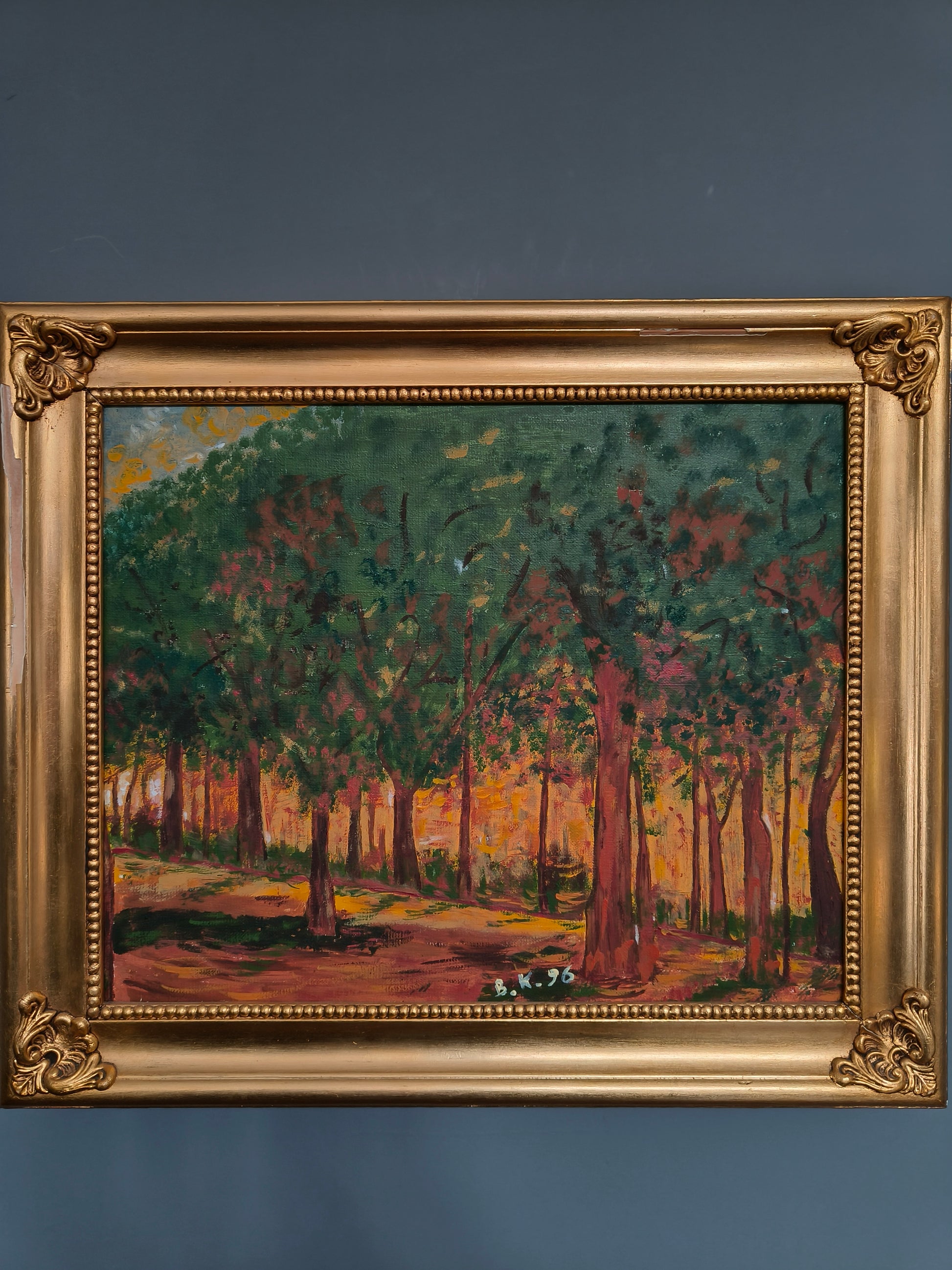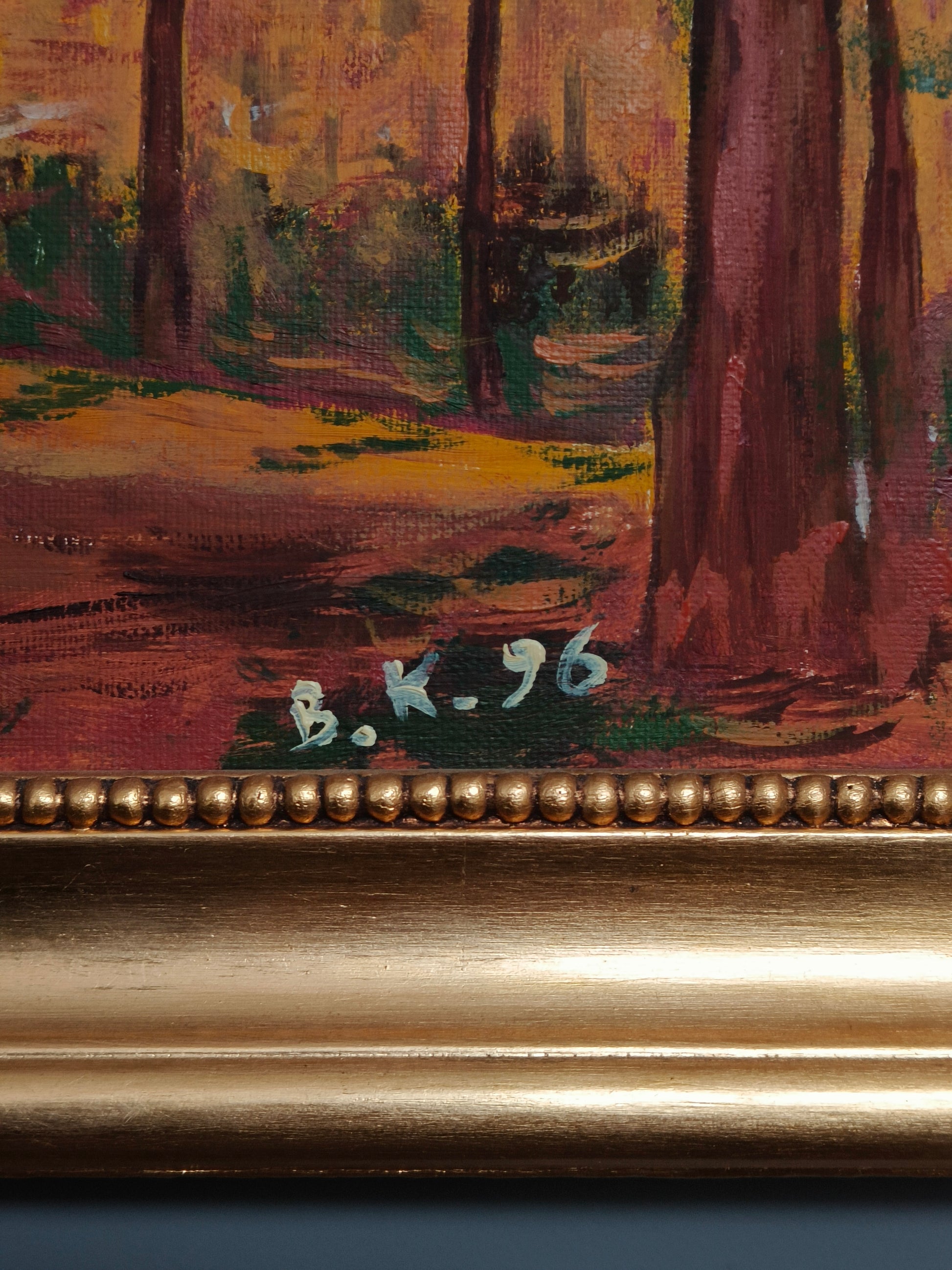 Obraz pejzaż, olej na płótnie B. Kostrzyńska, 1996, oprawiony w złoconą, rzeźbioną, drewnianą ramę.
