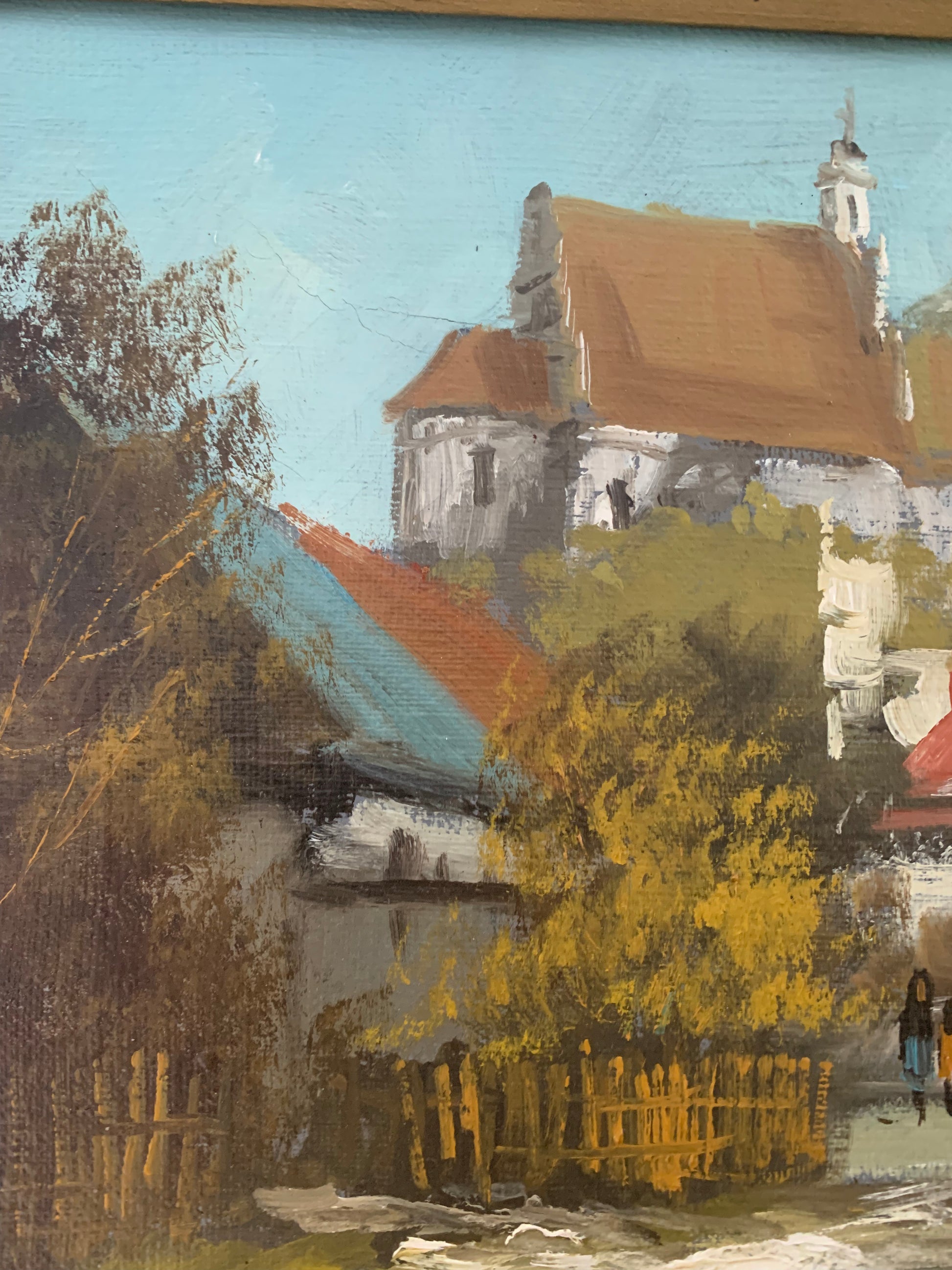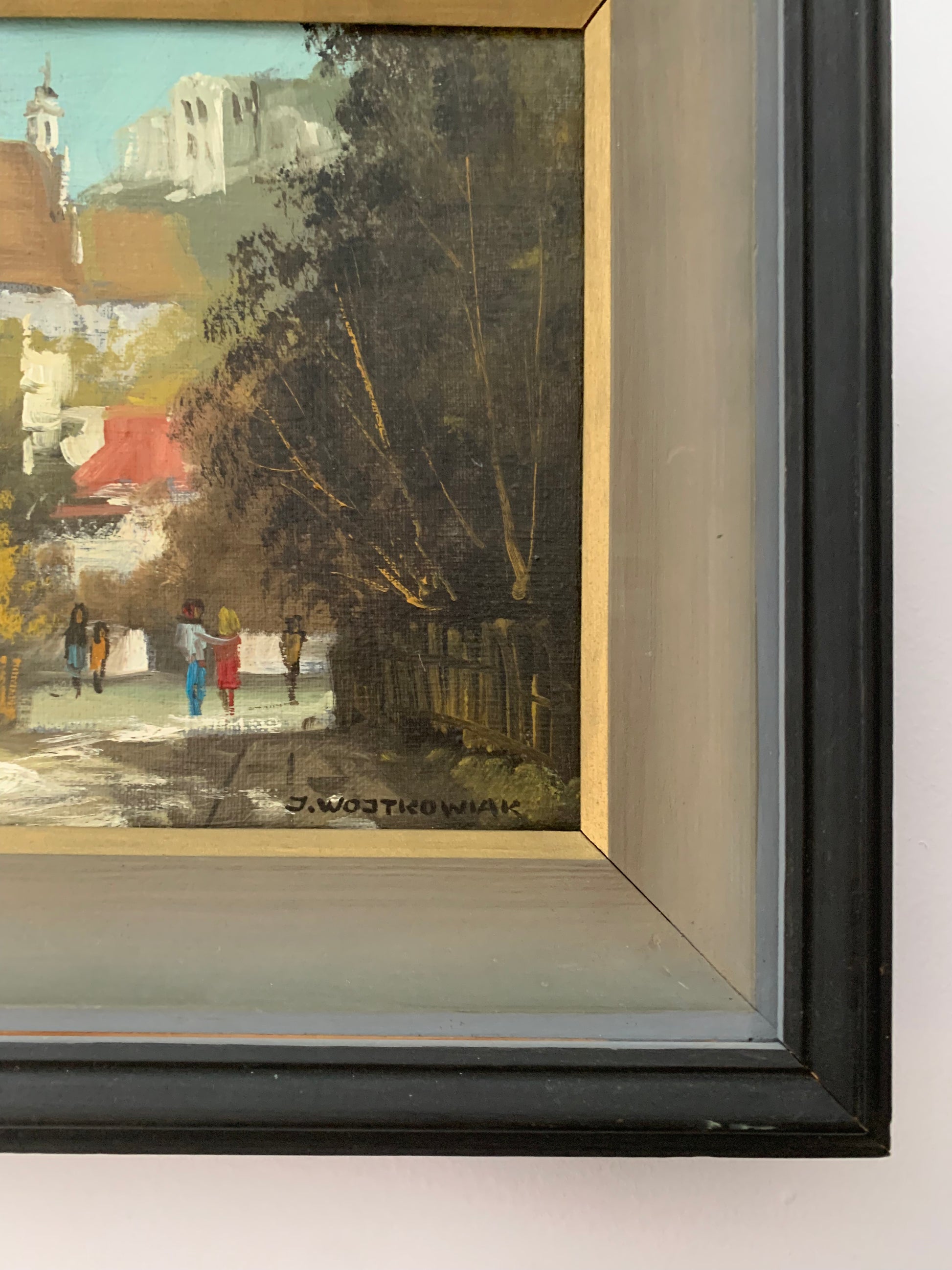 Obraz, pejzaż "Ulica miasta" J. Wojtkowiak w drewnianej ramie. Technika: olej na płótnie.