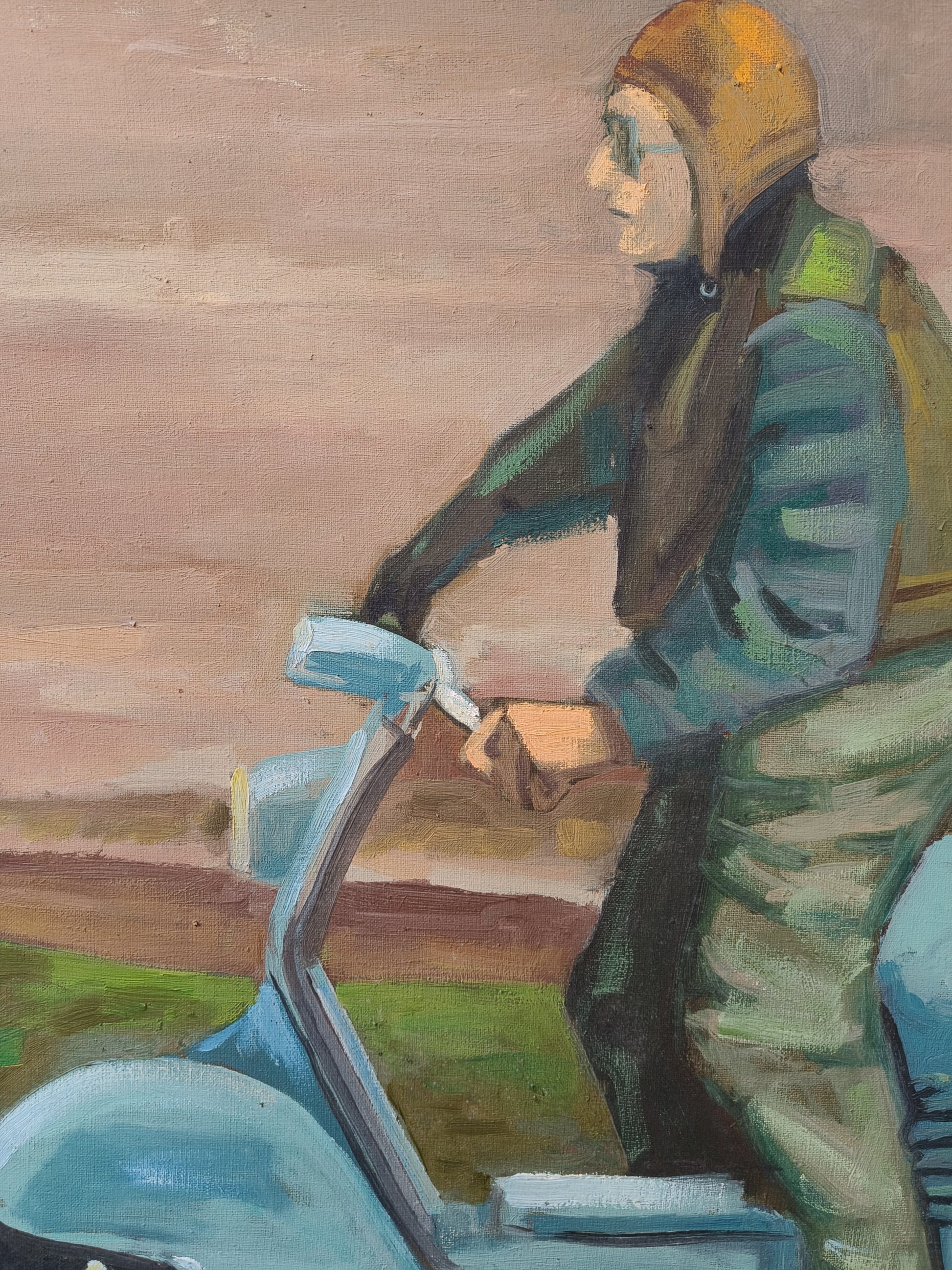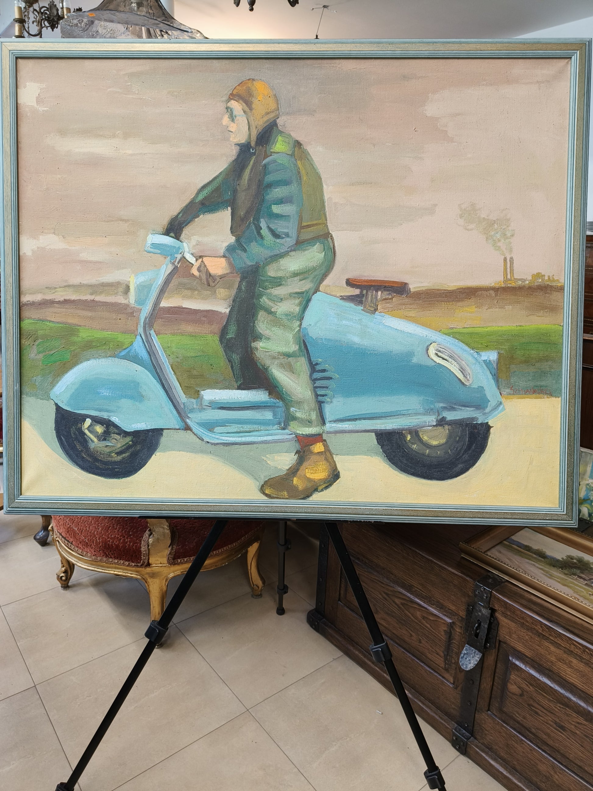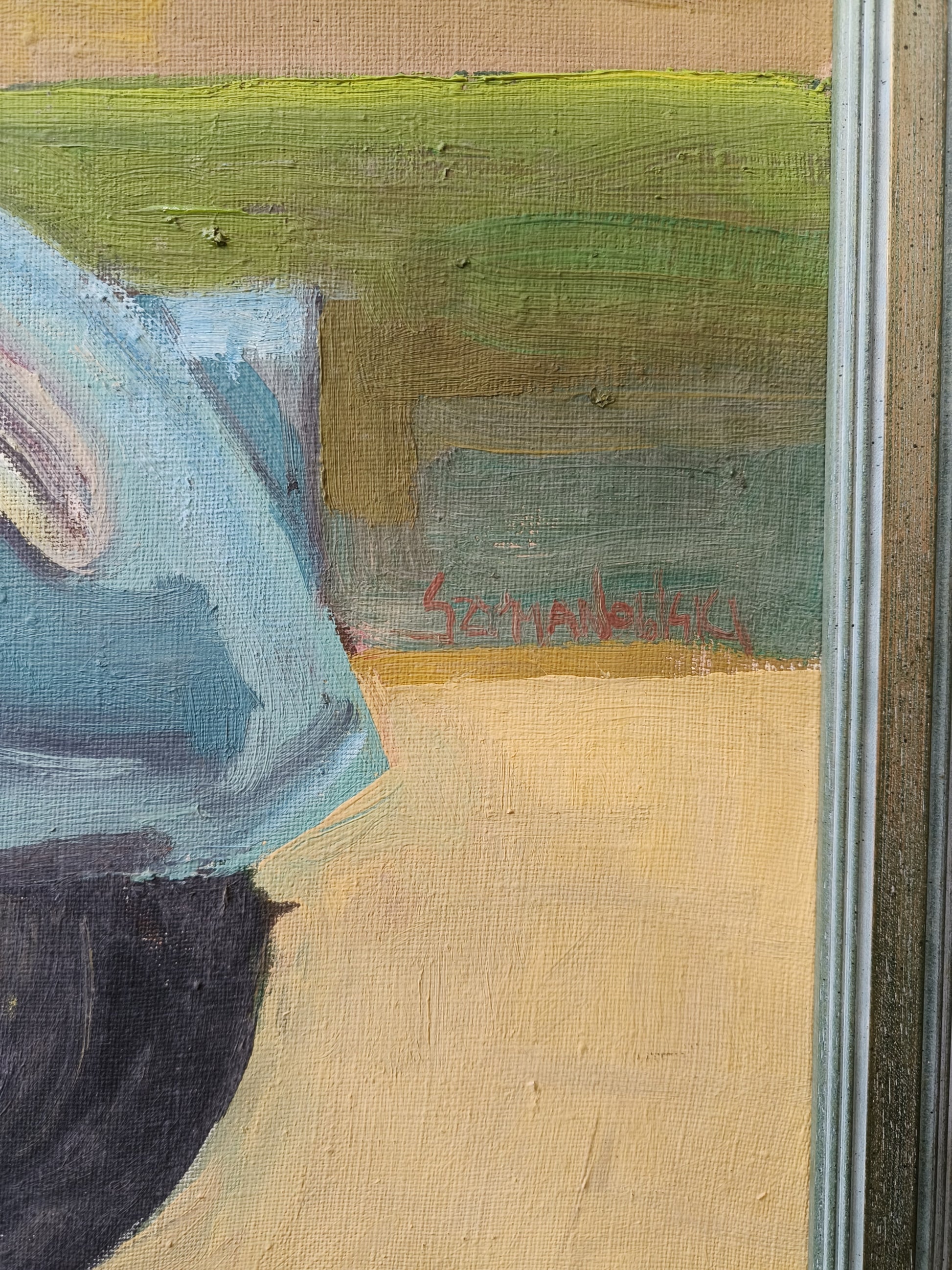 Duży obraz Art Deco sygnowany Szymanowski, lata 30-te. Piękne połączenie barw zieleni i brązu, sztuka figuratywna. Dzieło oprawione w drewnianą ramę barwioną w kolorach obrazu.