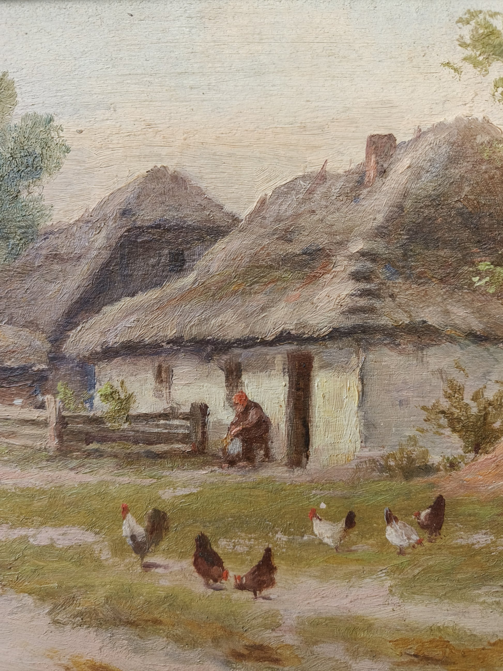 Przedwojenny obraz "Wiejski pejzaż", autor malarz Władysław Grudziński (1875-1942). Technika: olej na desce, wymiary: 56 x 28 cm.