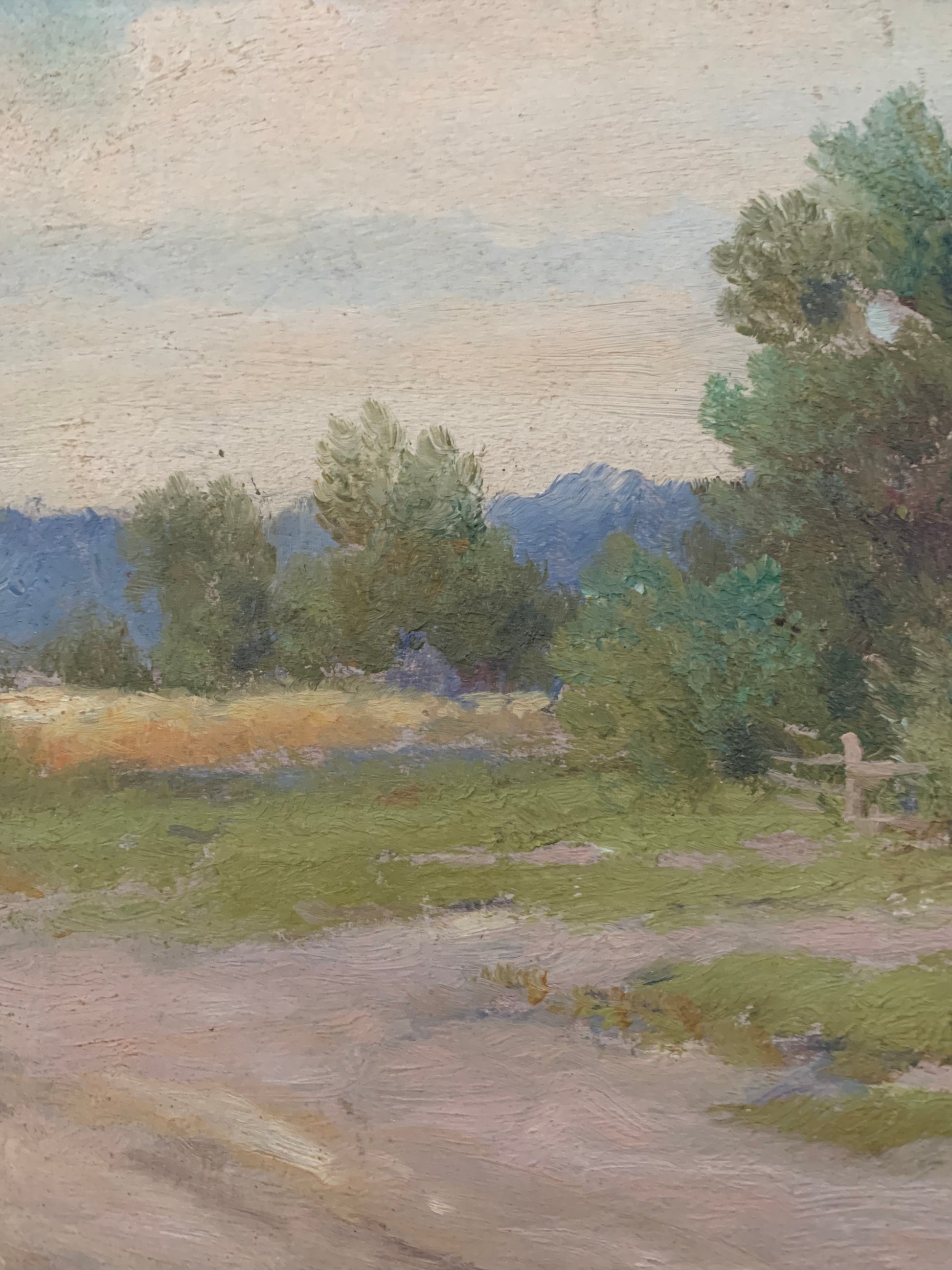 Przedwojenny obraz "Wiejski pejzaż", autor malarz Władysław Grudziński (1875-1942). Technika: olej na desce, wymiary: 56 x 28 cm.