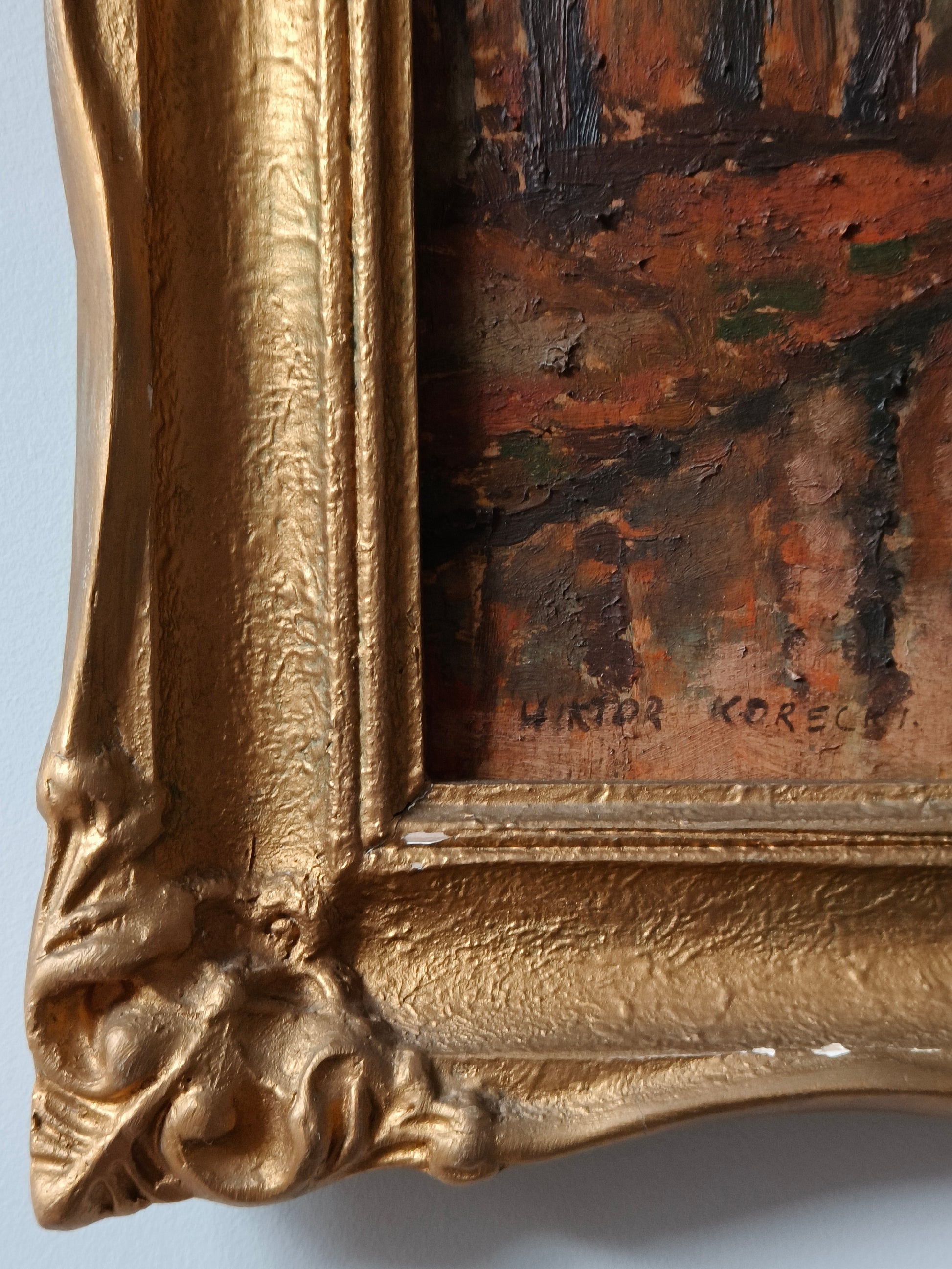 Obraz W. Korecki (1897-1980) pejzaż "Las jesienią", technika wykonania olej na tekturze, oprawiony w drewnianą, rzeźbioną ramę ze złoceniami.