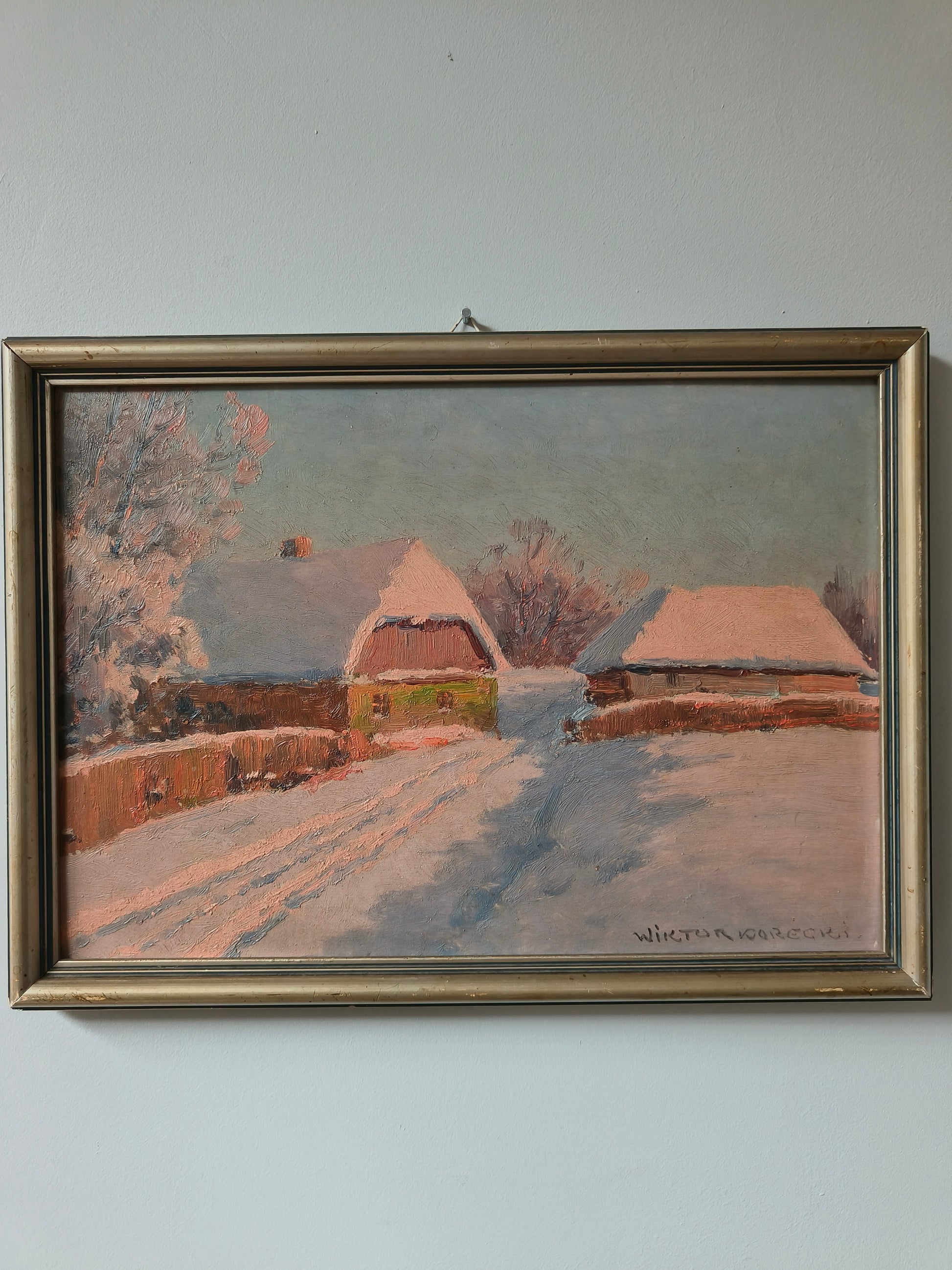 Obraz "Zimowy pejzaż" polskiego malarza pejzażysty Wiktora Koreckiego (1897-1980). Dzieło namalowane techniką olej na desce, przedstawia wiejski pejzaż zimą.