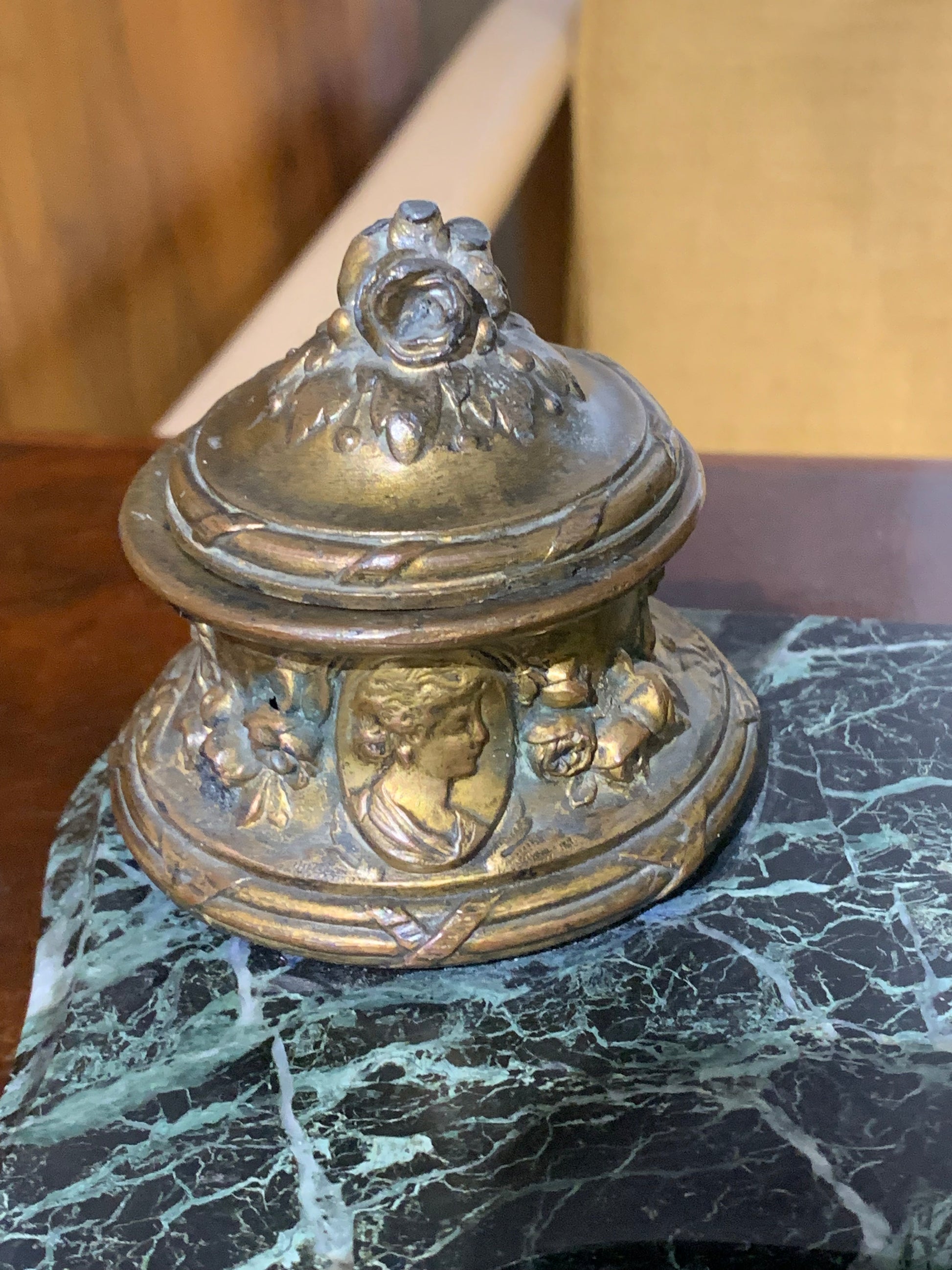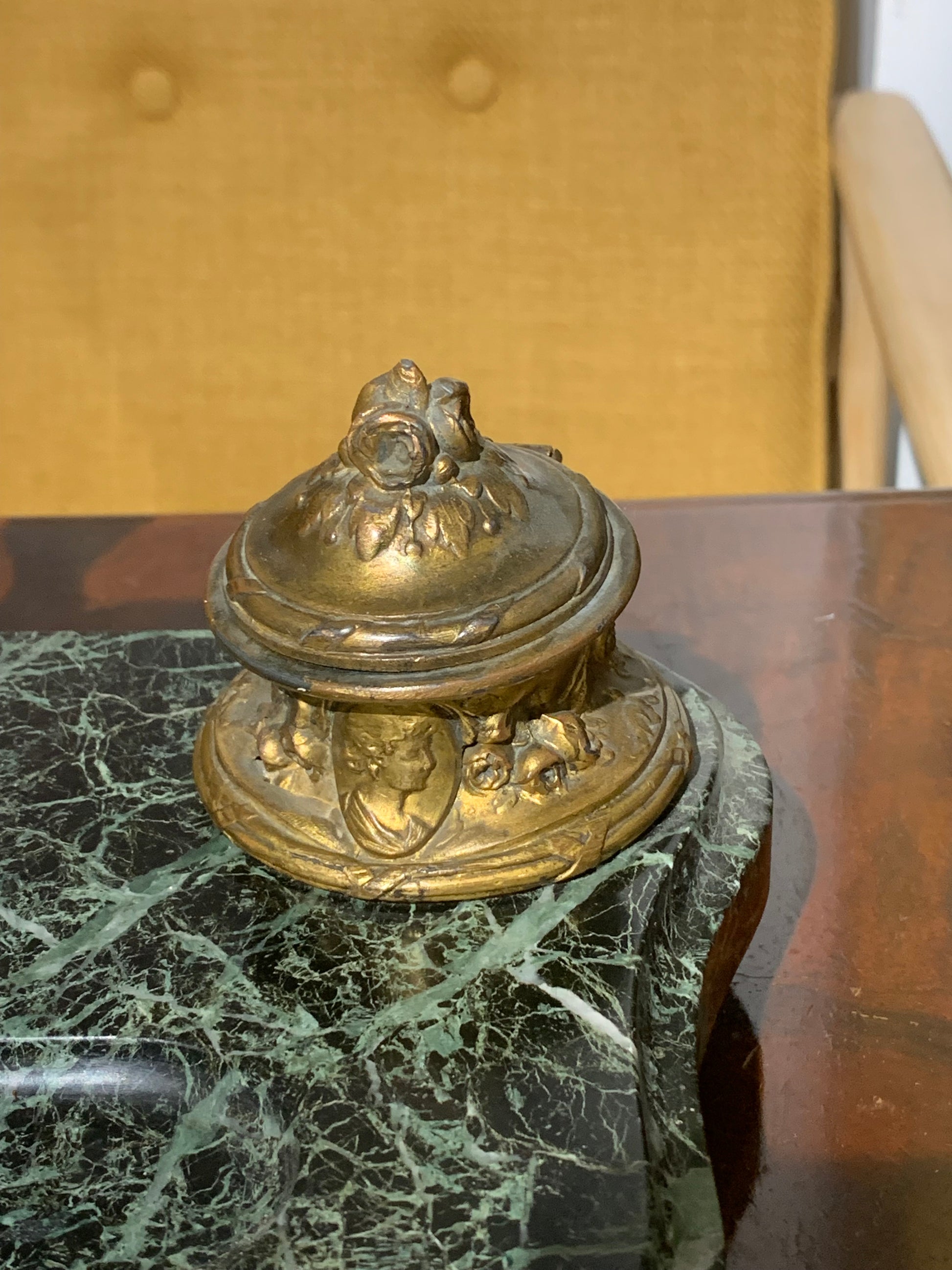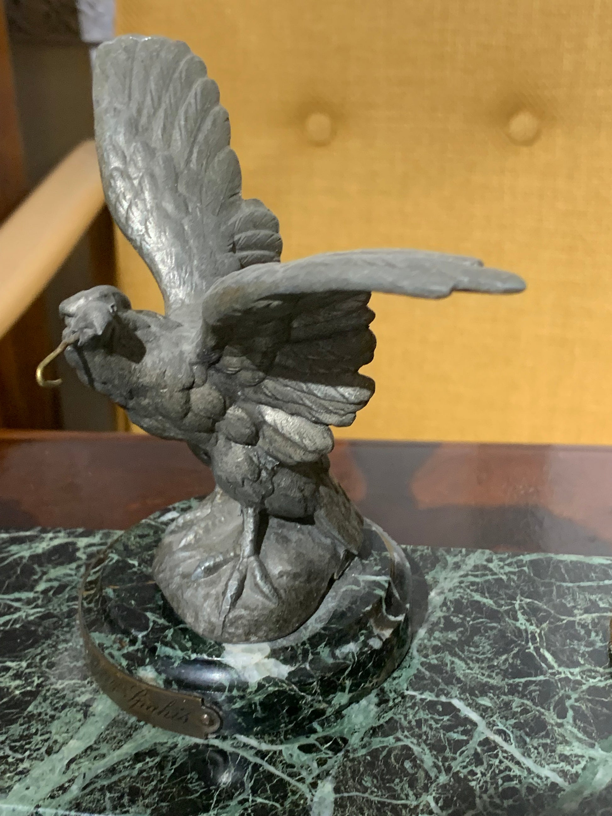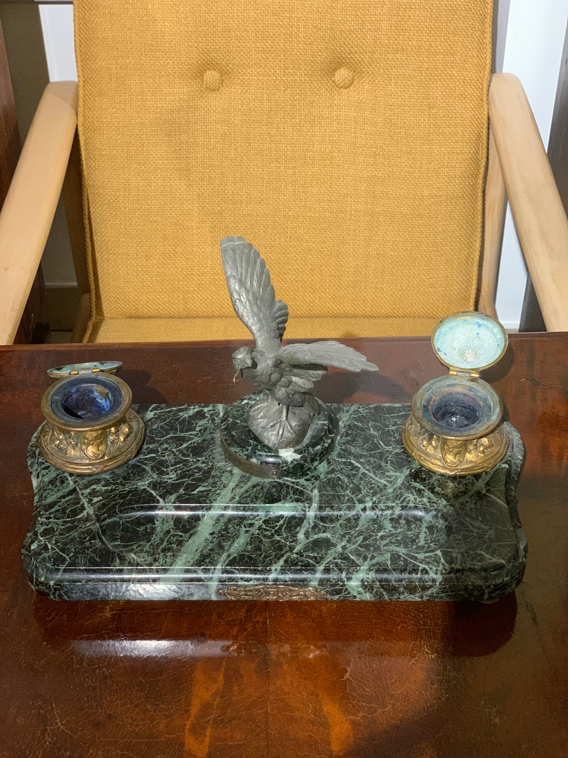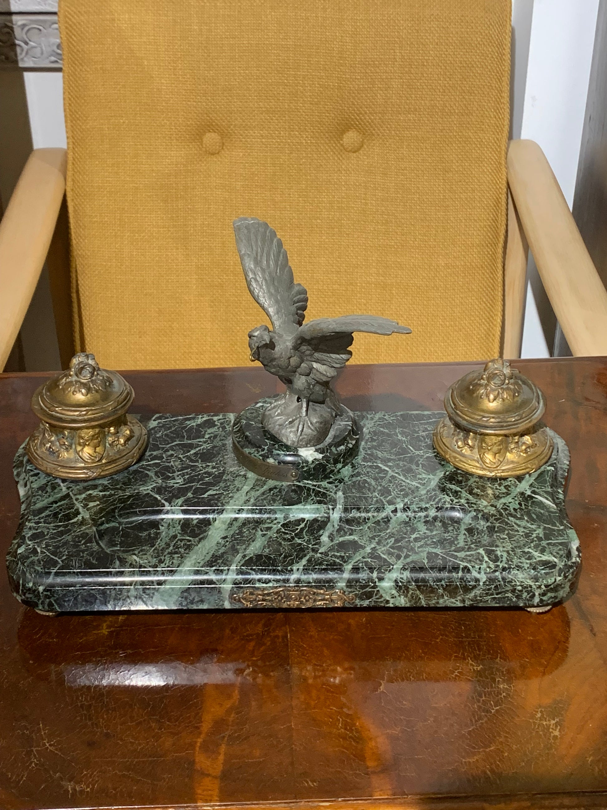 Ekrytuar, kałamarz na biurko z mosiądzu, podstawa z zielonego marmuru. Stan: dobry, zdobiony rzeźbą orła. Okres pochodzenia: lata 20-te XX w.