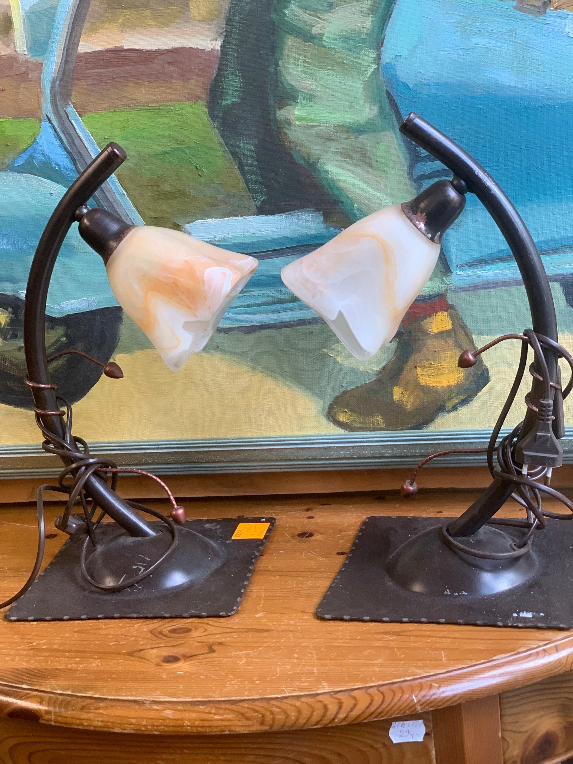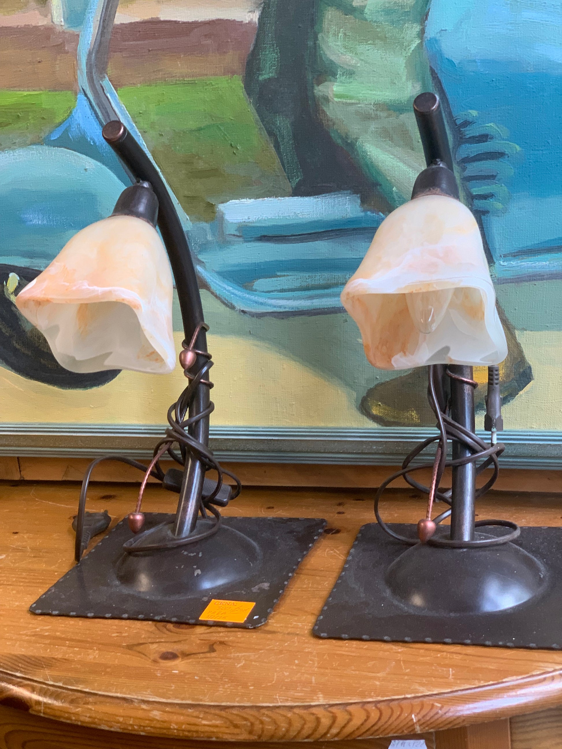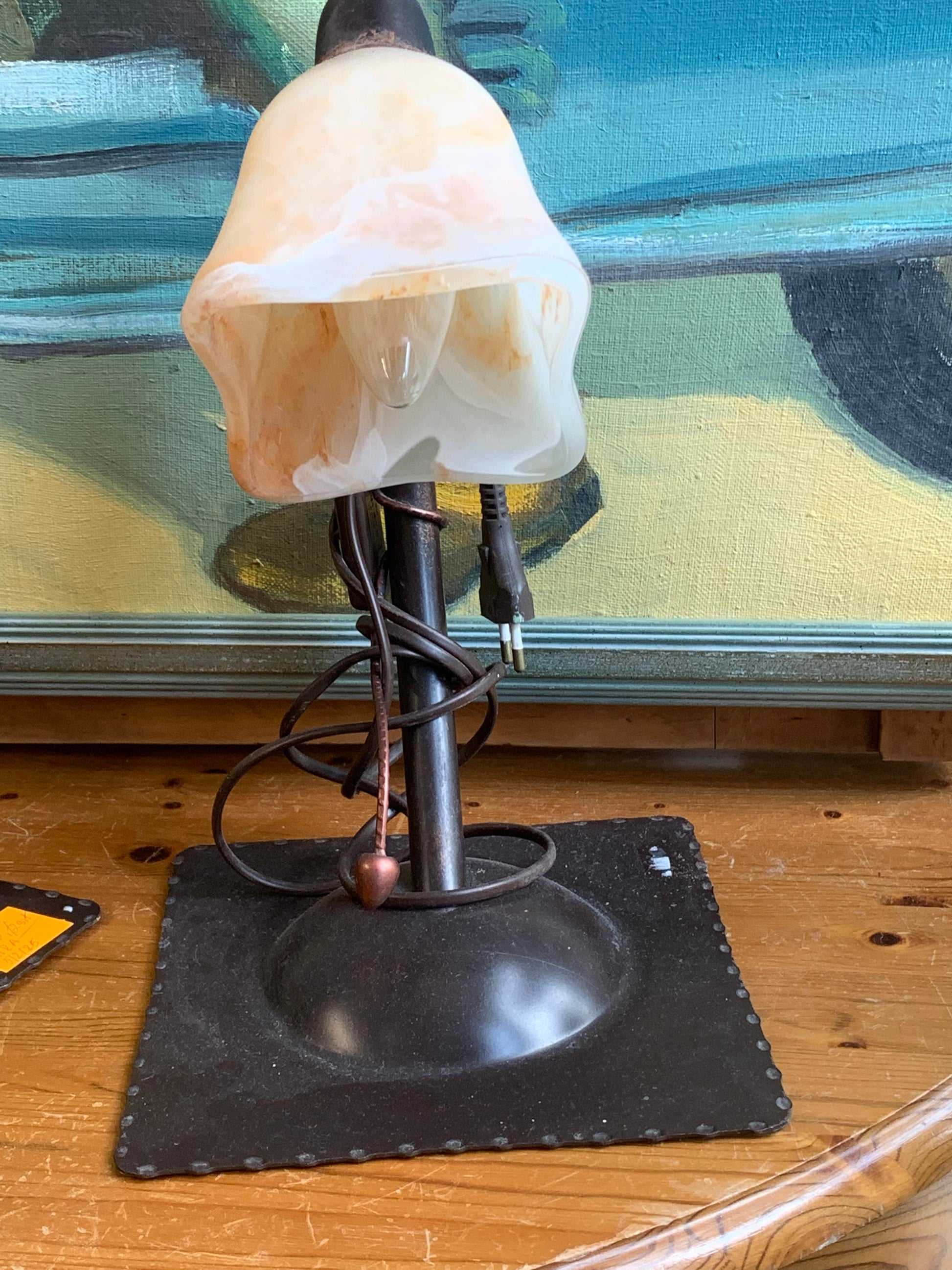 Urocza nocna lampa, podstawa z metalu w kolorze miedzianym, szklane klosze. Stan: dobry, działająca.