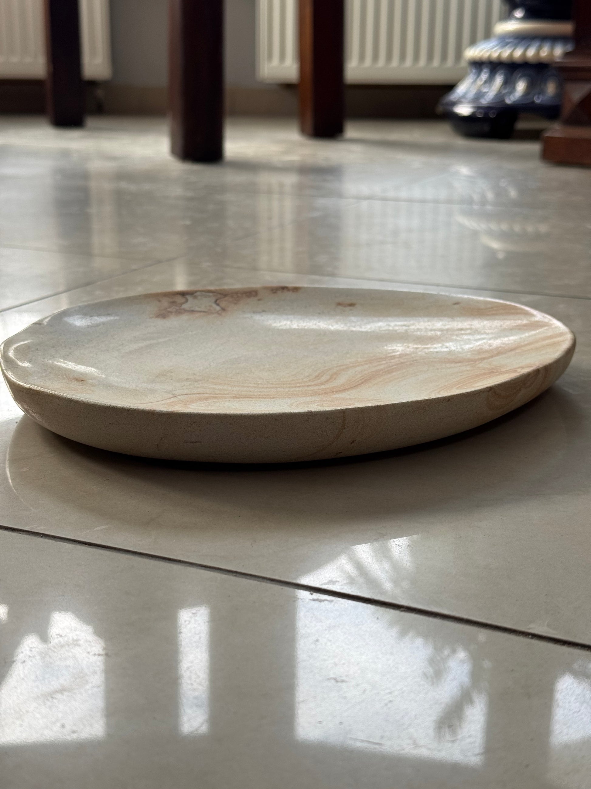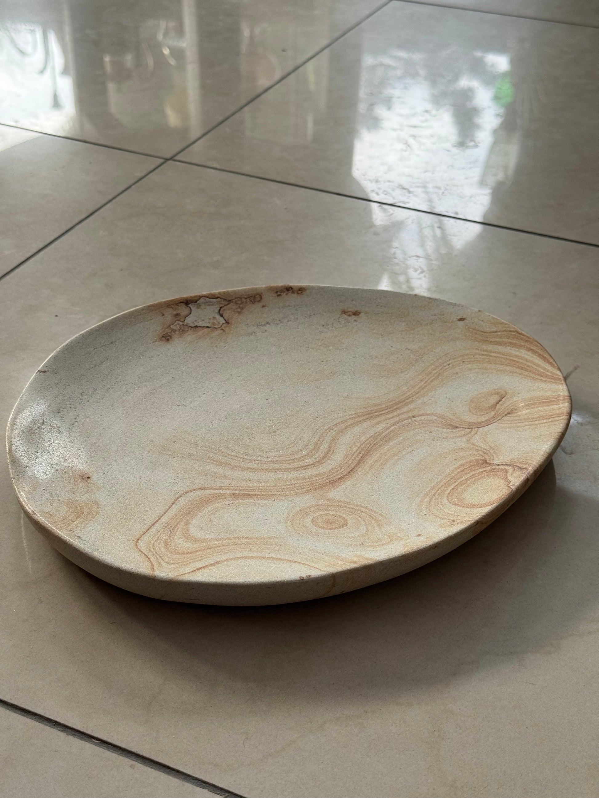 Patera, talerz dekoracyjny z piaskowca, ręcznie wykonana i wyszlifowana, pokryta szkliwem spożywczym.