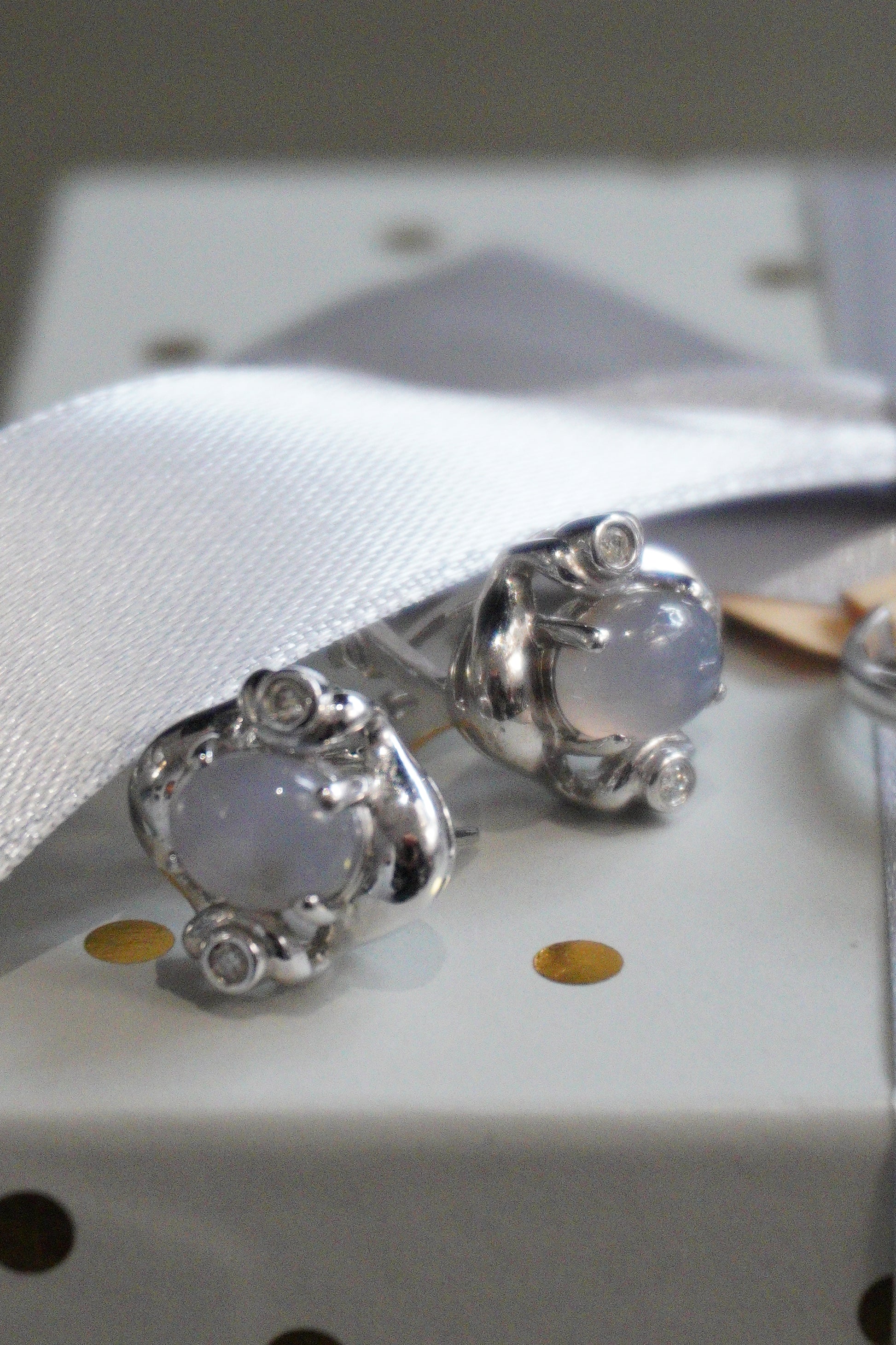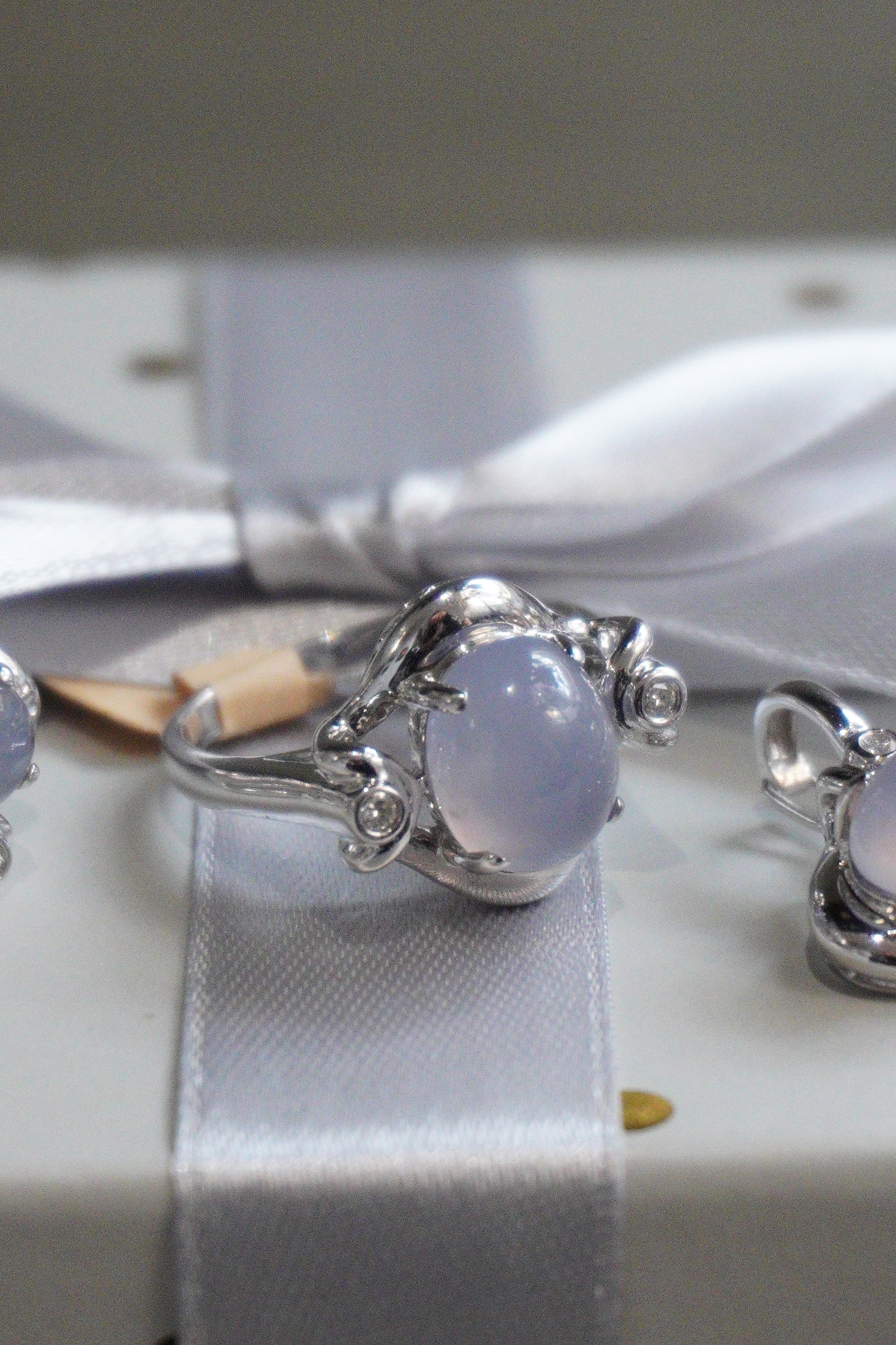 Komplet biżuterii z białego złota pr. 585 - pierścionek, kolczyki, zawieszka, z pięknym kamieniem księżycowym, waga 13,73 g.