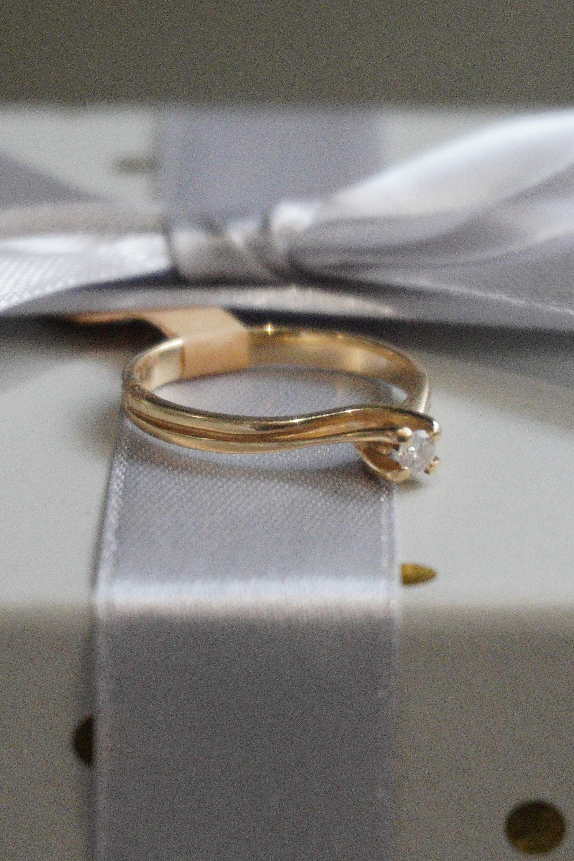 Stylowy pierścionek złoto pr. 750, diament brylantowy, waga 2,52 g, diament 0,08 ct, czystość SI 2, rozmiar 18.