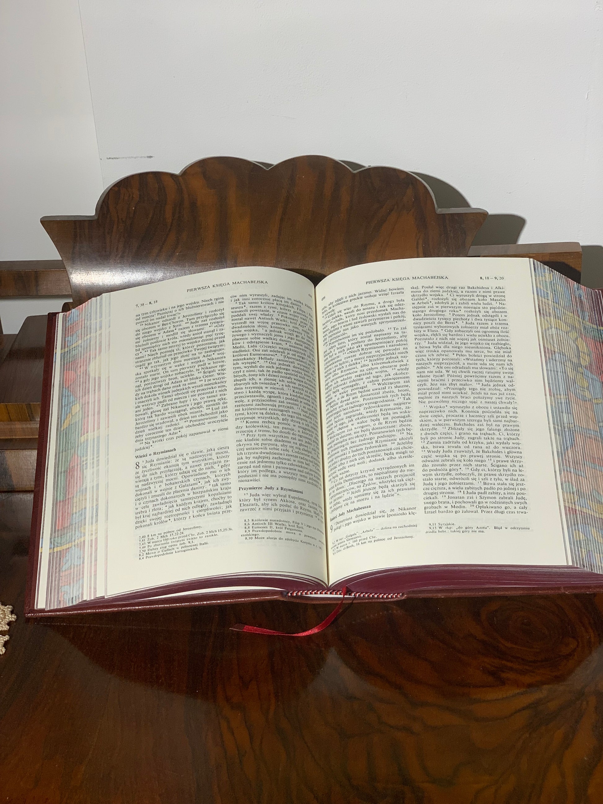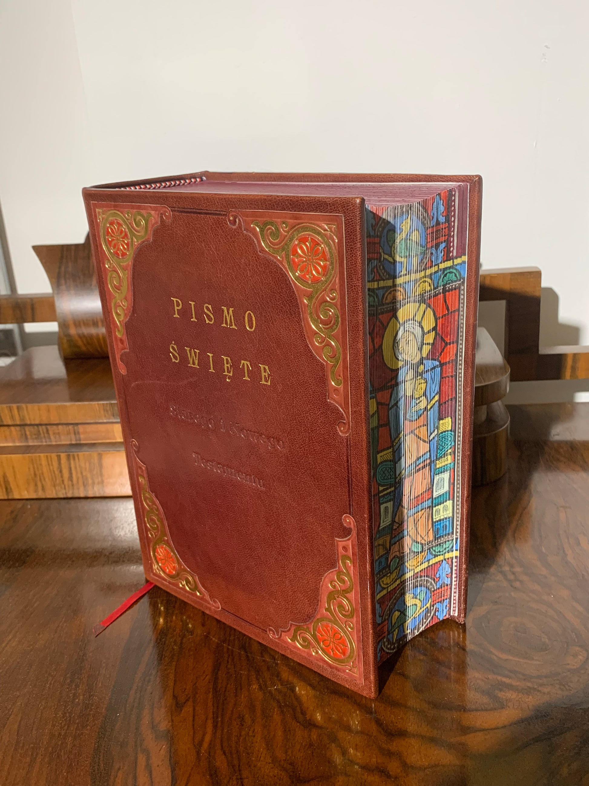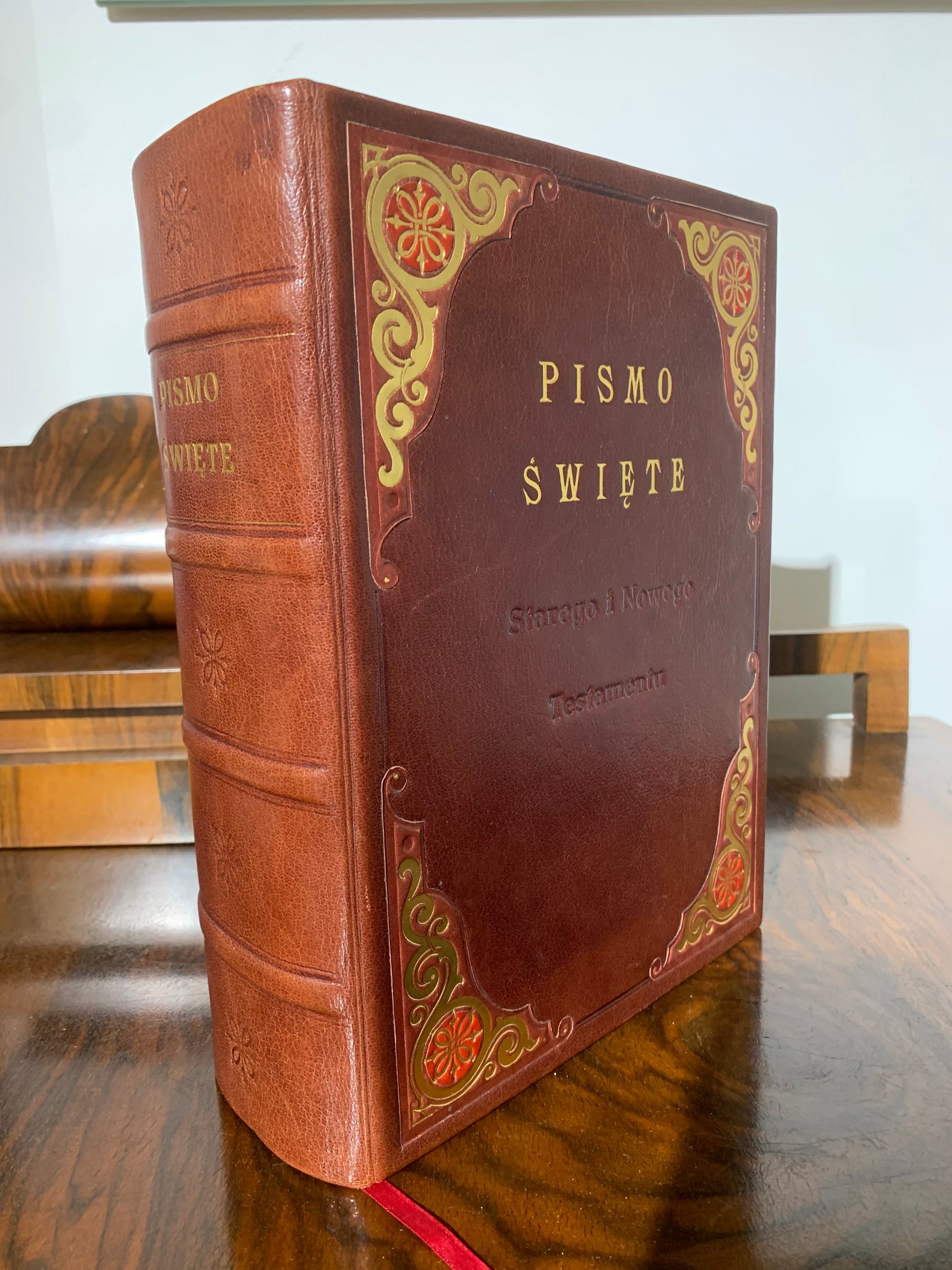 Niezwykły rarytas dla bibliofilów - Pismo Święte Starego i Nowego Testamentu wydane z okazji wizyty Jana Pawła II do Ojczyzny. Wydawnictwo Urszuli Kurtiak i Edwarta Ley'a, Koszalin 1991 r. Wydrukowano numerowanych 2000 egzemplarzy. Kolekcjonerskie wydanie Pisma Świętego kolorowo ilustrowane, oprawione w skórę, złocone, wytłaczane. Pismo Święte jest nie tylko tekstem liturgicznym, ale i ciągle żywym arcydziełem literackim. Stan - bardzo dobry.