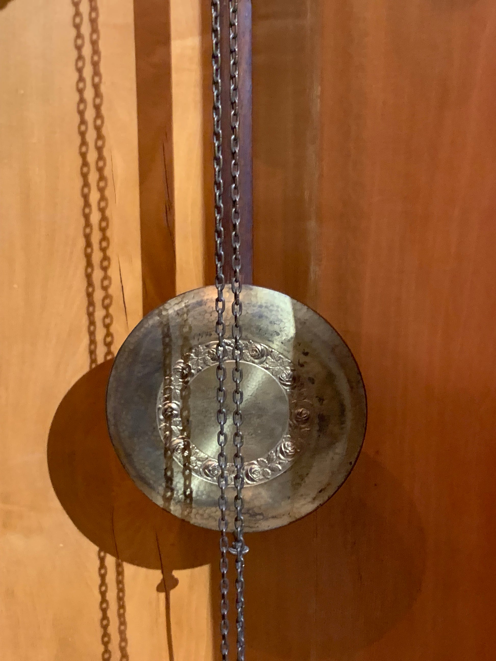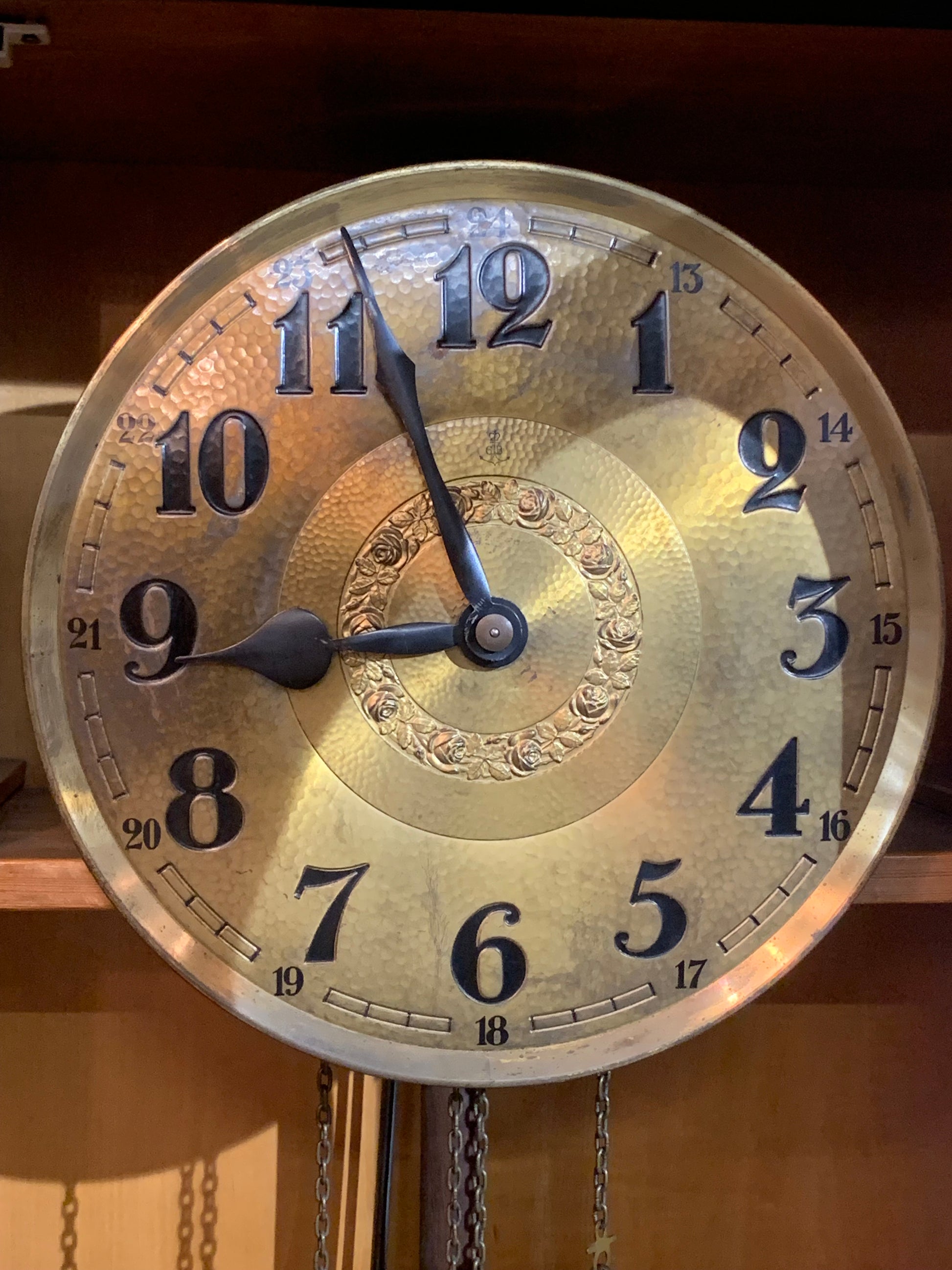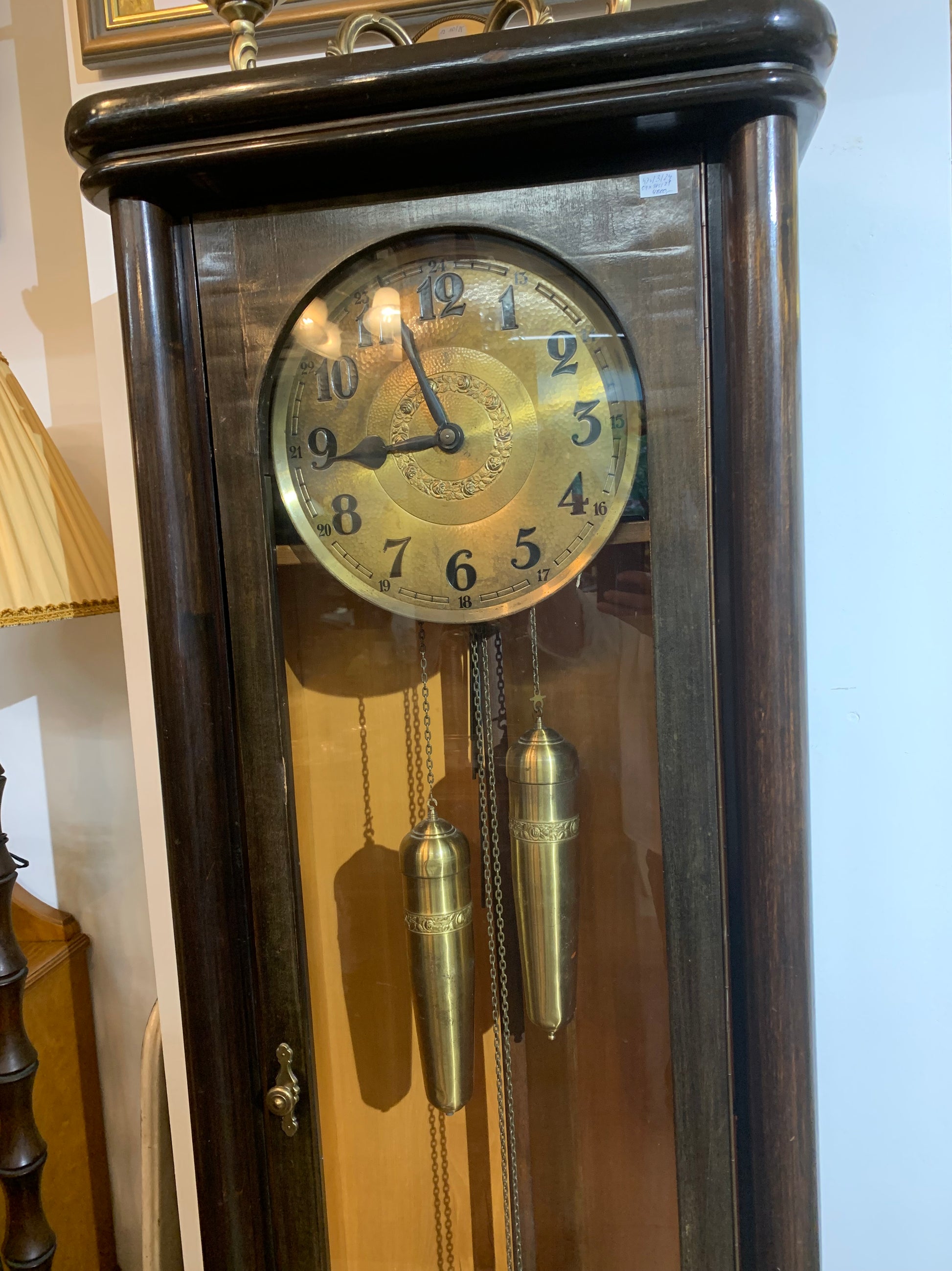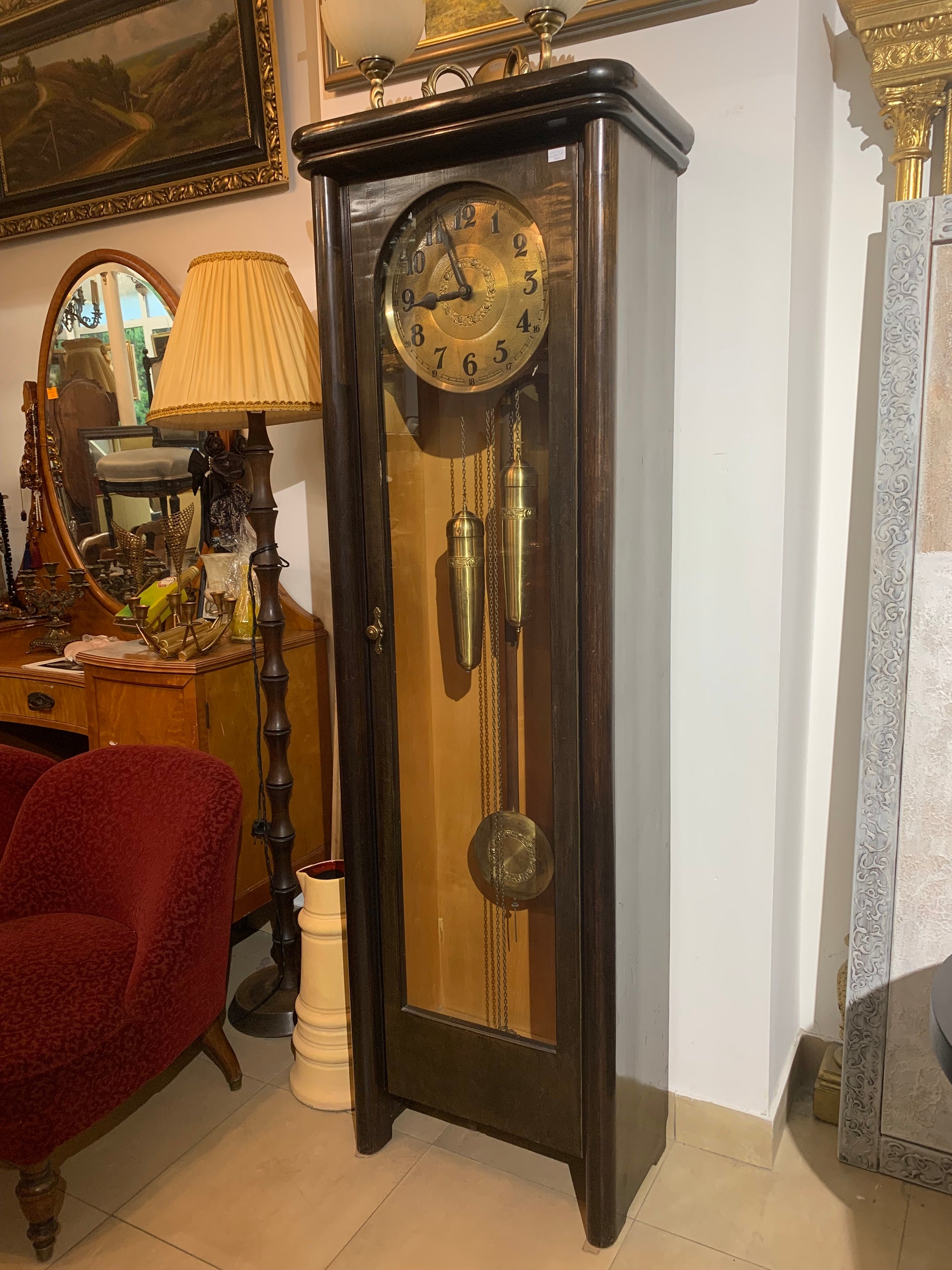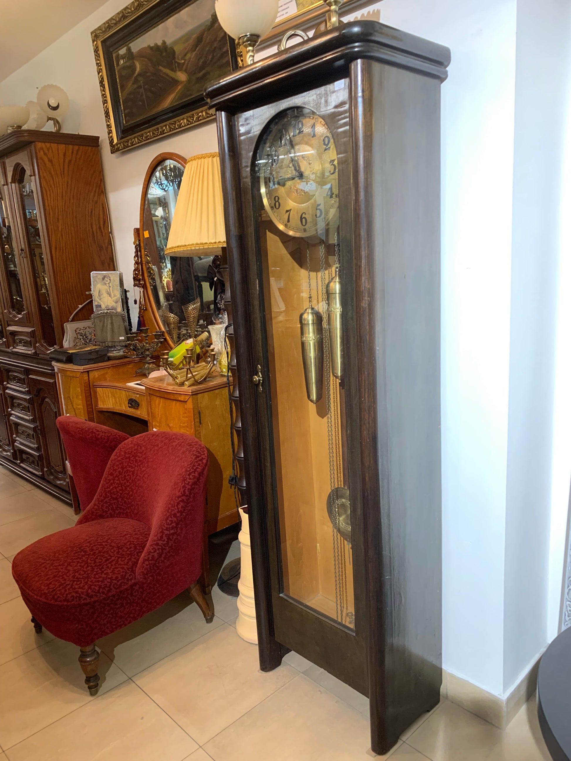Przedwojenny zegar podłogowy, wagowy w dębowej obudowie z lat 20 ch. Mechanizm niemiecki, piękna tarcza, bicie co pół godziny. Stan obudowy: dobry, mechanizm - do przeglądu u zegarmistrza.