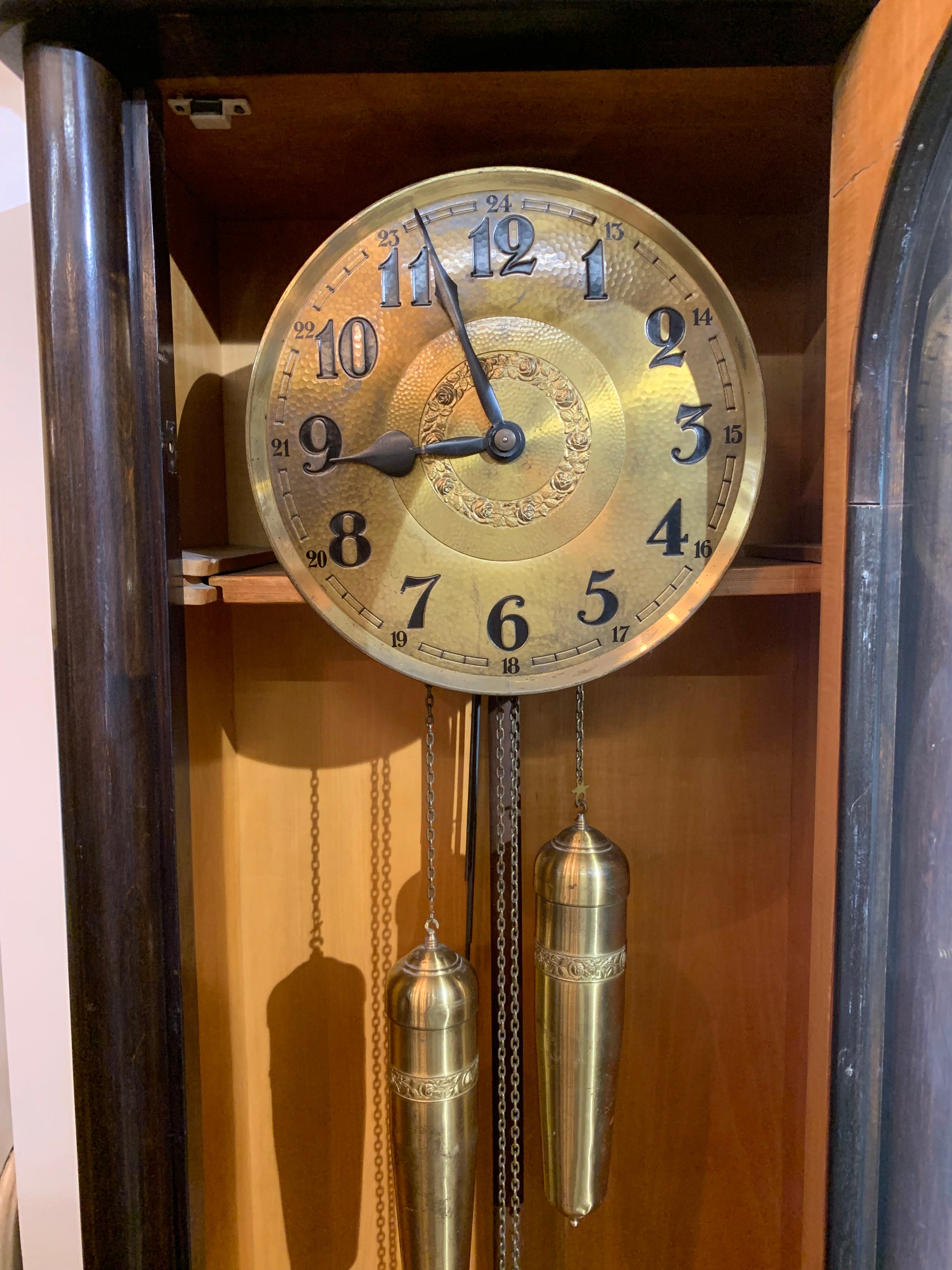 Przedwojenny zegar podłogowy, wagowy w dębowej obudowie z lat 20 ch