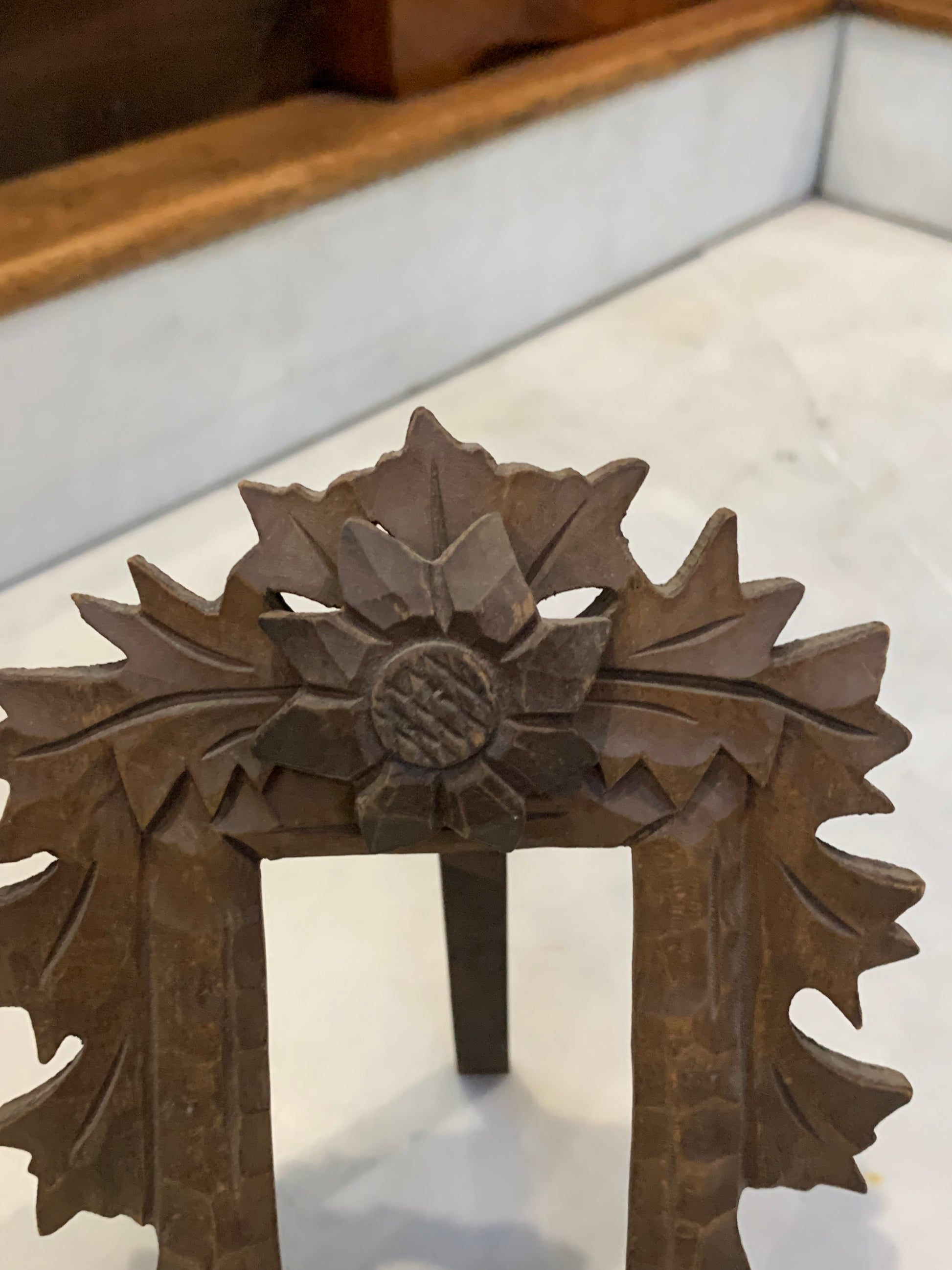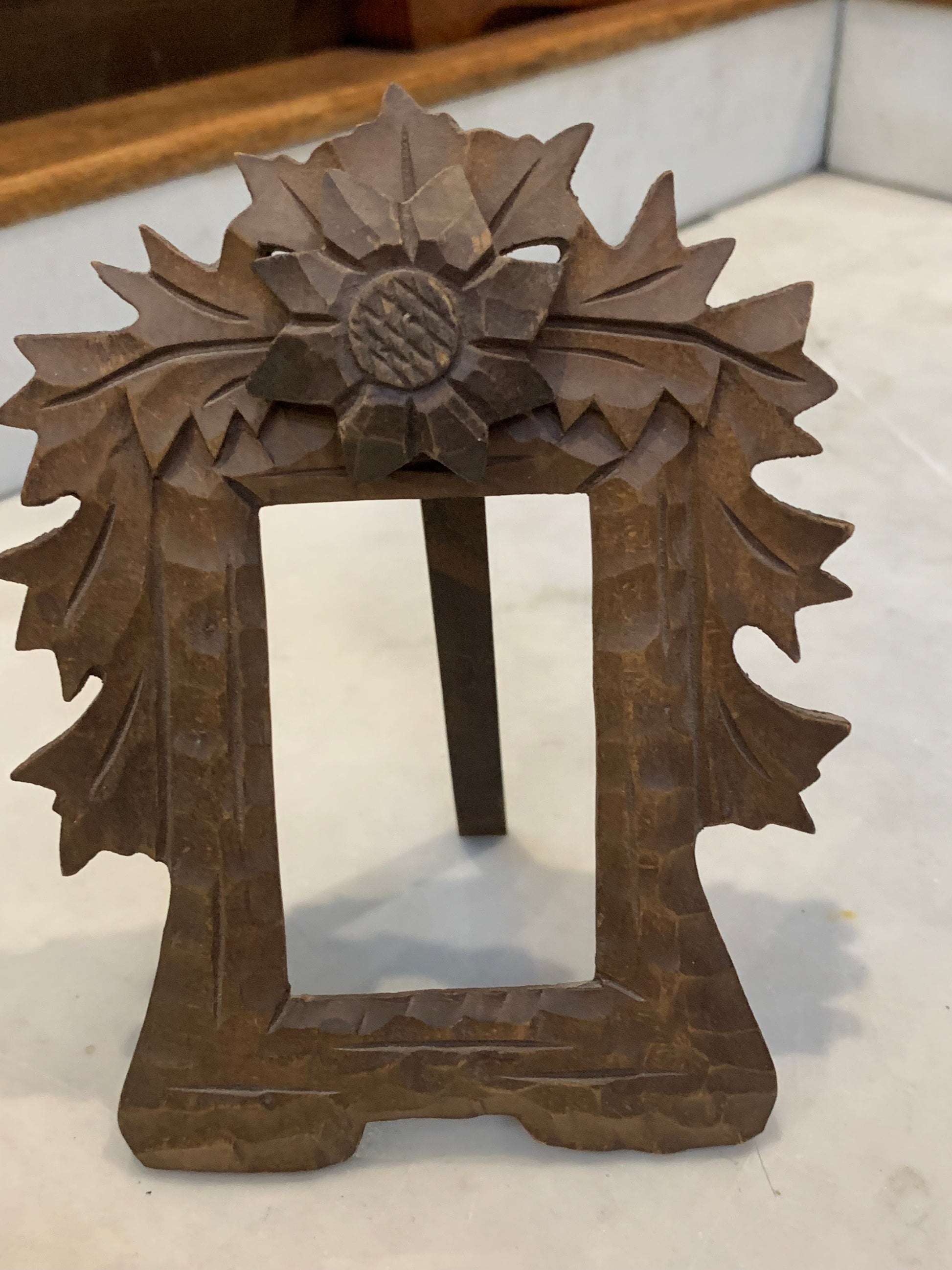Ramka mała, drewniana, rzeźbiona, na stojaku, ręcznie zdobiona motywem roślinnym.