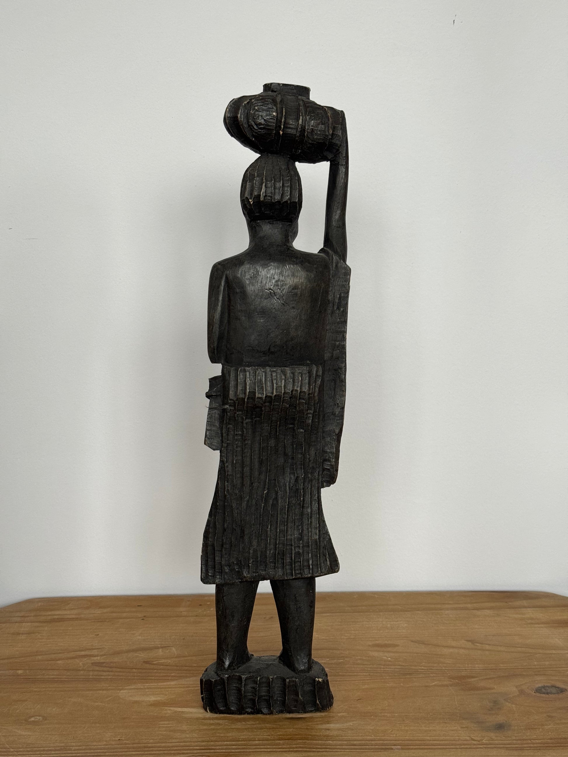 Rzeźba z czarnego drewna, przedstawiająca kobietę niosącą dzban.
