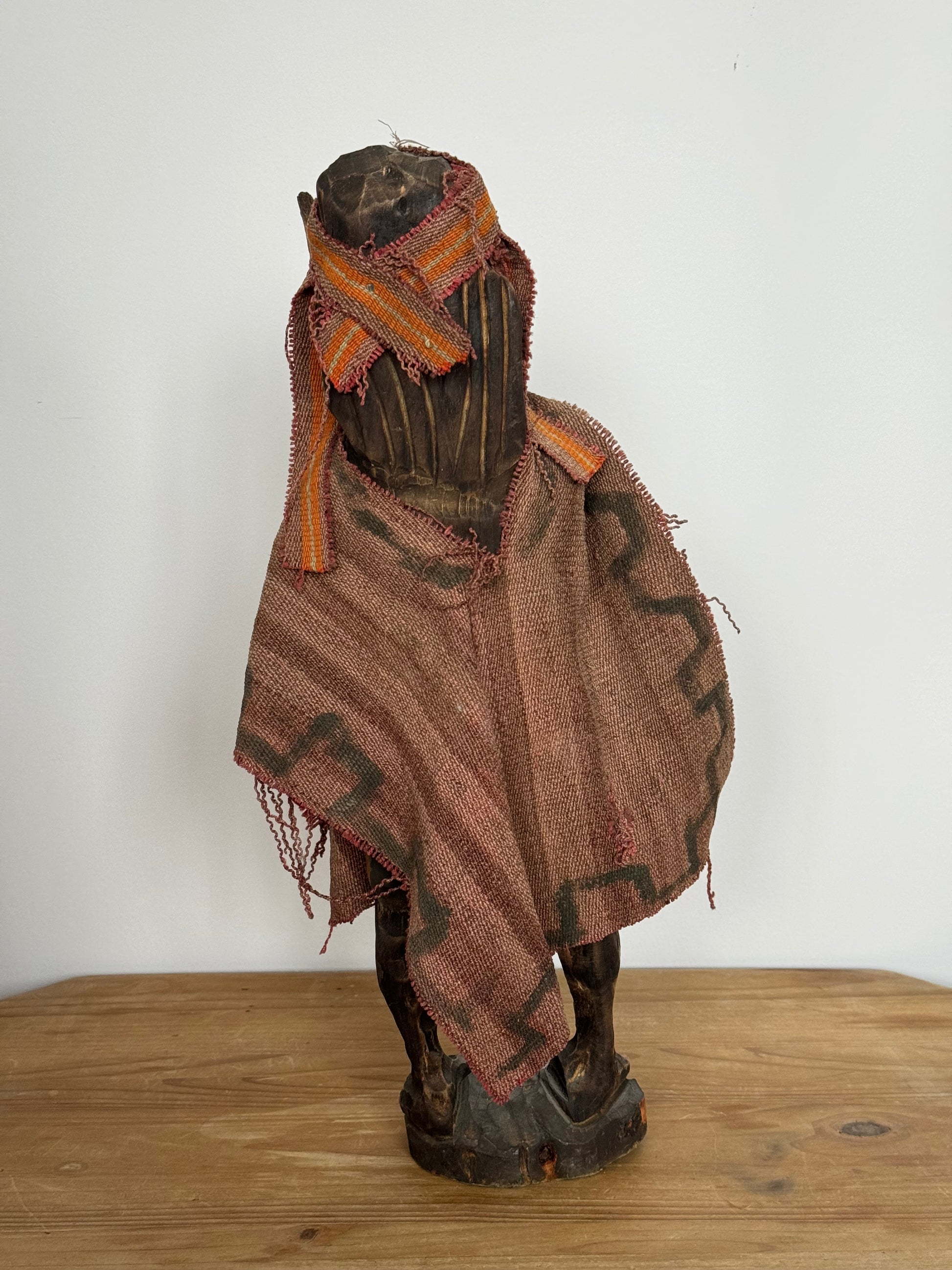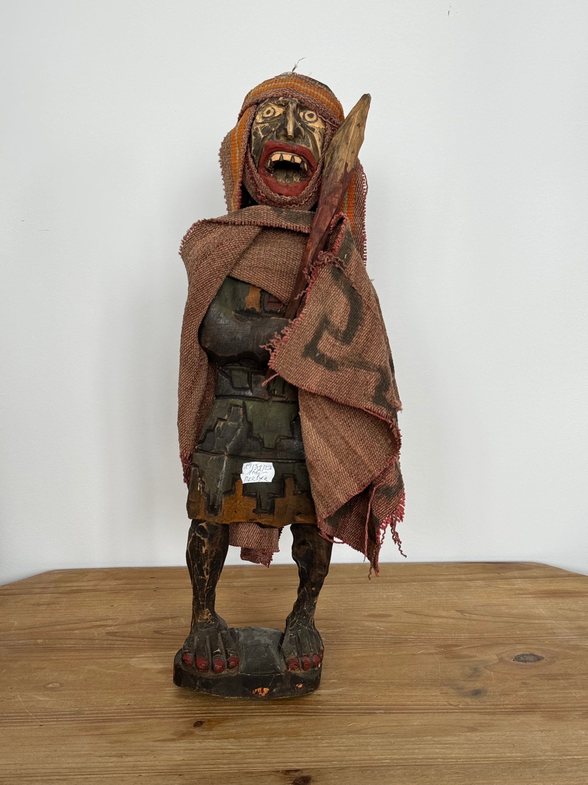Drewniana rzeźba przedstawiająca przerażającego azteckiego wojownika z ponczo.