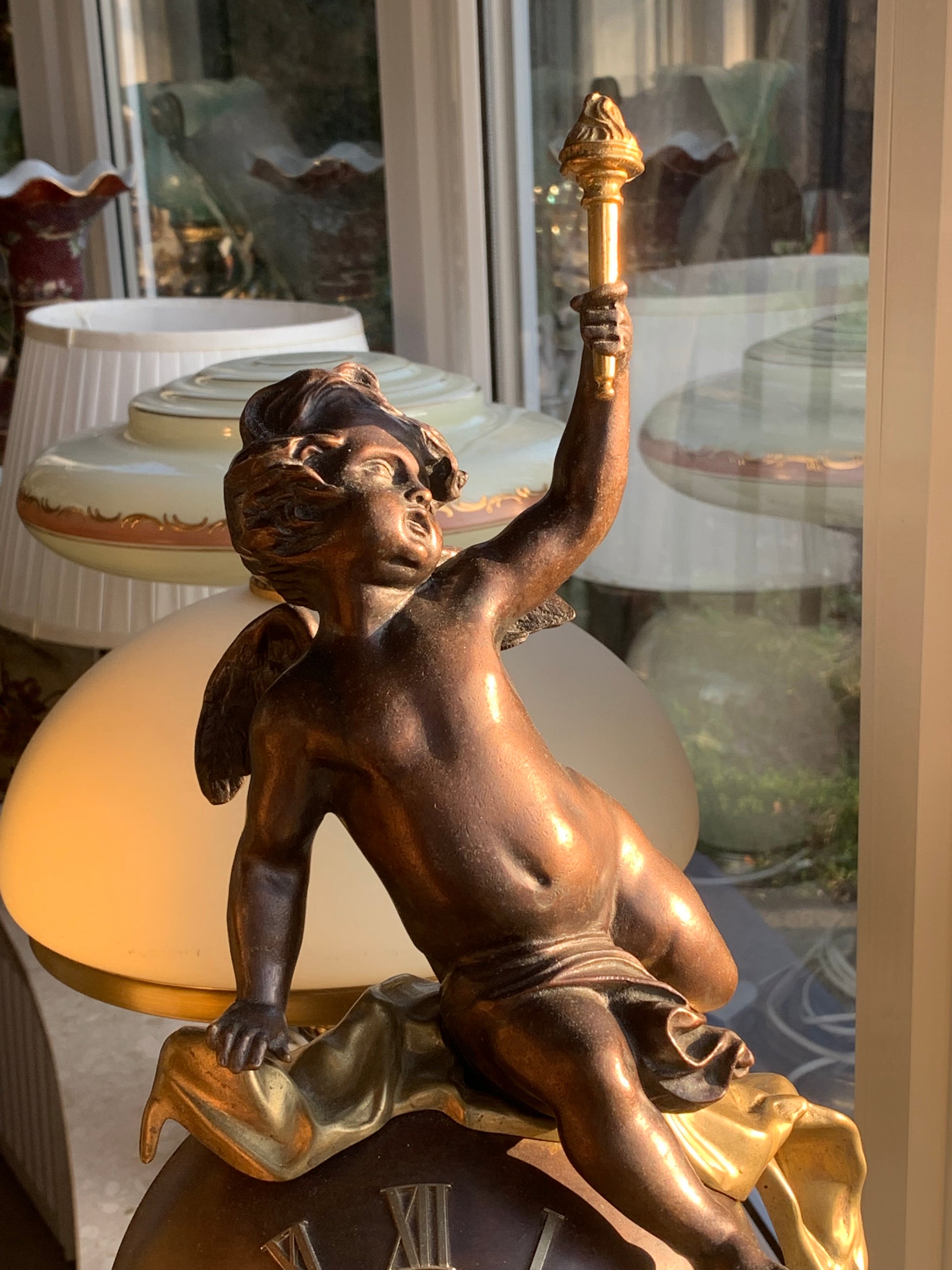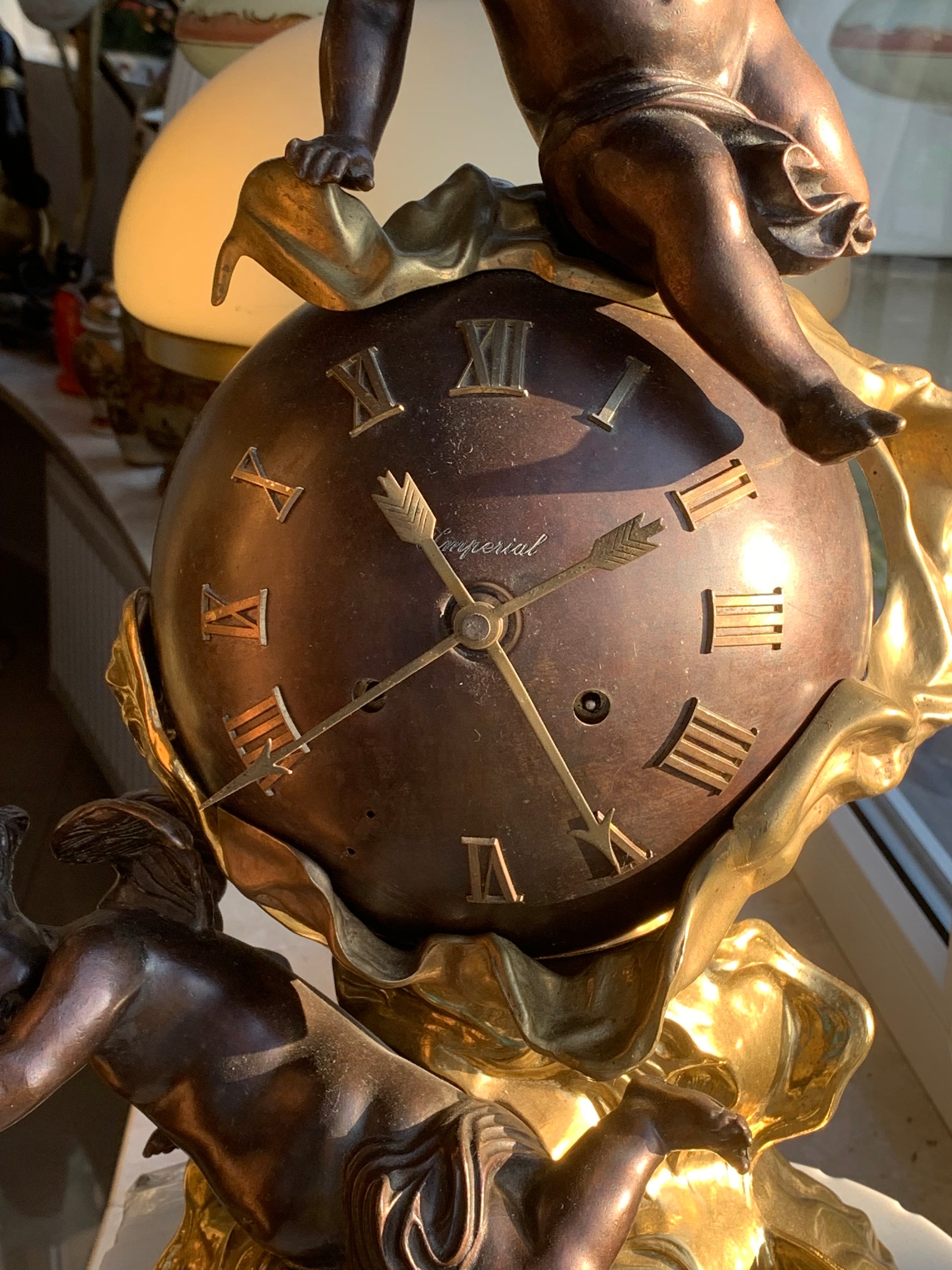 Zegar włoski, w stylu barokowym kula z aniołami na kamiennej podstawie, złocenia. Stan - działający.