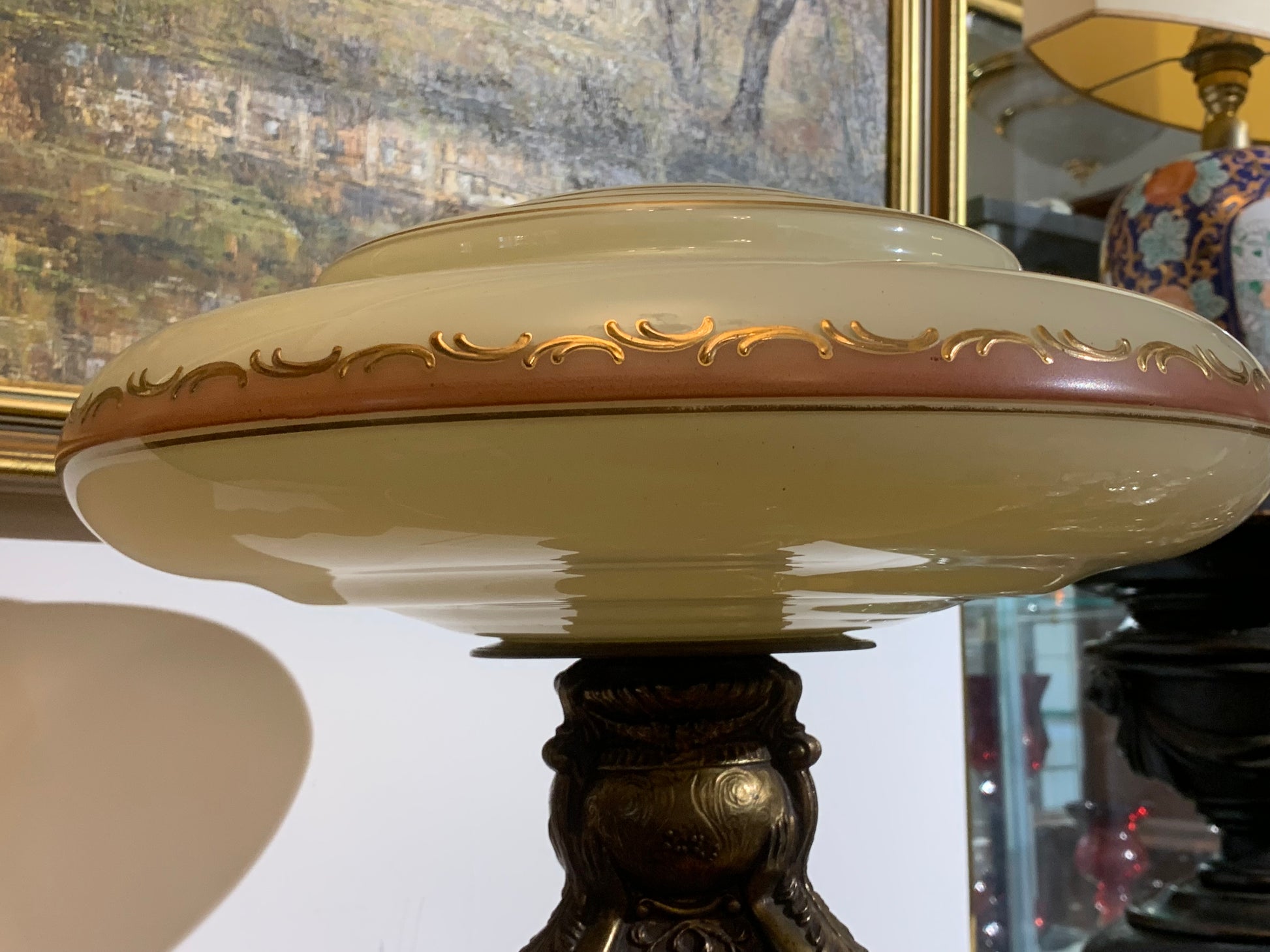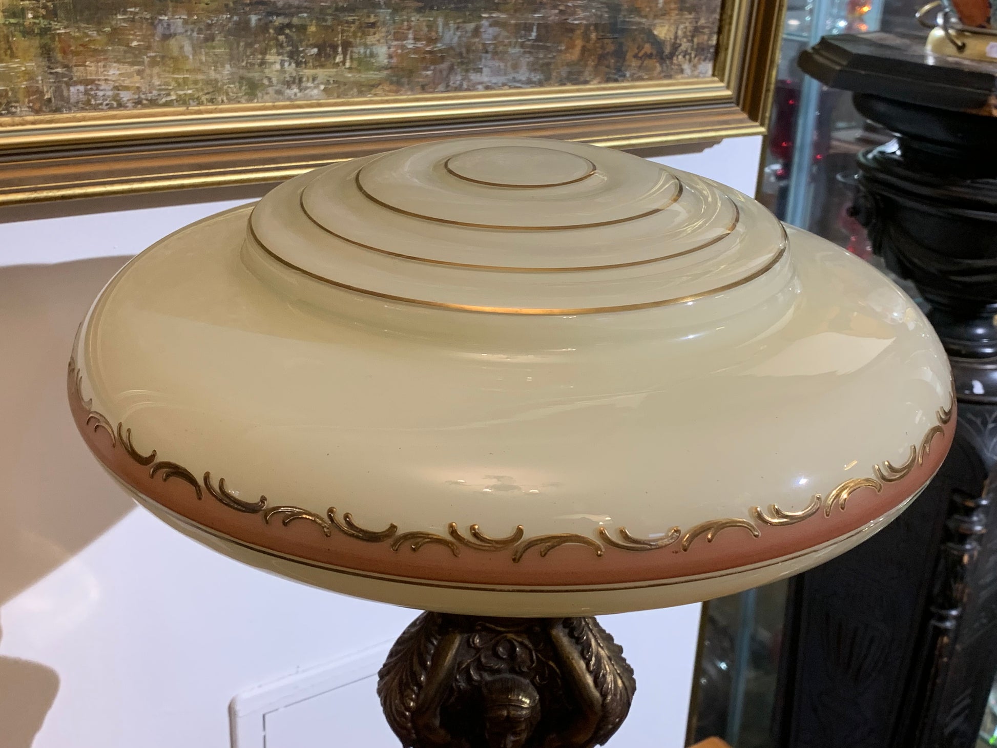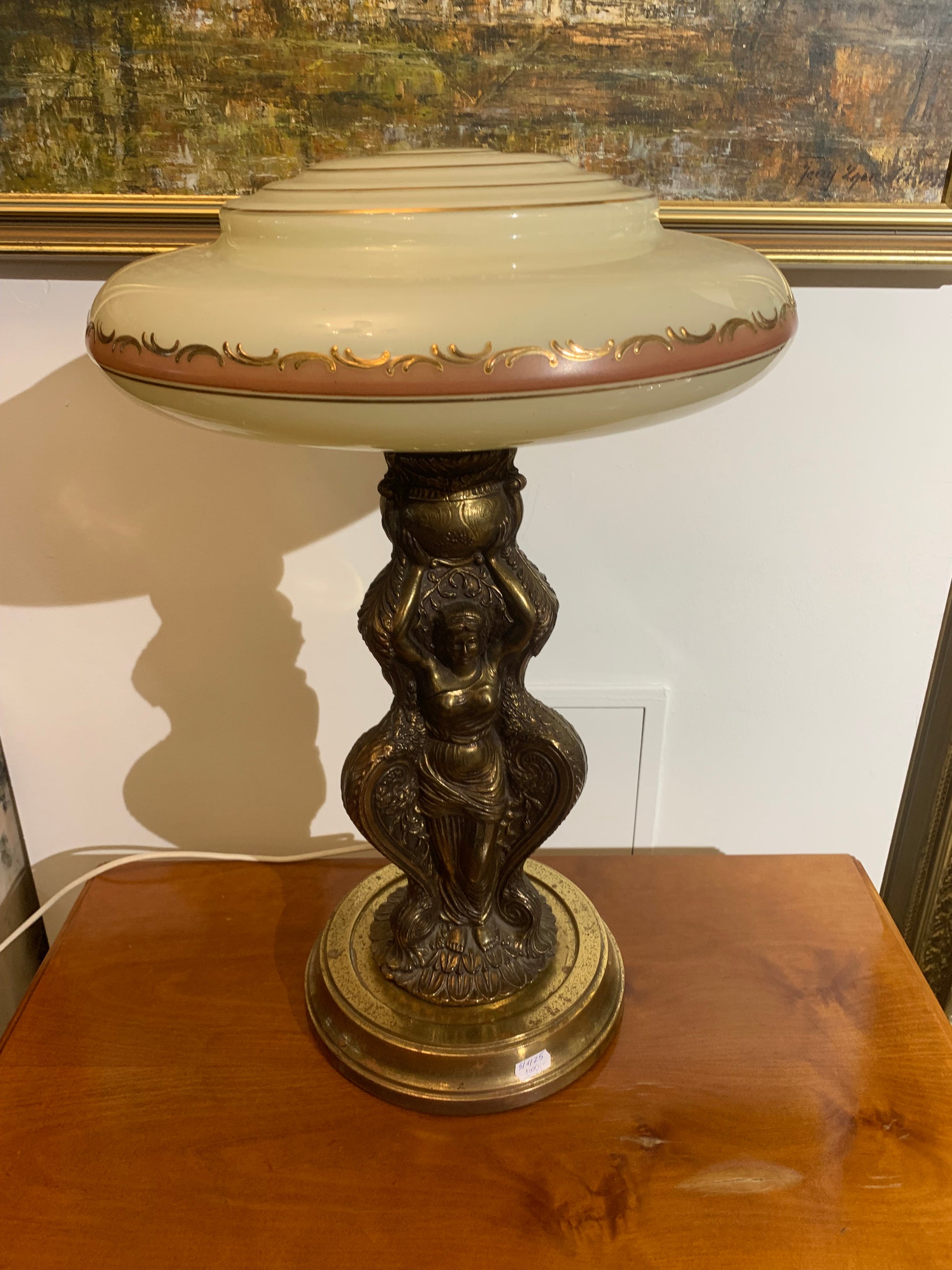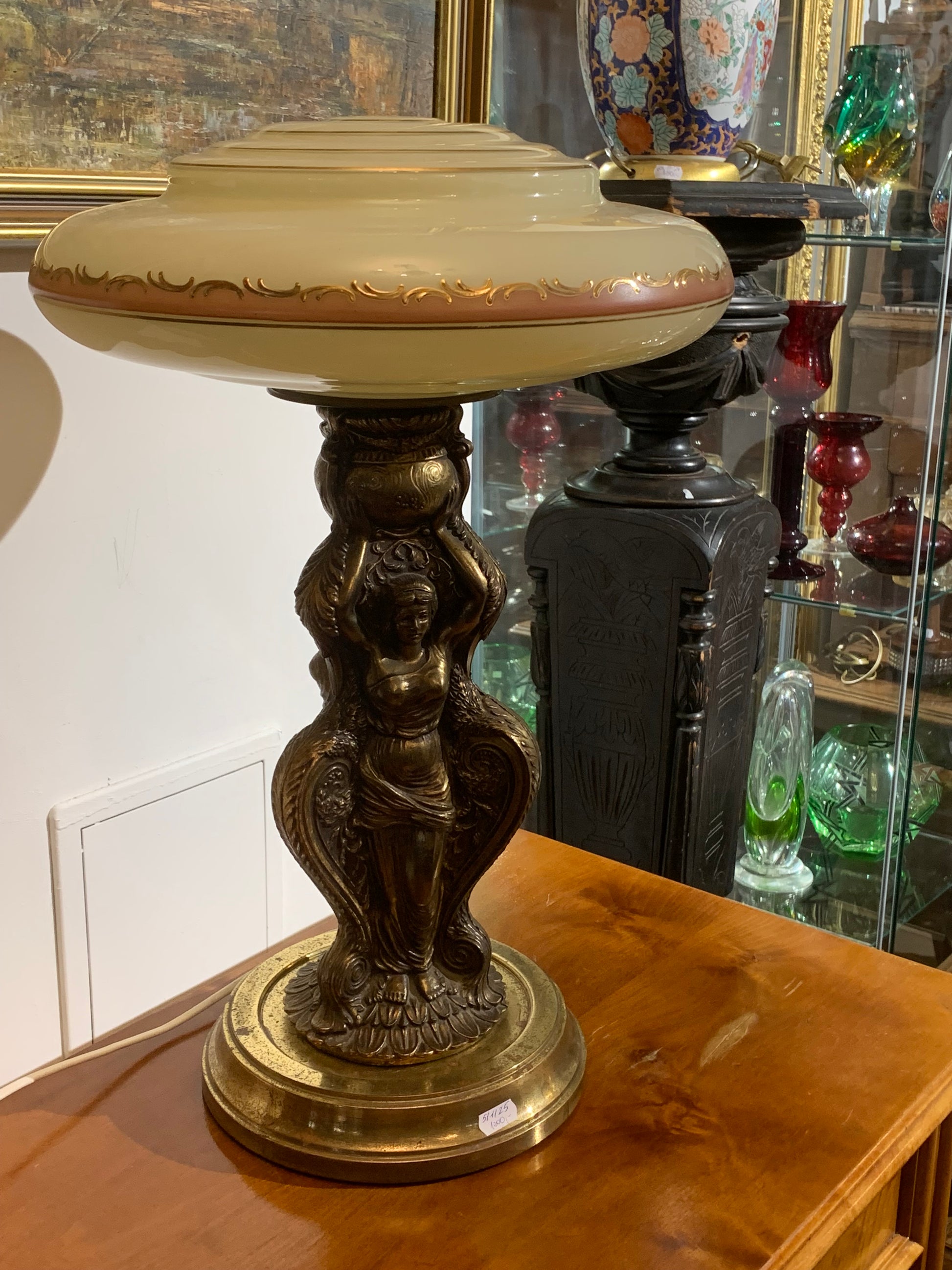 Secesyjna lampa na mosiężnej podstawie trzy Gracje, duży, szklany klosz, działająca. Wymiary: wysokość 54 cm, klosz średnica ok. 40 cm