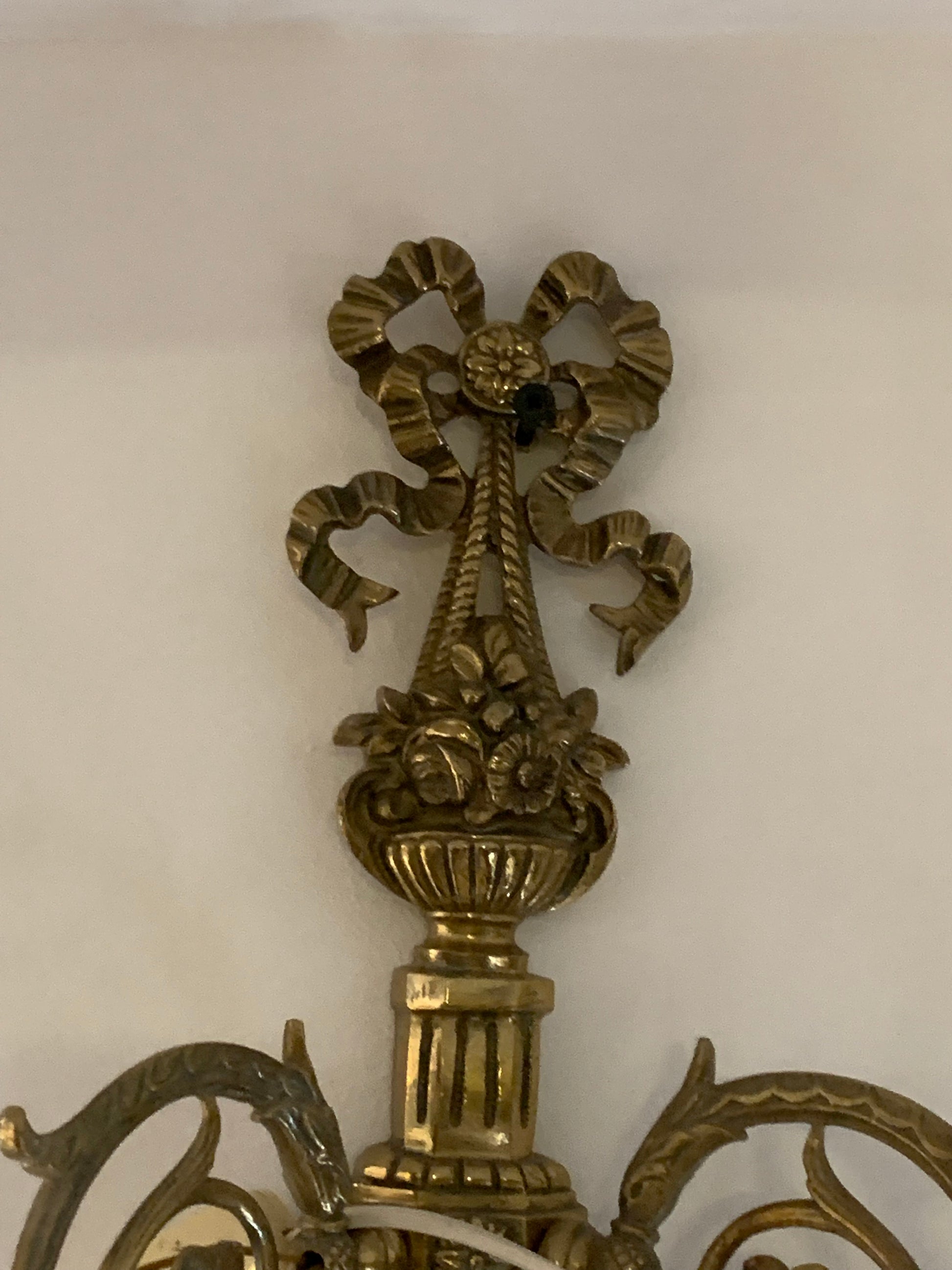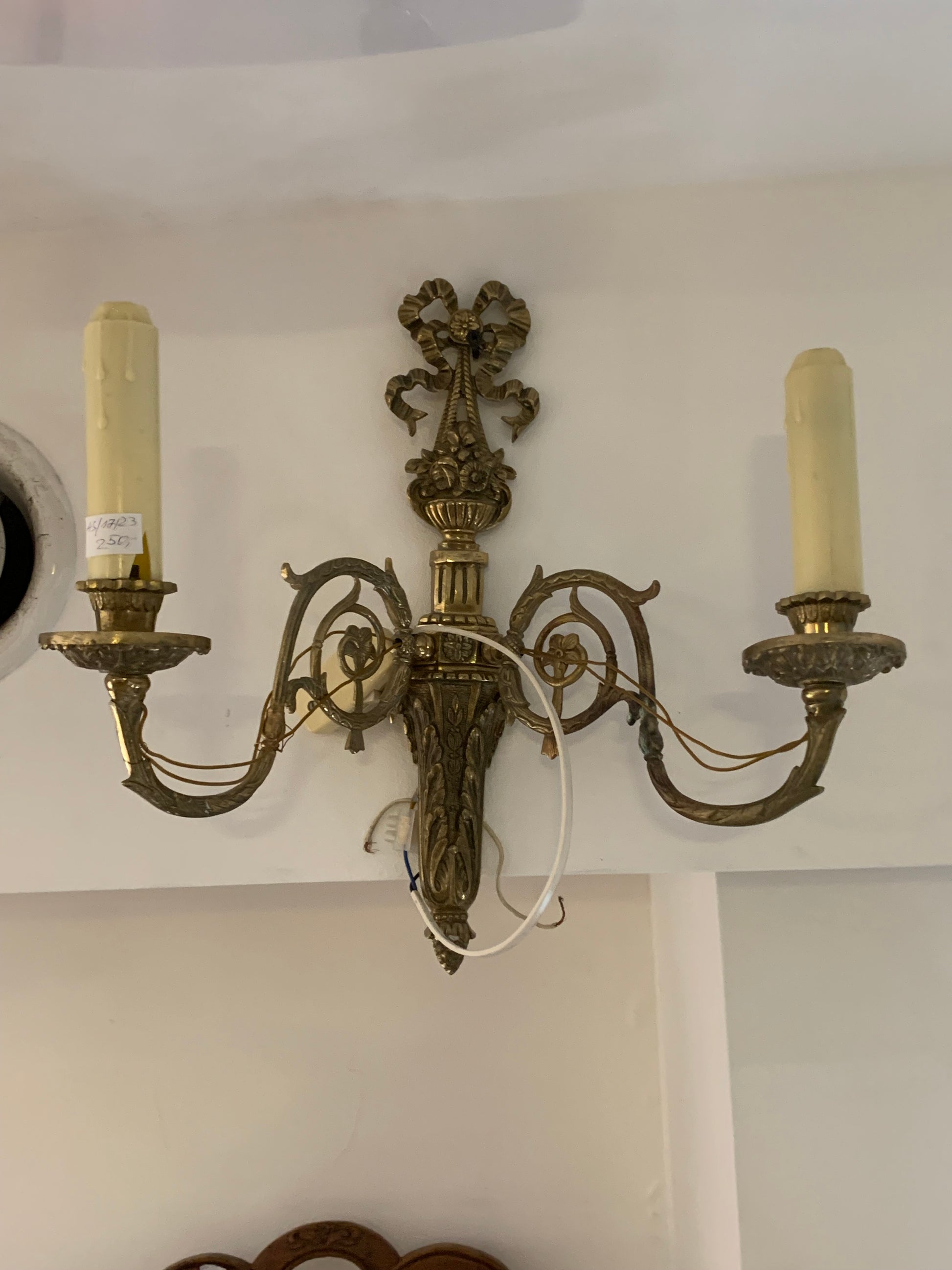 Secesyjny kinkiet z mosiądzu na dwie świece, zdobiony kokardą i motywem roślinnym. Stan: sprawny.