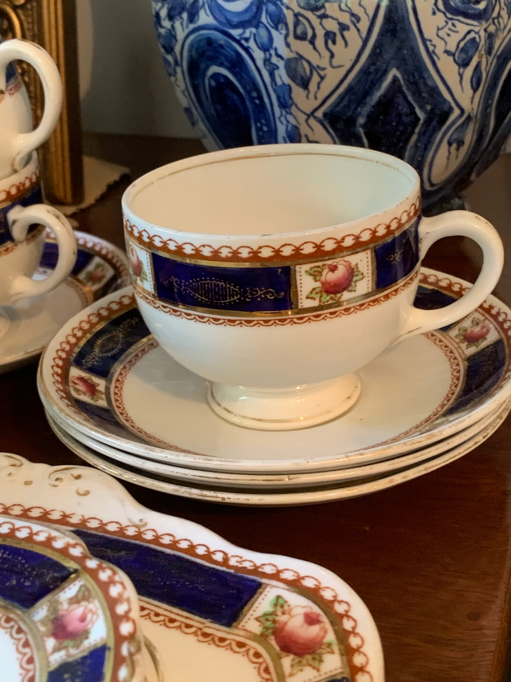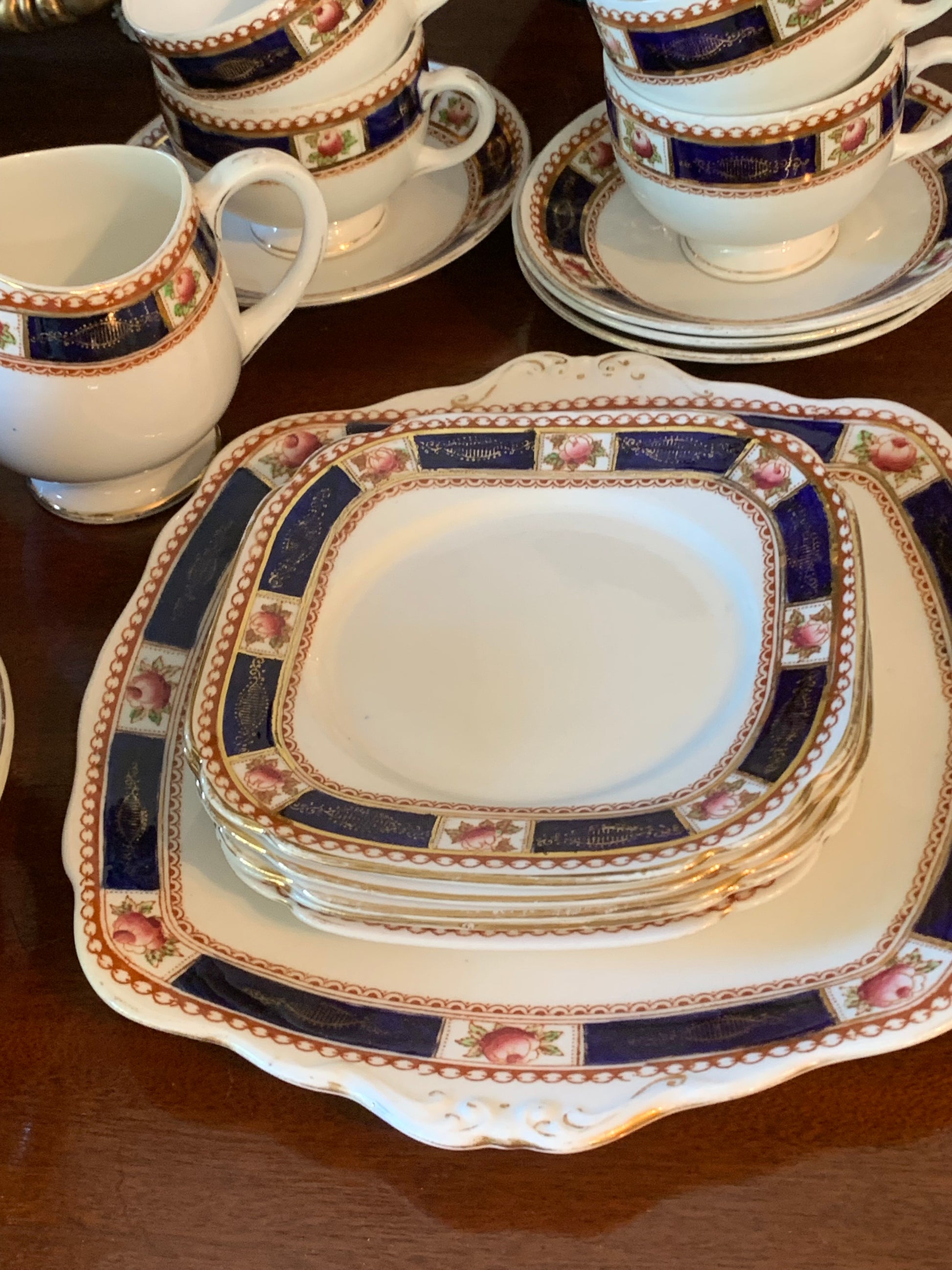 Serwis z angielskiej porcelany na 4 osoby sygnowany Royal Albert, biało kobaltowy, złocenia. Do kompletu wchodzą: 4 filiżanki ze spodkami, mlecznik, cukiernica, 6 talerzyków deserowych, 1 paterka na ciasto.