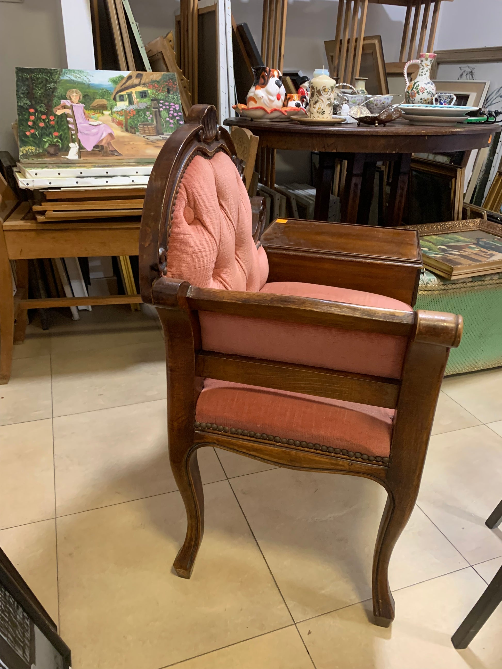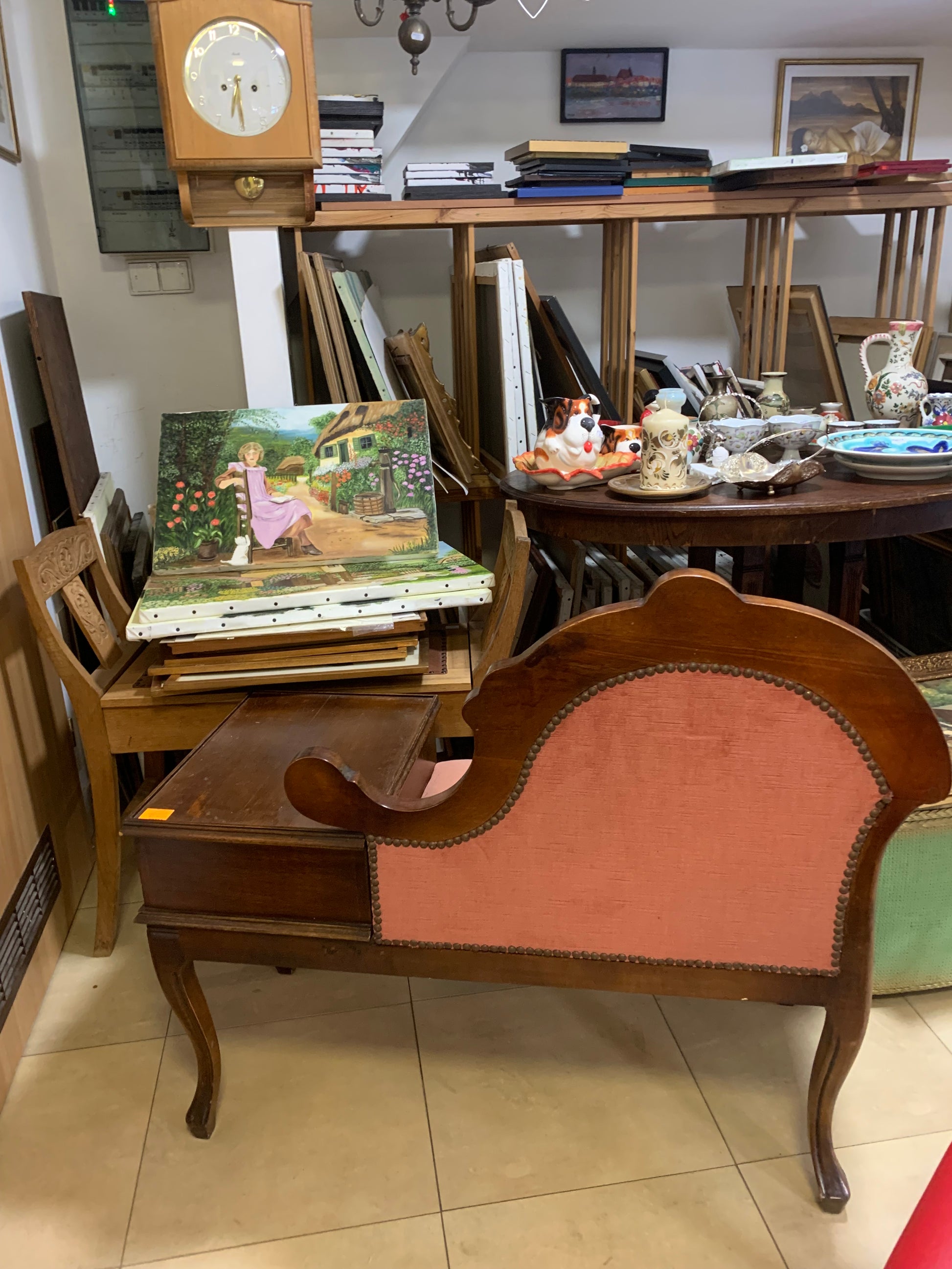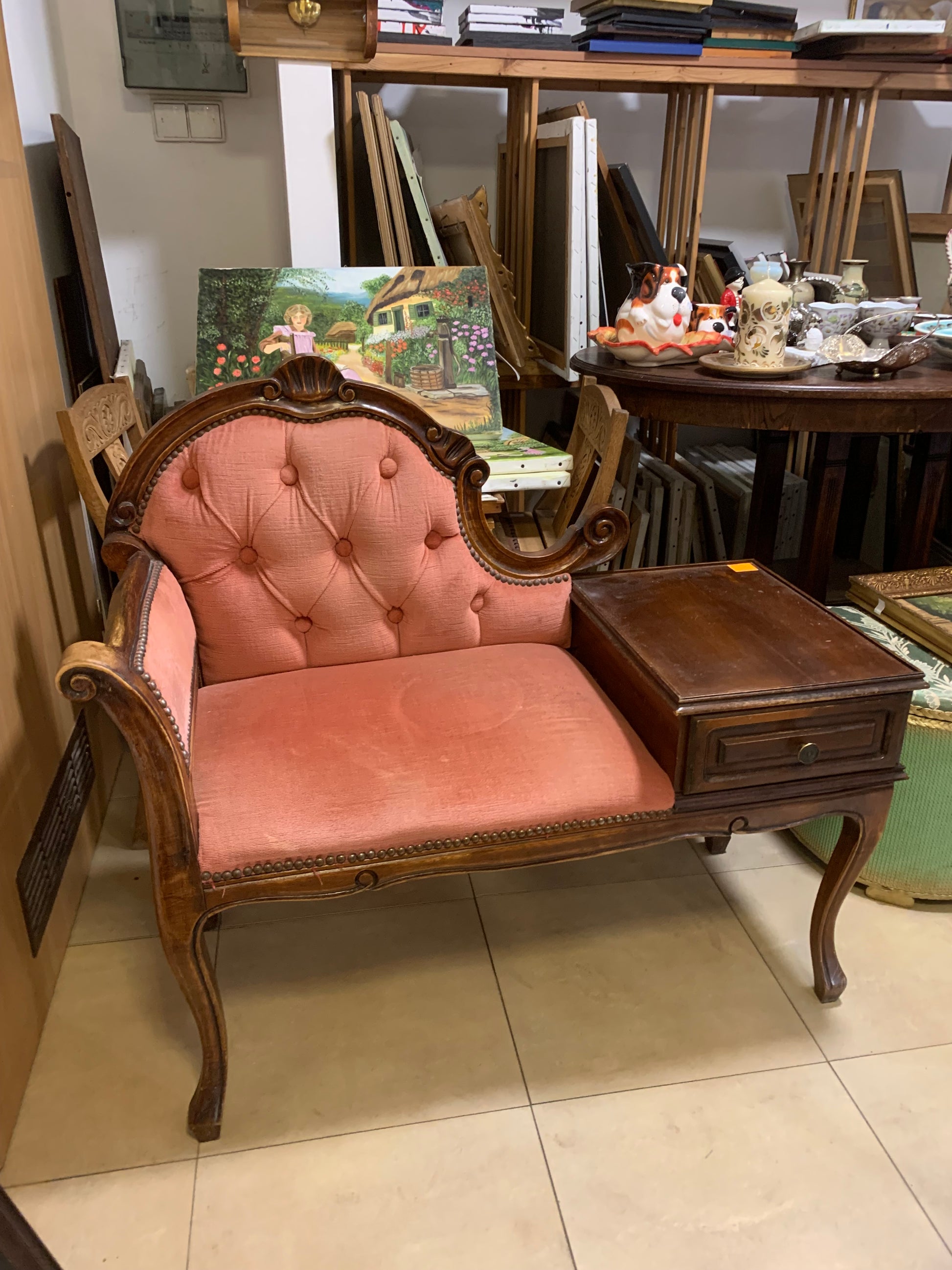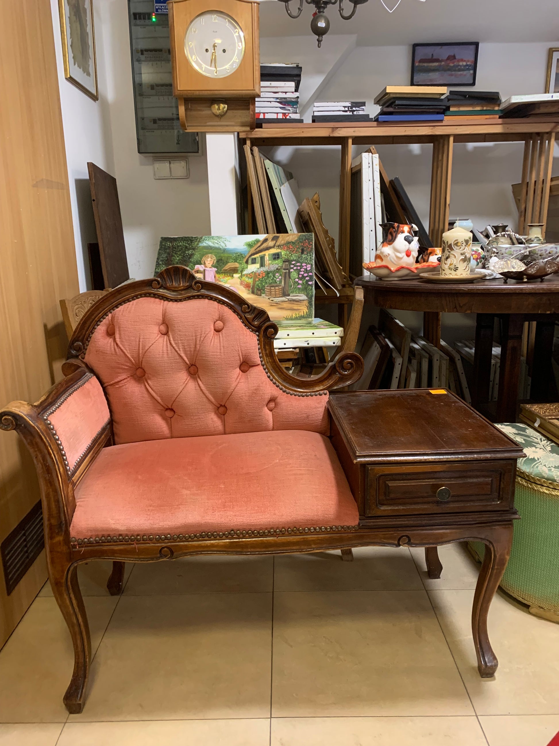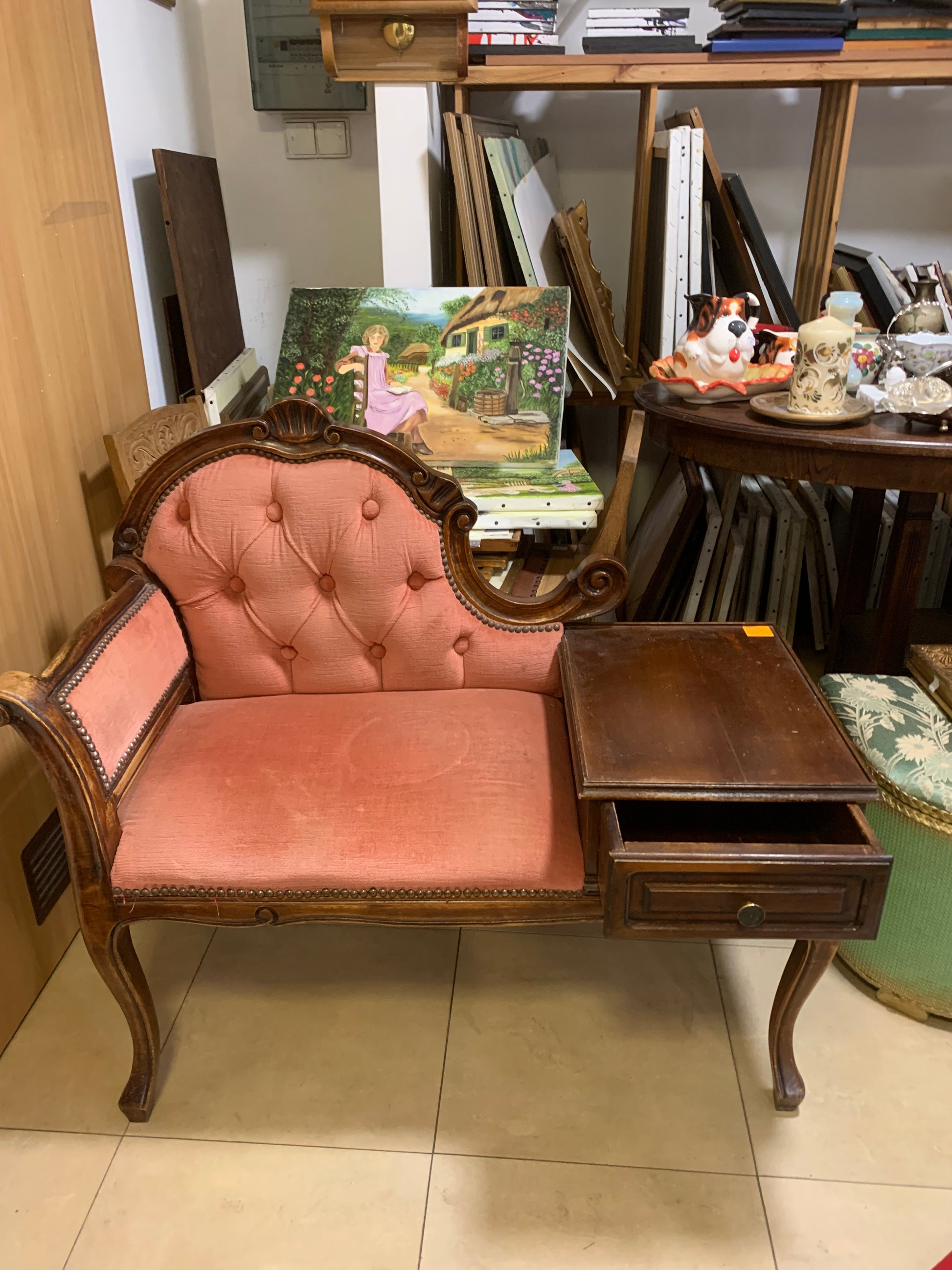 Siedzisko do przedpokoju, telefoniera w stylu Ludwik. Siedzisko tapicerowane, pikowane w kolorze ciemnoróżowym. Szafka z szufladką w kolorze ciemnego orzechu. Stan dobry.