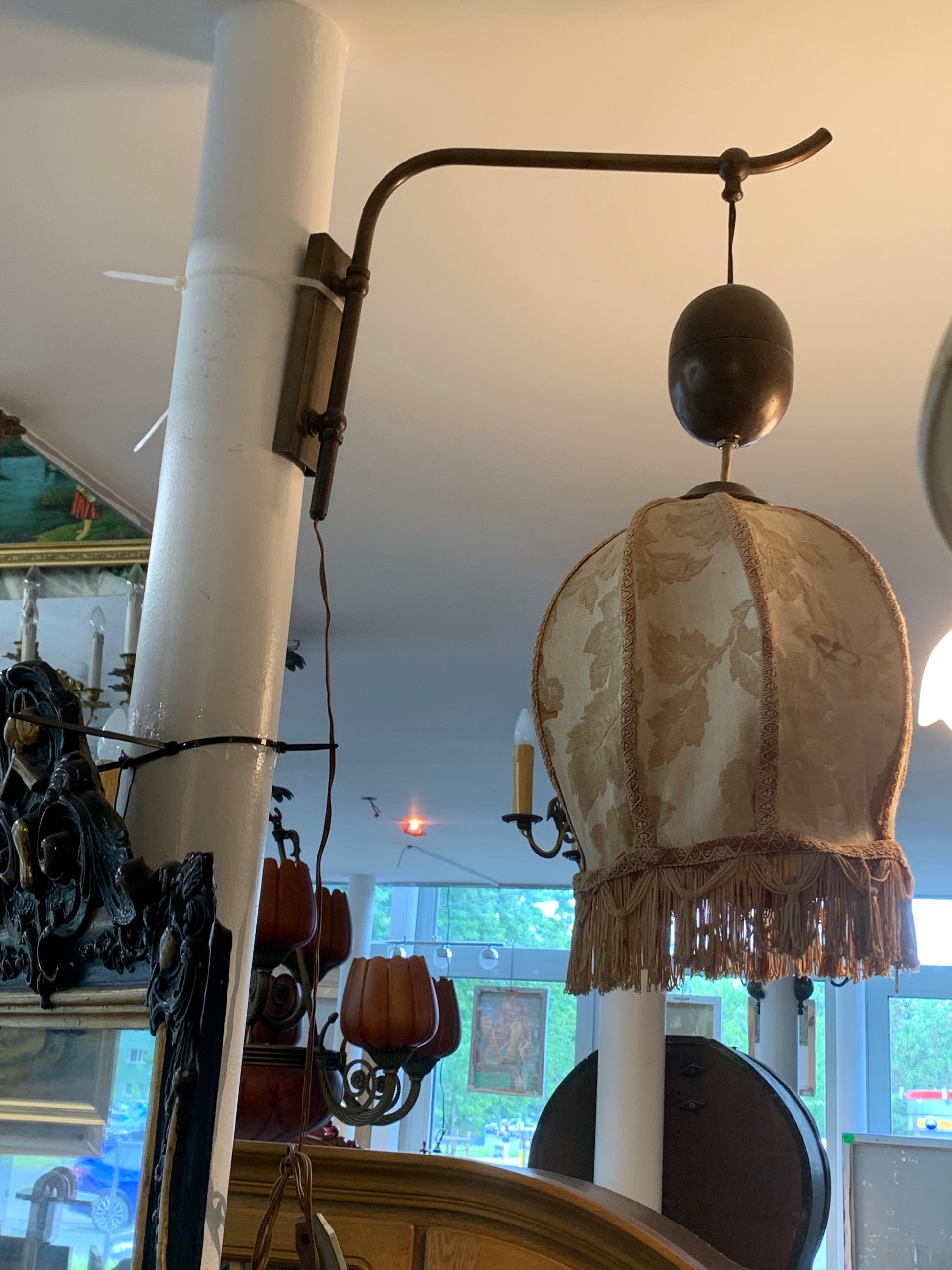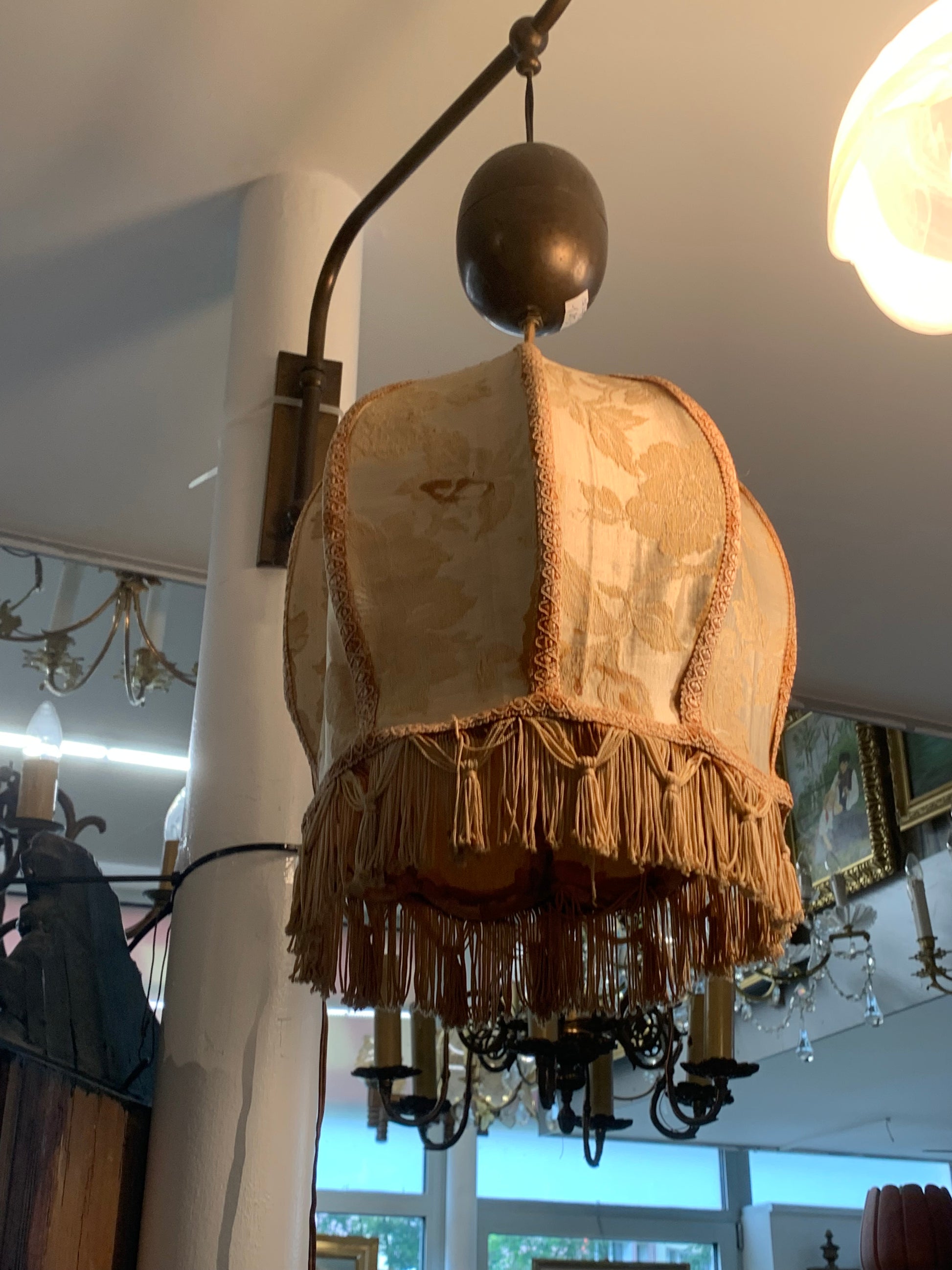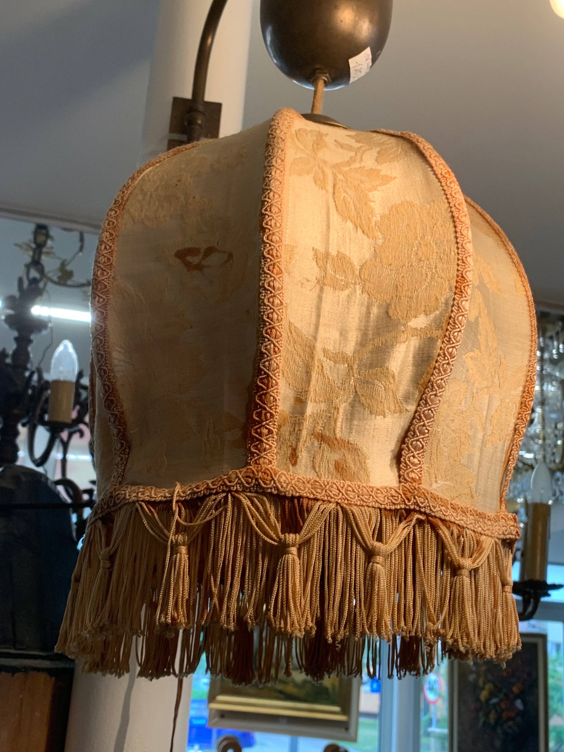 Stary, oryginalny kinkiet, lampa z abażurem z frędzlami , mosiądz. Przedwojenna lampa UNIKAT.