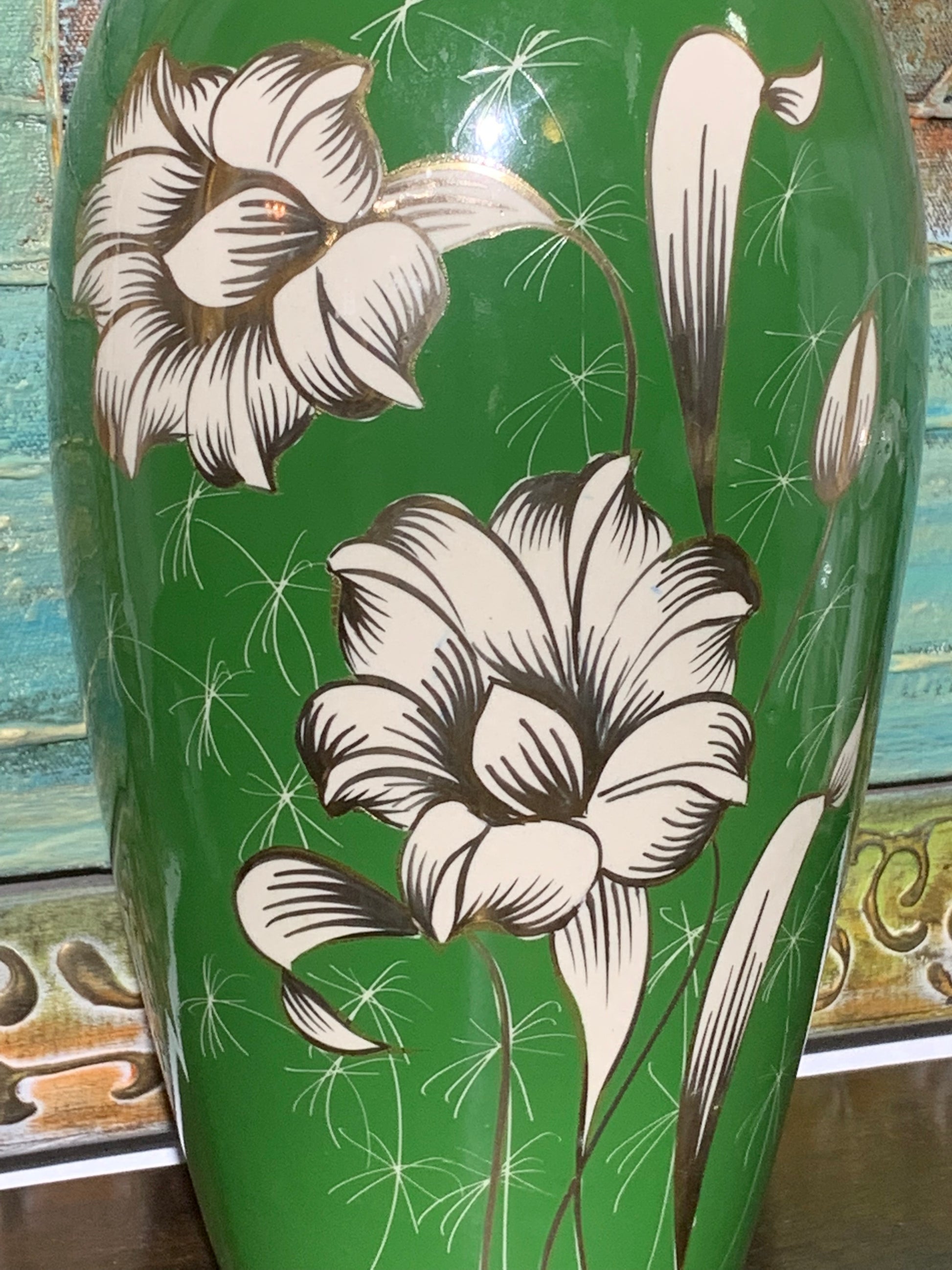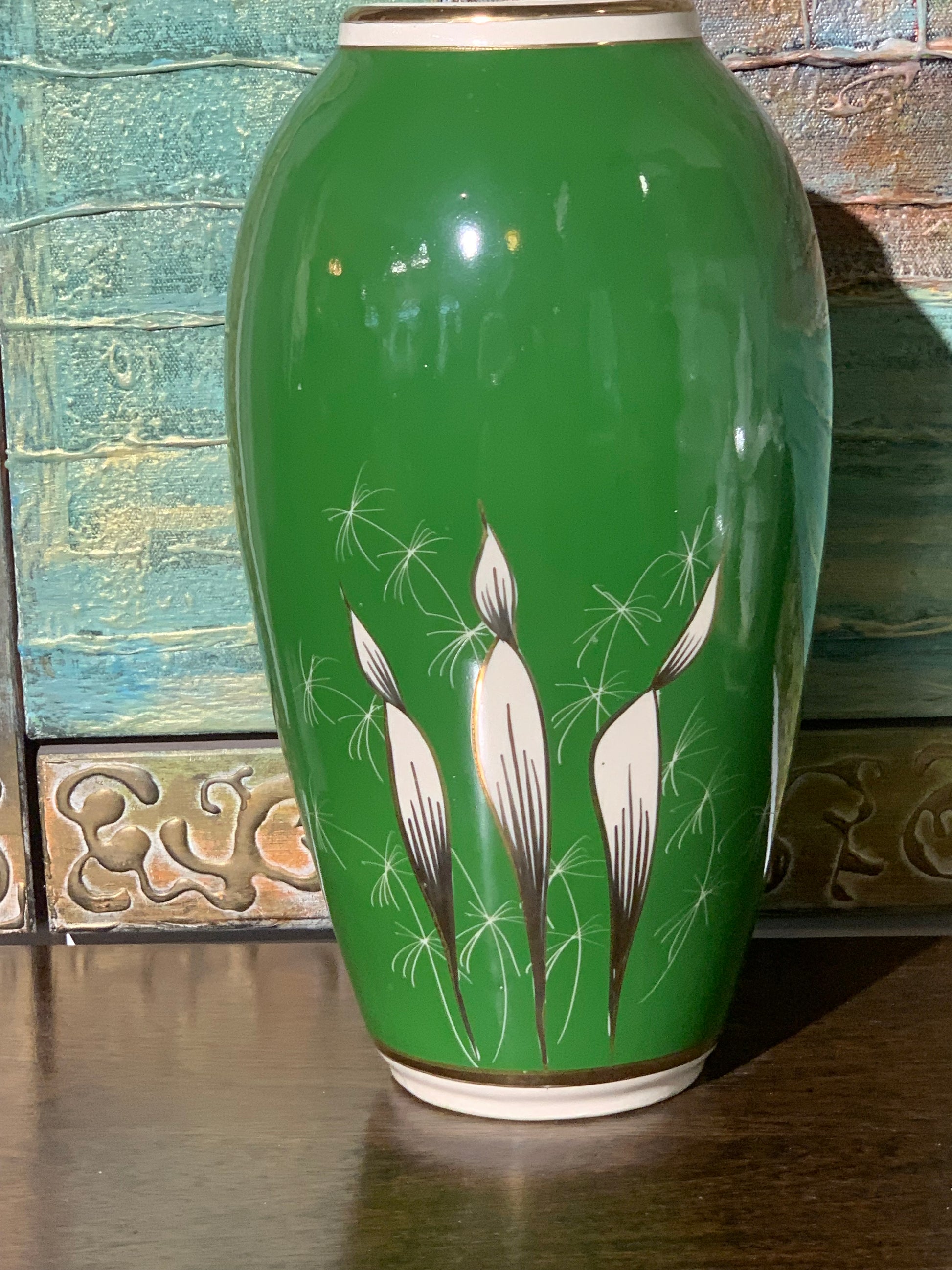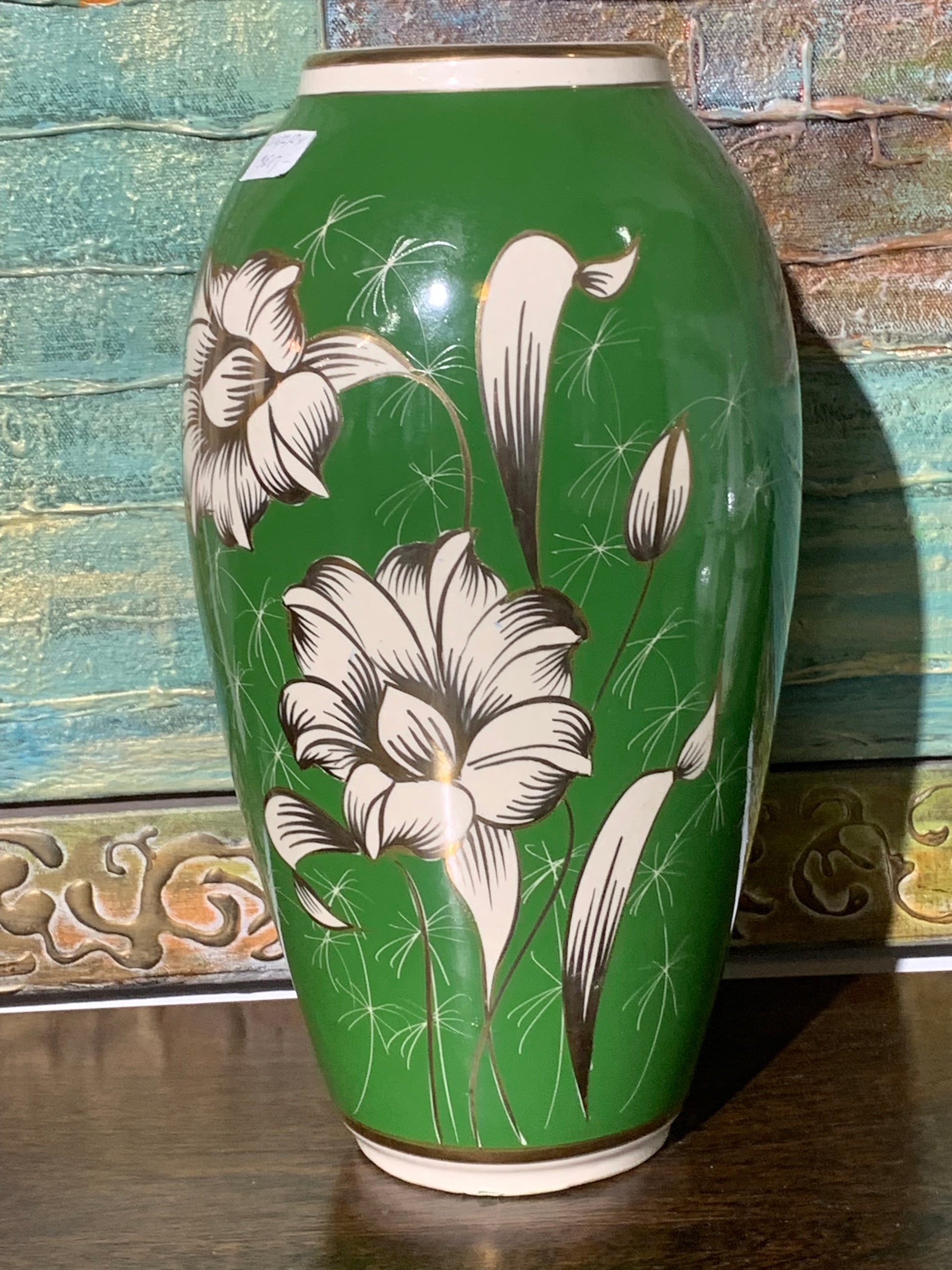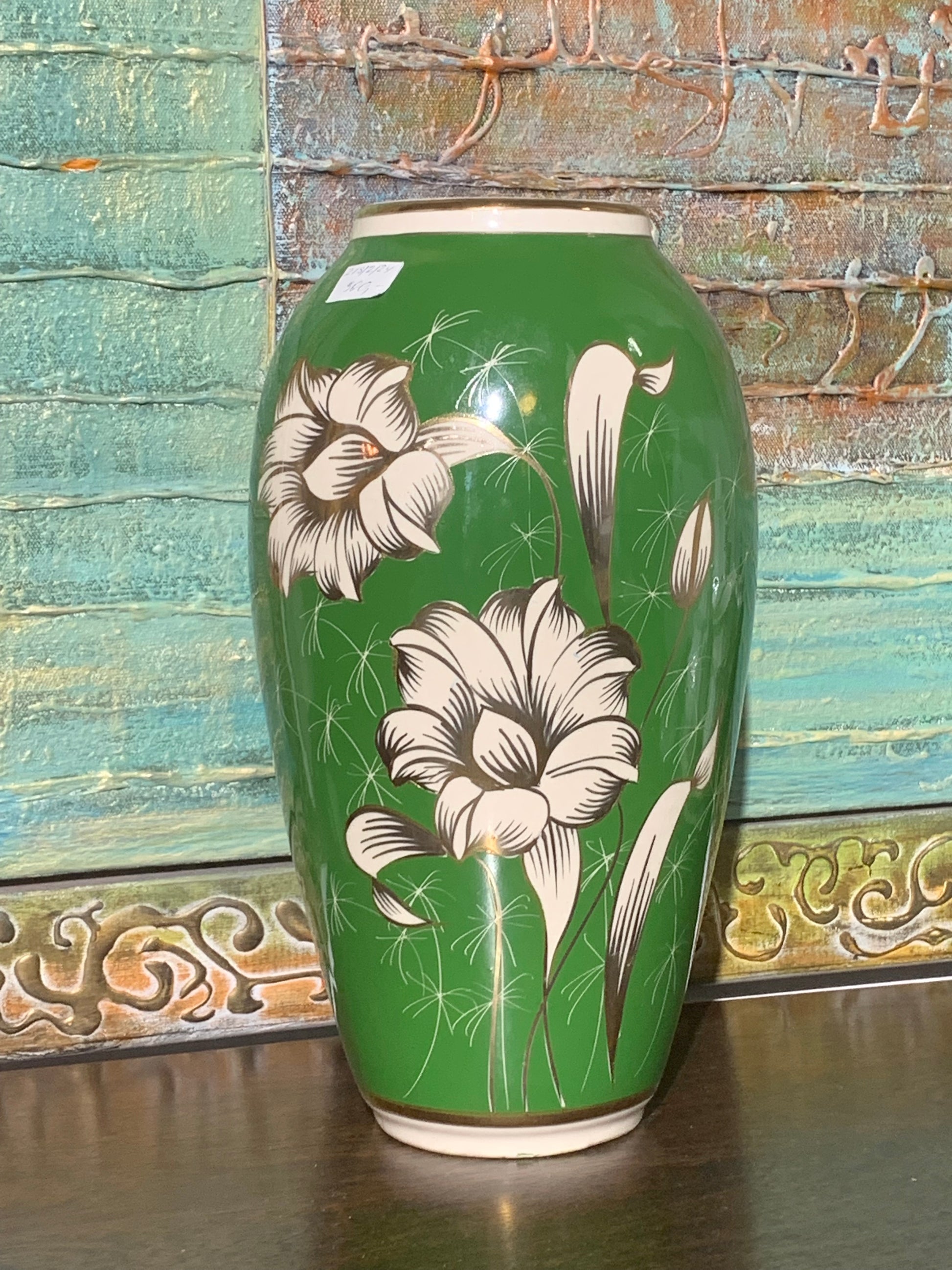 Stary wazon Chodzież, wykonany z porcelitu, w kolorze zielonym, zdobiony motywem kwiatowym, cykl Kwiaty Polskie. Malowany dwustronnie w bogatej odsłonie - złocenia w malaturze. Stan: bardzo dobry.