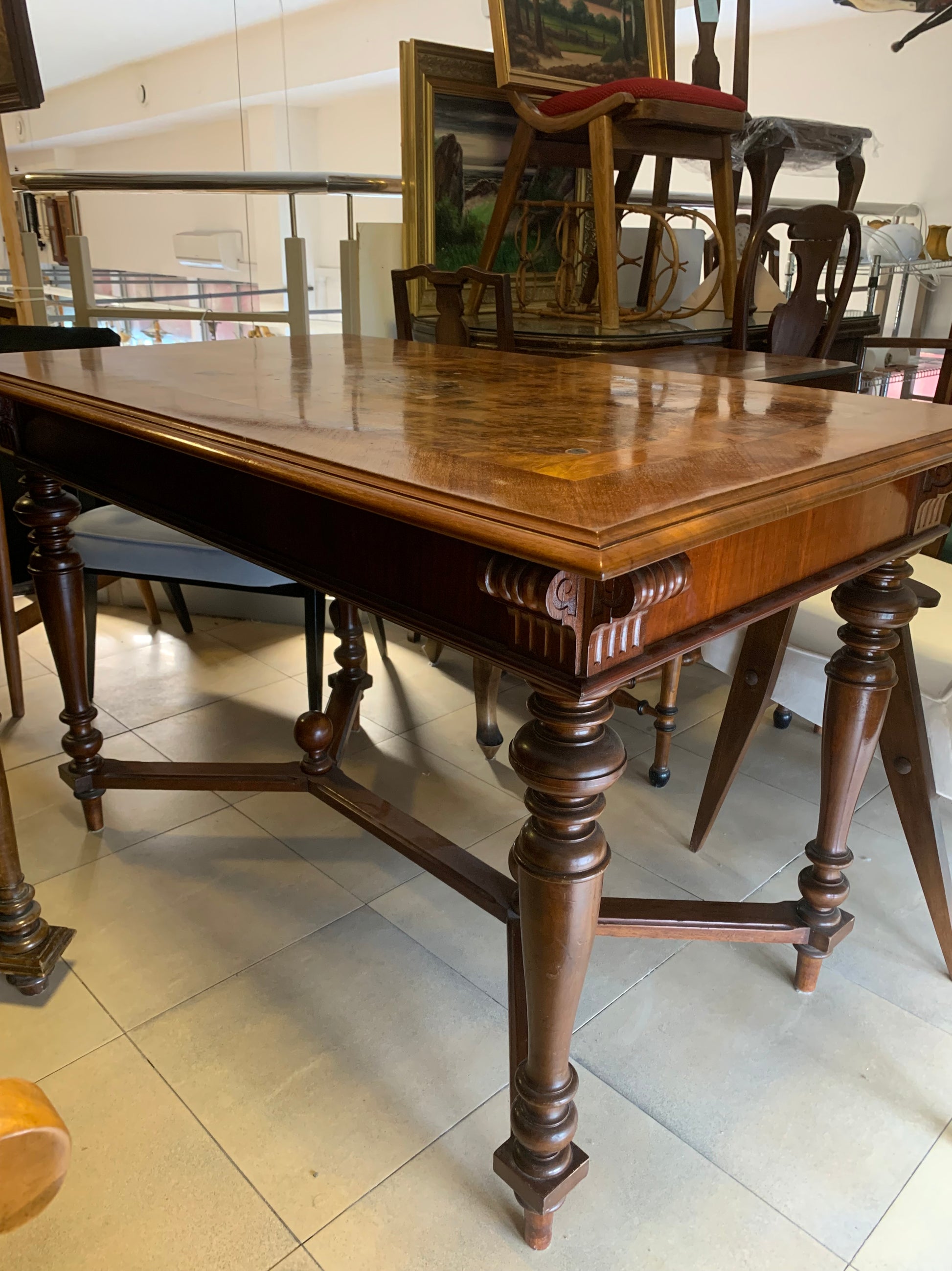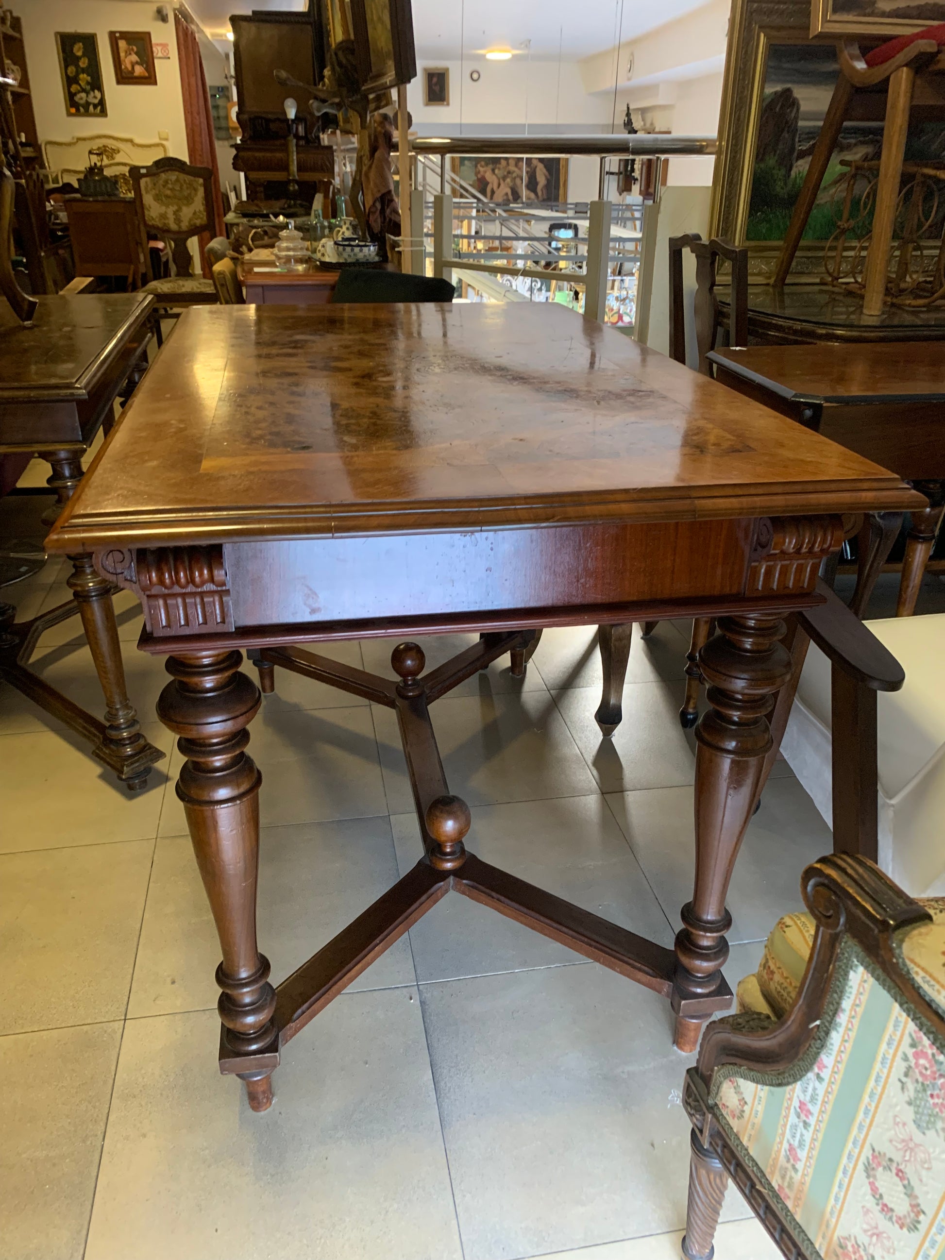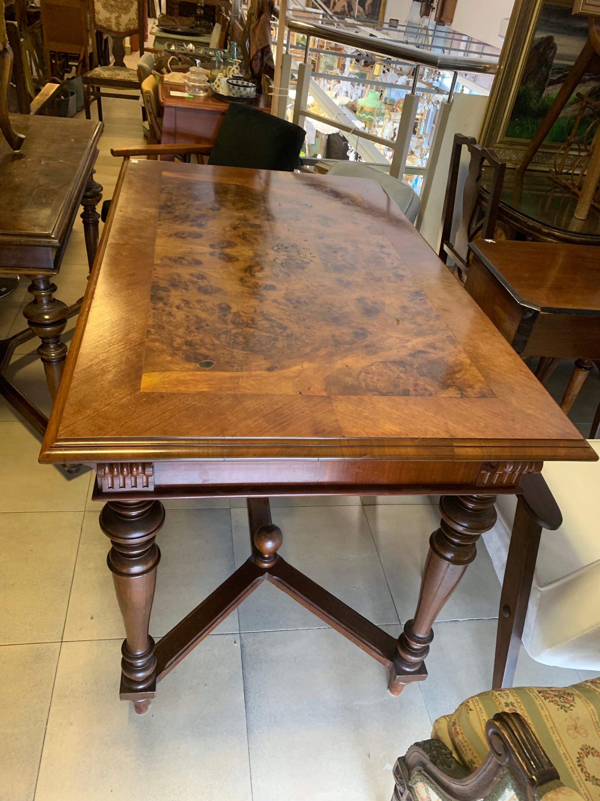 Stół zabytkowy, prostokątny, orzechowy. Nogi stołu toczone, blat - czeczot orzechowy.